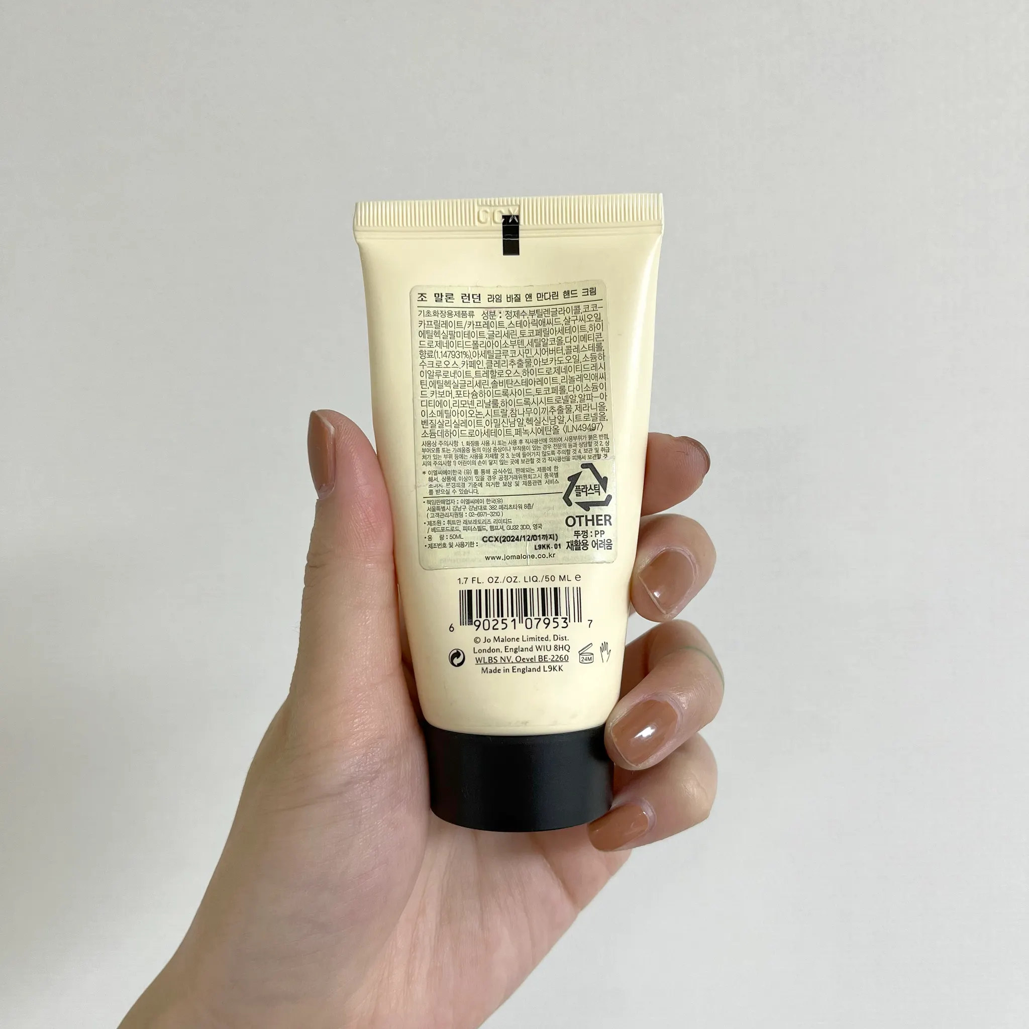 이것도 역시나 뒷면에는 성분 표기가 되어있다. 바이레도보다 20ml 많지만 그렇게 크지 않다. 한 손에 쏙 들어오는 사이즈. 마찬가지로 가지고 다니면서 바르기 편한 제품이다. 밖에 나갈 때 가장 많이 들고 다니는 핸드크림이 바로 이 조말론 핸드크림. 쓰고있는 조말론 향수와 레이어링해서 사용하는 편인데 확실히 코롱보다 지속력도 더 긴 것 같다. 밖에서 이 핸드크림 바를 때마다 친구들이 하나같이 냄새 너무 좋다고ㅎㅎㅎㅎㅎ 그럴 때마다 한 번씩 짜주는ㅎㅎㅎㅎㅎ 뿌듯