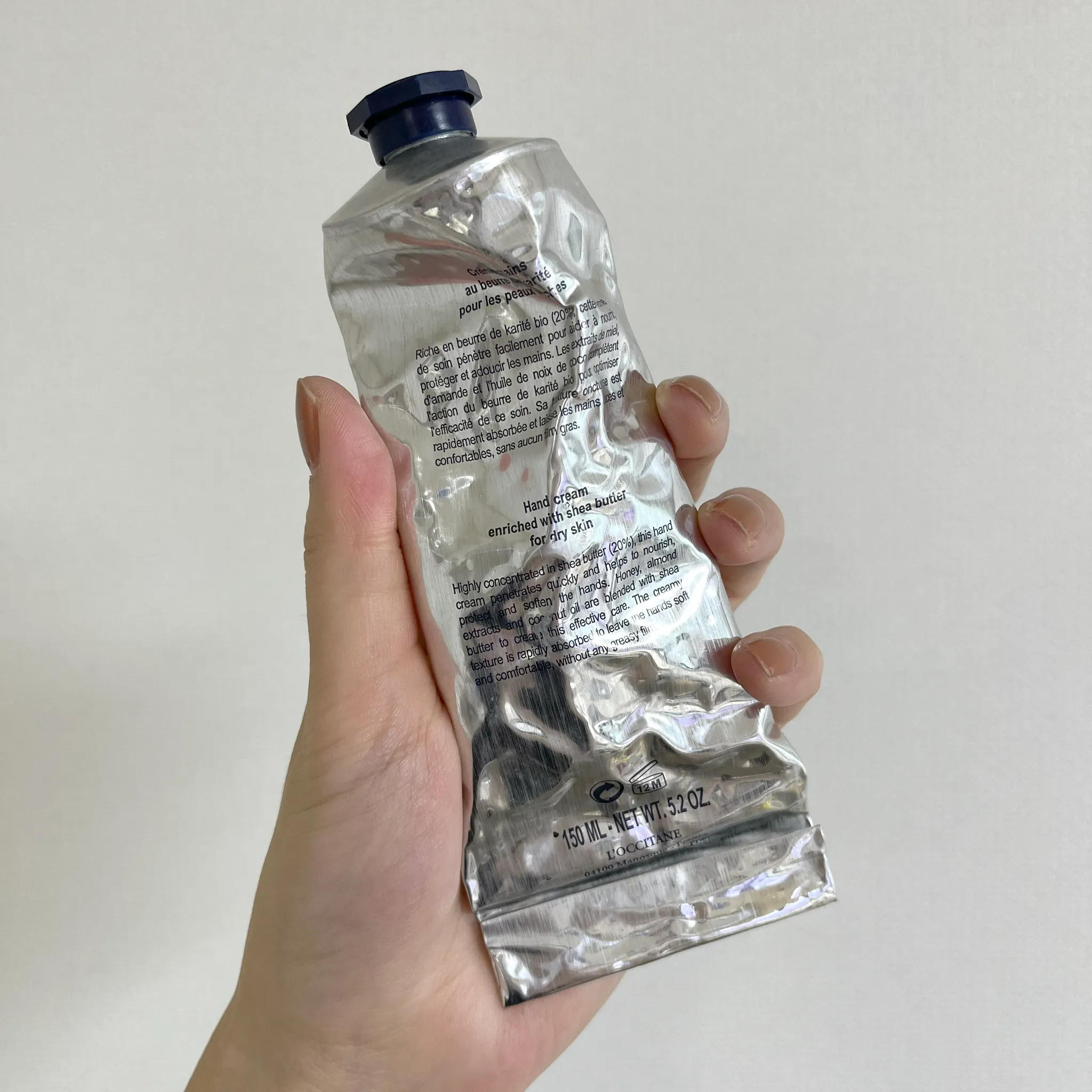 30ml를 사서 들고다니다가 이렇게 자주, 이렇게 많이 쓰는데 큰 거 하나 사서 집에 두고두고 쓰자 싶어서 면세점에서 구매했었다. 150ml의 어마어마한 용량을 자랑하는지라 써도써도 닳지가 않는 느낌ㅎㅎㅎㅎㅎㅎㅎ 그래도 꾸준히 사용하다보니 닳고는 있어서 아래쪽 저렇게 야무지게 접어가면서 쓰고있는 중ㅎㅎㅎㅎ 건성 피부라 겨울에 손이 부르트는 동생도 록시땅 시어버터 핸드크림은 꾸준히 사용하고 있다.