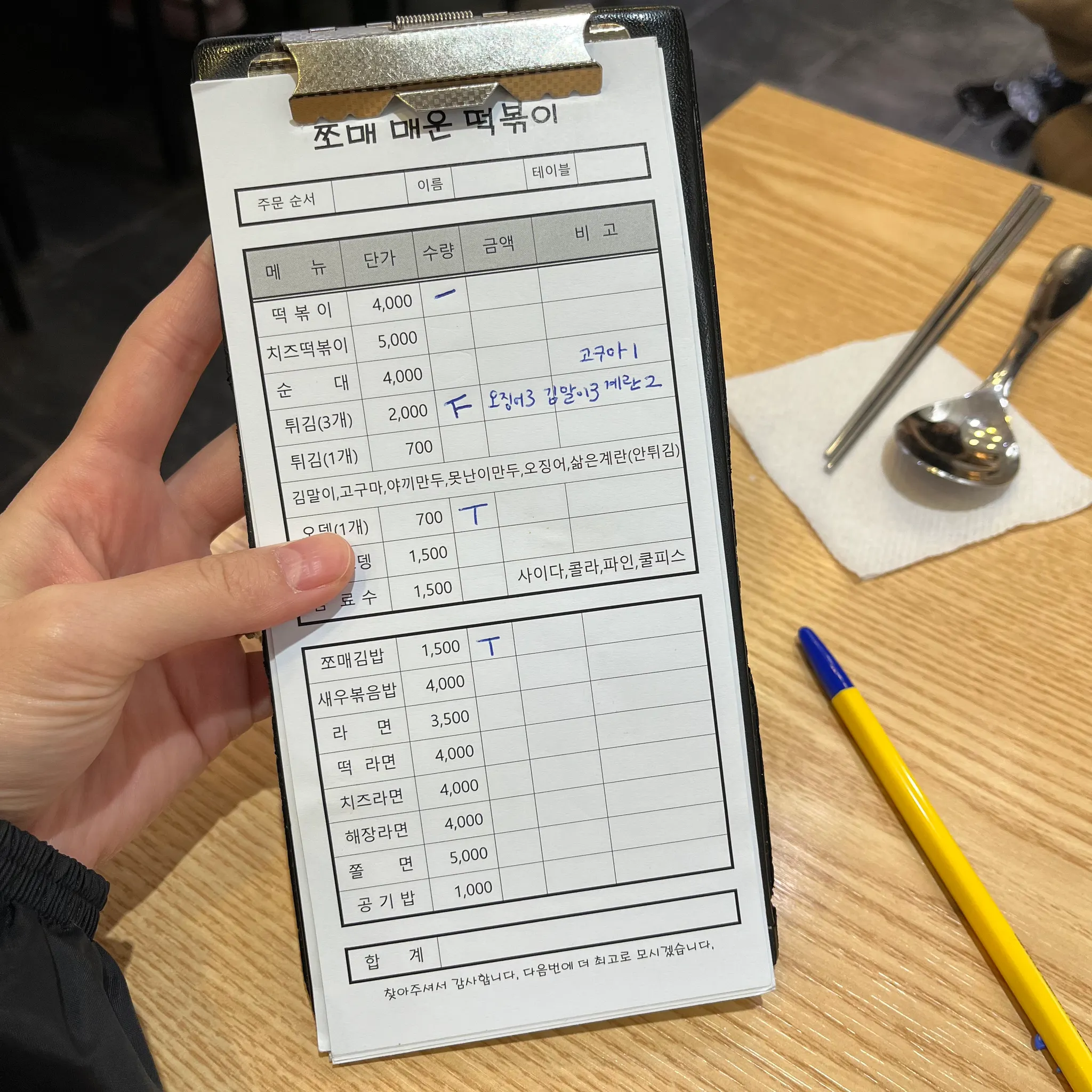 전 날 피순대를 먹은터라 순대는 주문하지 않기로 한 우리. 일단 먹고싶은 것 먼저 싹 작성하고,