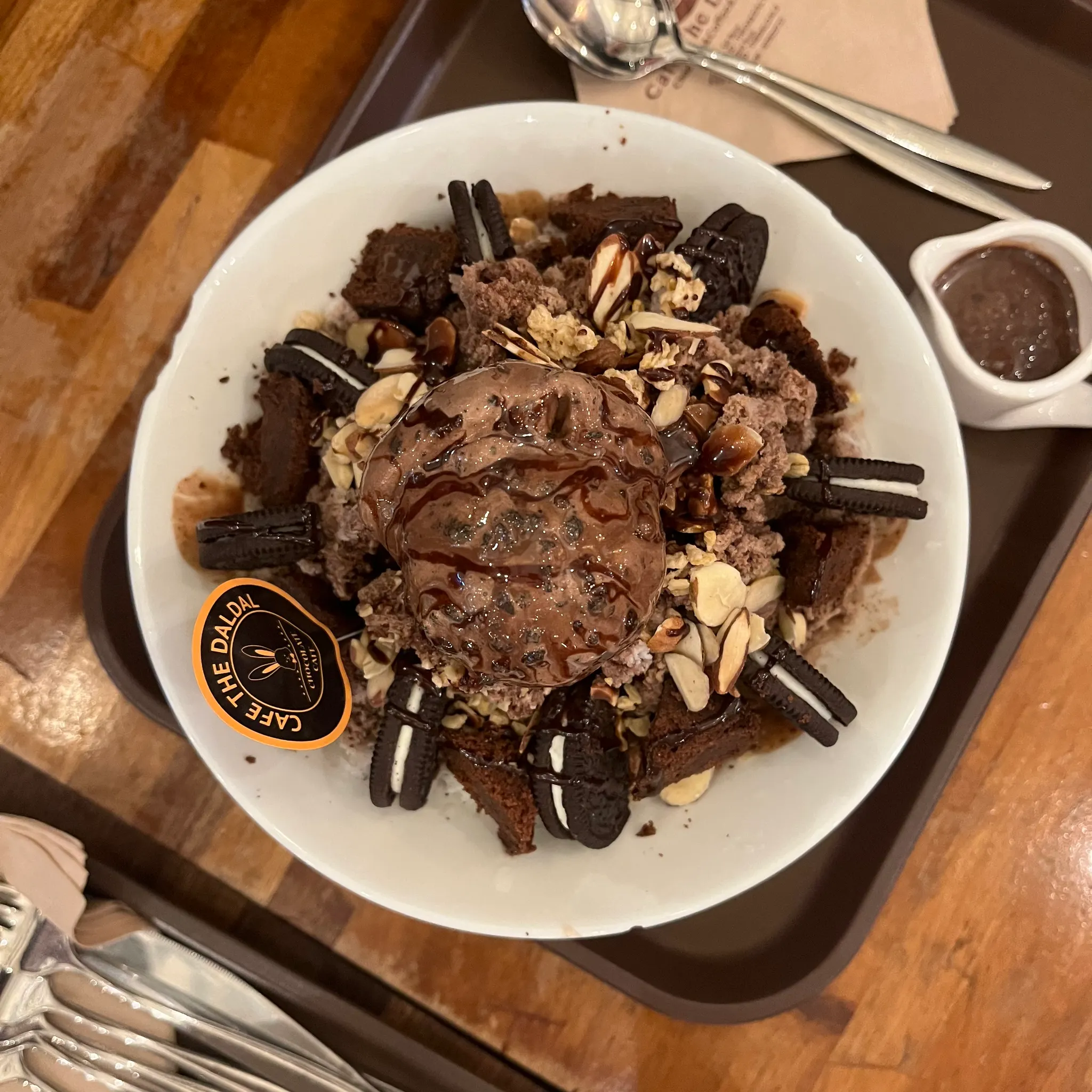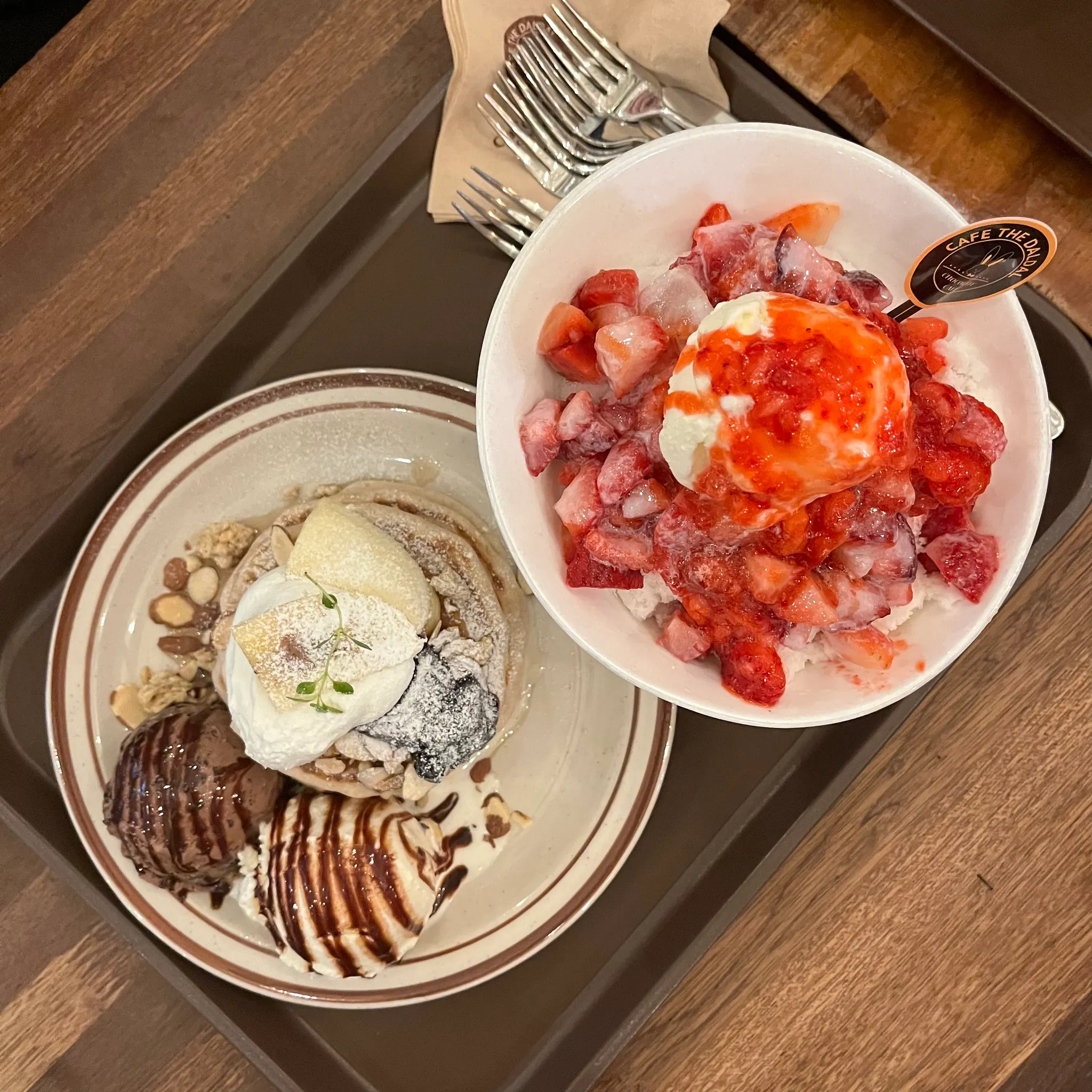 그리고 2차로 간 카페가 정말 찐이었다,,! 이 날의 주인공이라고 해도 과언이 아님. 우리는 팬케이크와 딸기빙수, 초코빙수를 주문했는데, 정말,, 아니,, 하나같이 다 맛있어,,