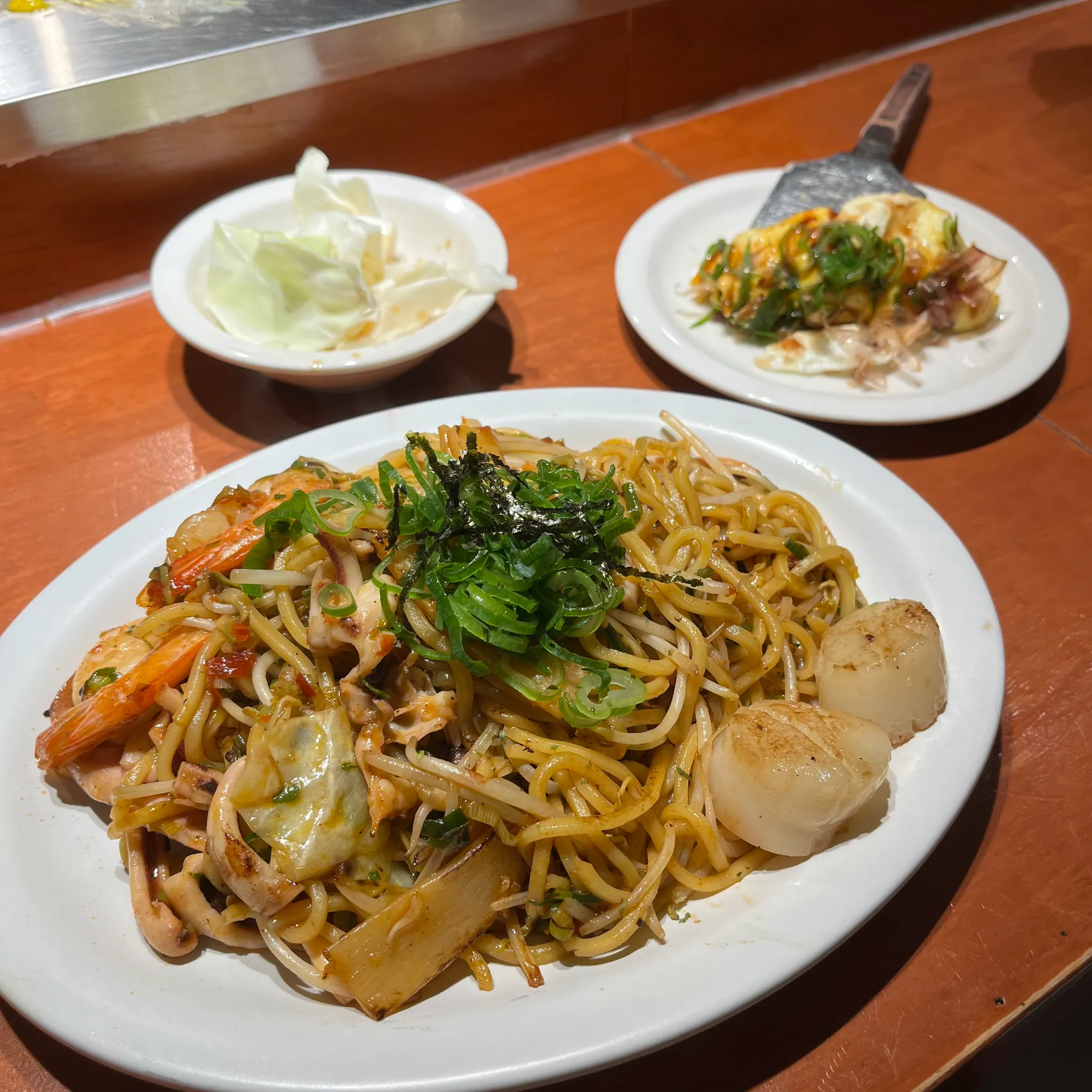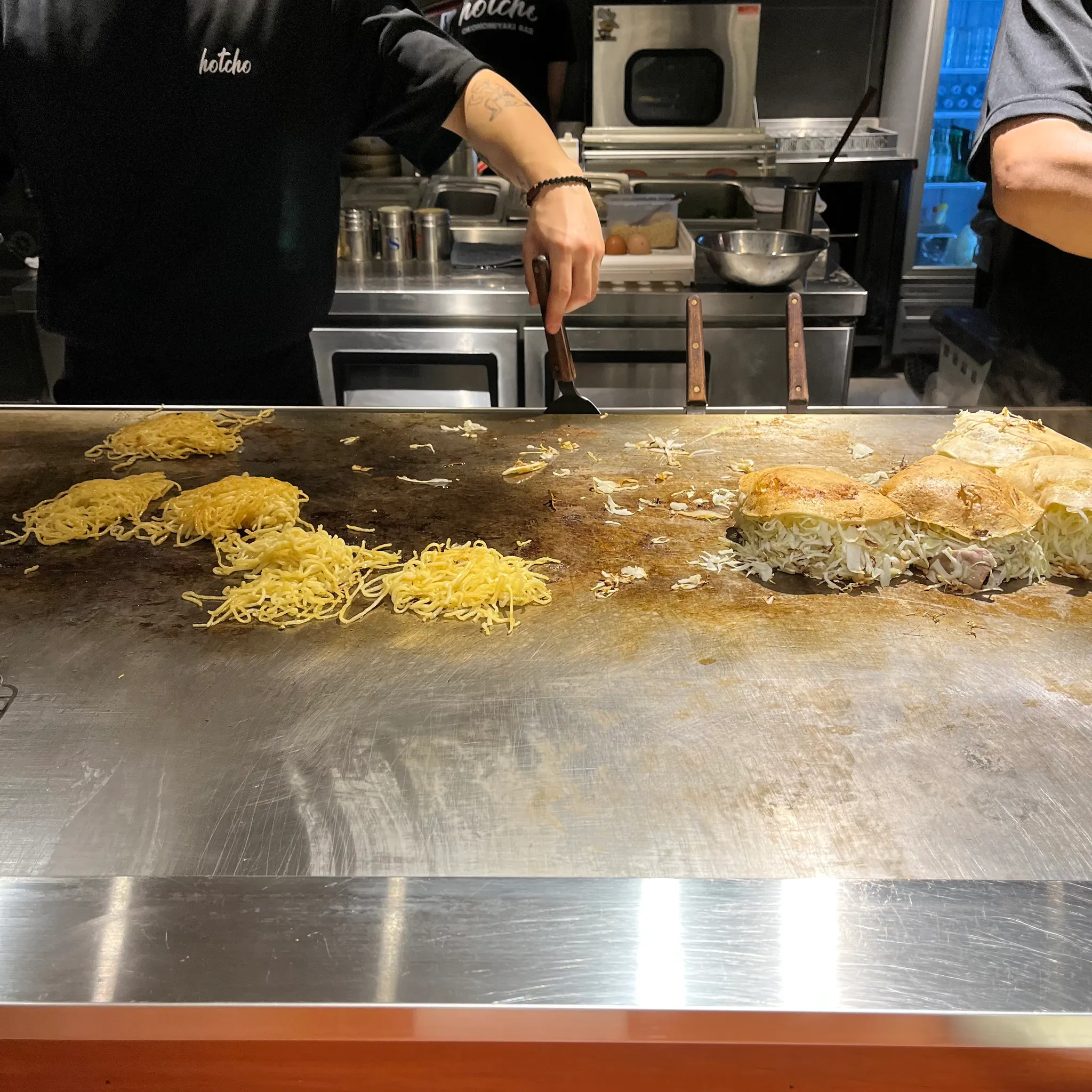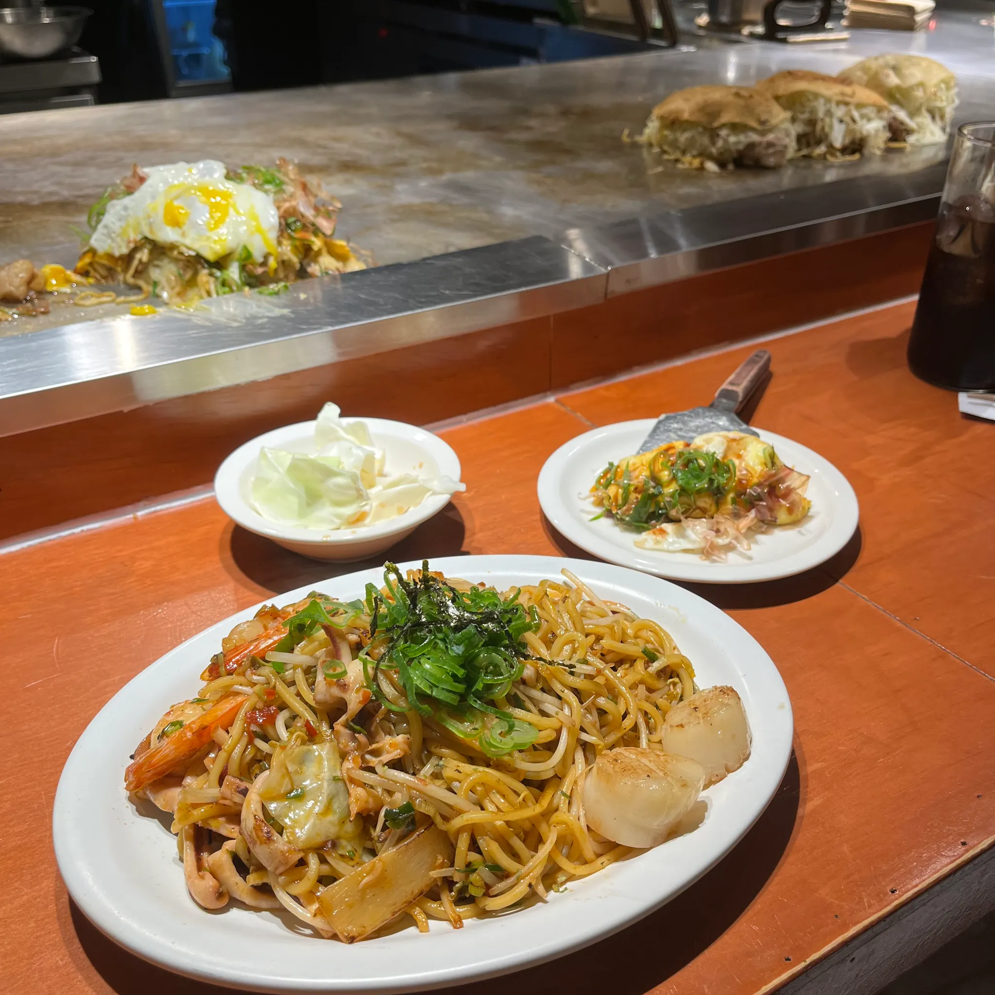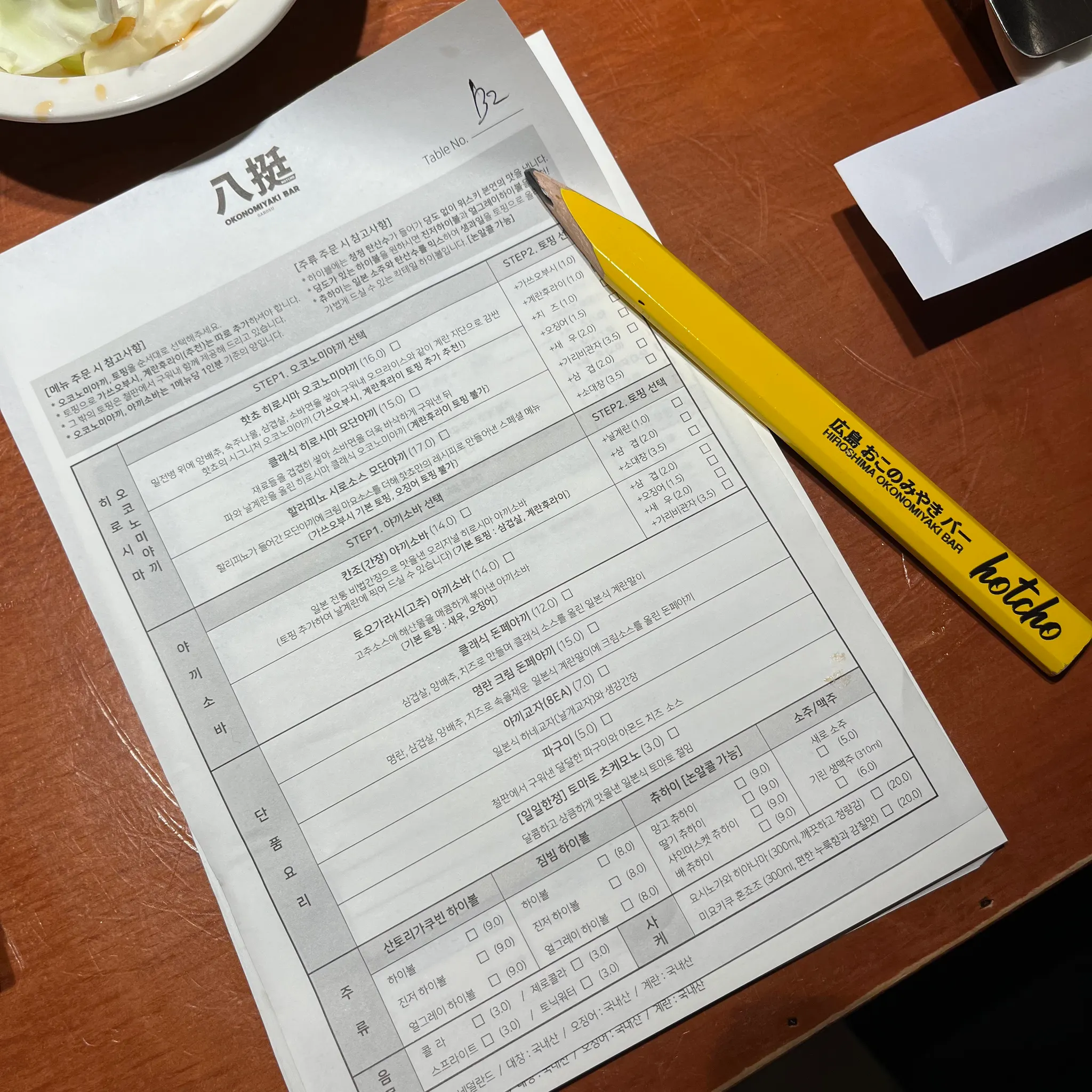 오코노미야끼 종류와 토핑을 선택하면 된다. 야끼소바도 마찬가지! 우리는 시그니처 메뉴인 핫쵸 히로시마 오코노미야끼에 가쓰오부시, 계란후라이, 소대창 토핑을 추가했다. 그리고 야끼소바는 토오가라시 야끼소바에 가리비관자 추가! 둘 다 술을 즐기지는 않아 음료는 제로 콜라로