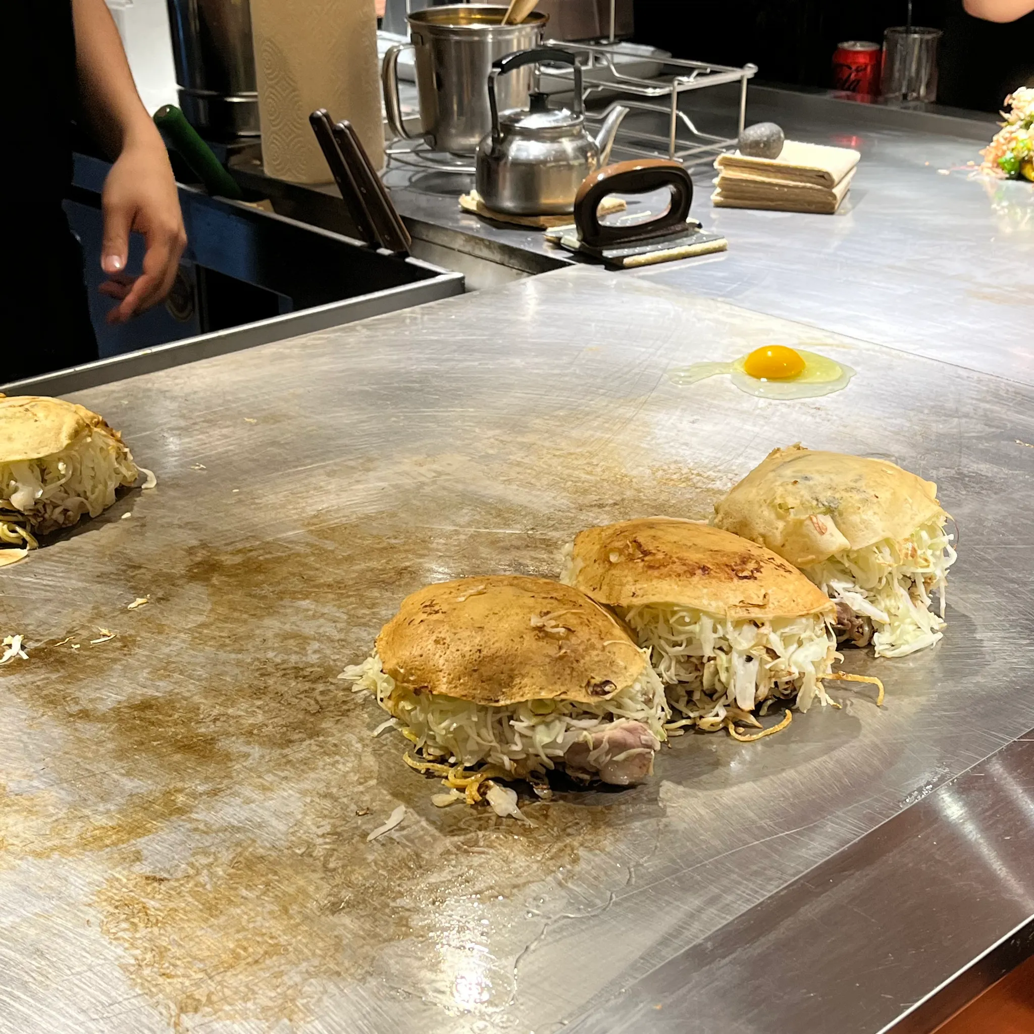 가쓰오부시랑 계란후라이는 각각 1,000원, 소대창은 3,500원의 추가 금액이 있다. 밀전병 위에 양배추, 숙주나물, 삼겹살, 소바면을 쌓아 구워내 오므라이스와 같이 계란 지단으로 감싼 오코노미야끼라고 한다. 원래 알고 있던 판판한 모양과는 달리 둥글게 부피감 있는 모양! 아! 특이하게도 우리 앞쪽에 있는 철판이 곧 우리의 오코노미야끼 접시다. 완전 특이하고 신기했던 점!