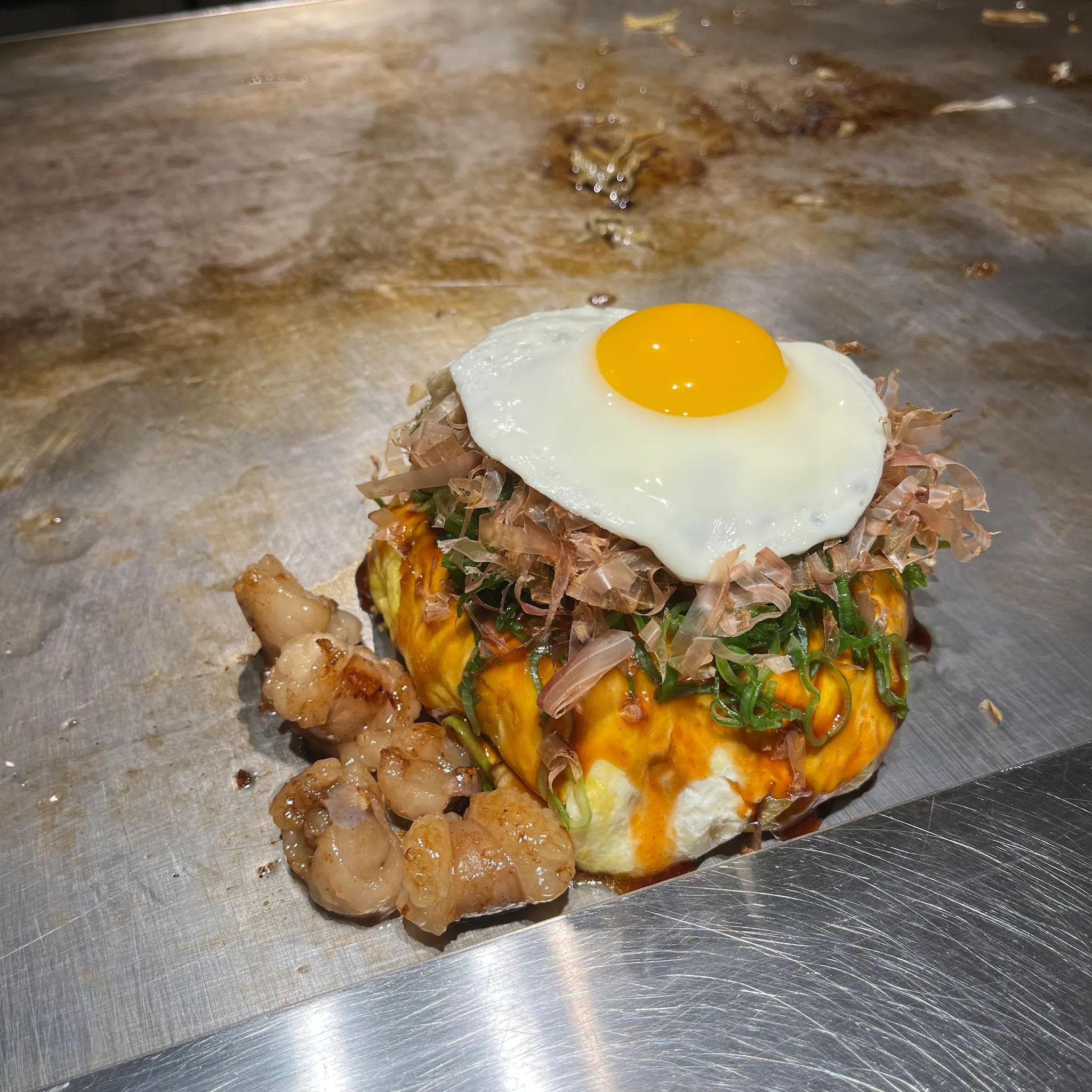줄지어 있는 오코노미야끼에 계란 옷을 입히고 데리야끼 소스와 가쓰오부시, 파, 계란 후라이를 올리면 완성이다. 자기 차례가 되어 하나씩 나가는 오코노미야끼들을 보고 있자니 귀여워서 웃음이 나왔다ㅎㅎㅎㅎㅎ
