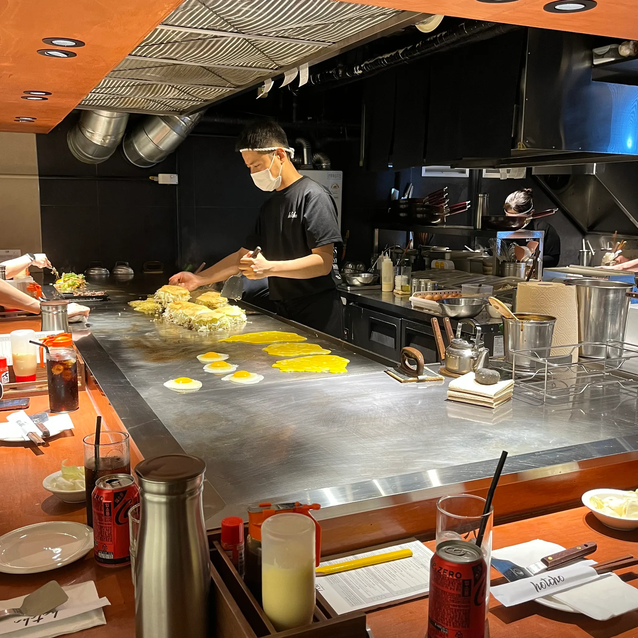 내심 바 테이블 석에 앉길 바랬는데 마침 제일 좋은 명당 당첨! 왜 여기가 명당이냐면, 오코노미야끼들이 만들어지는 걸 눈 앞에서 실시간으로 볼 수 있기 때문에! 먹는 재미에 보는 재미까지 둘 다 챙길 수 있었다.