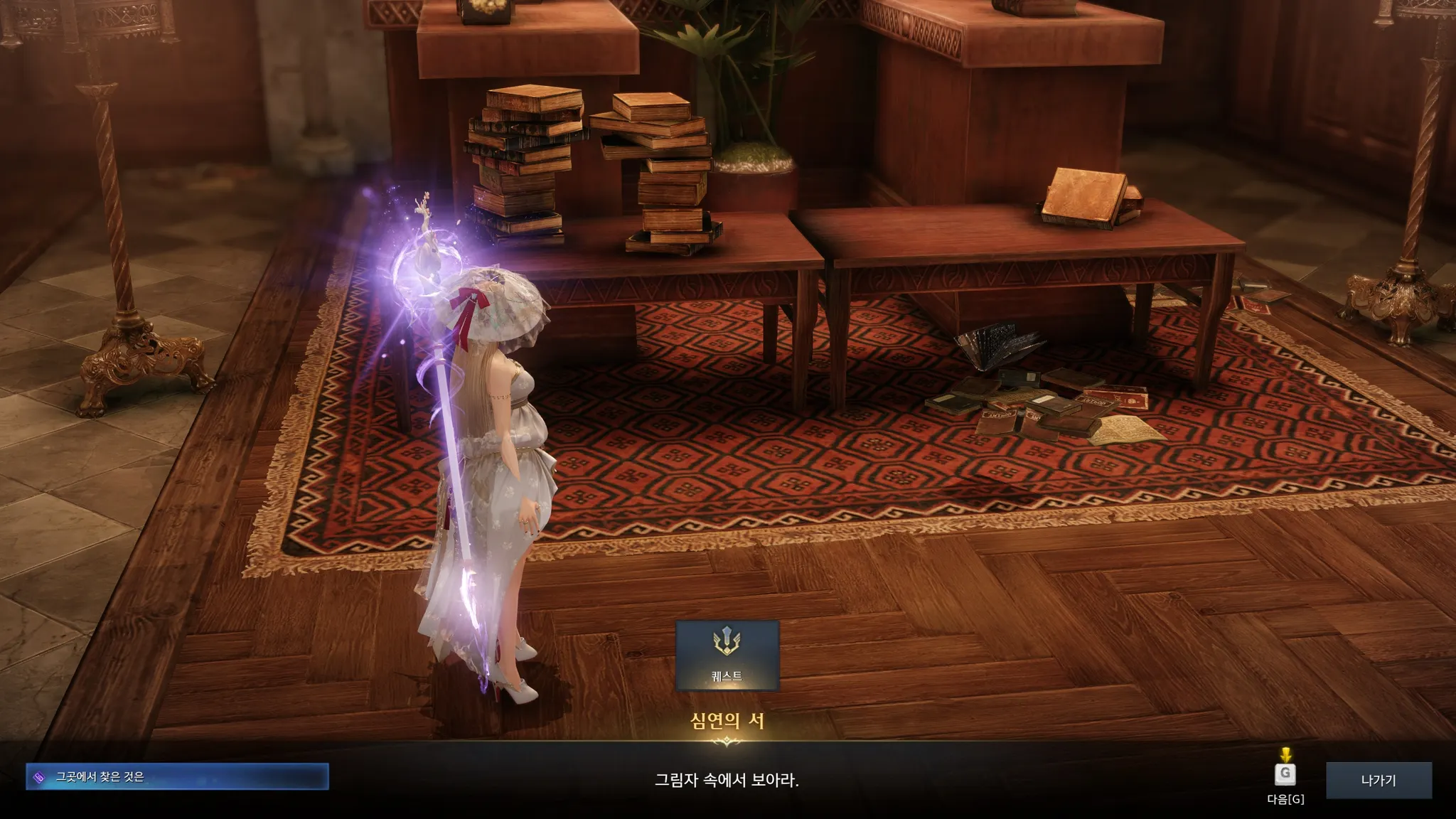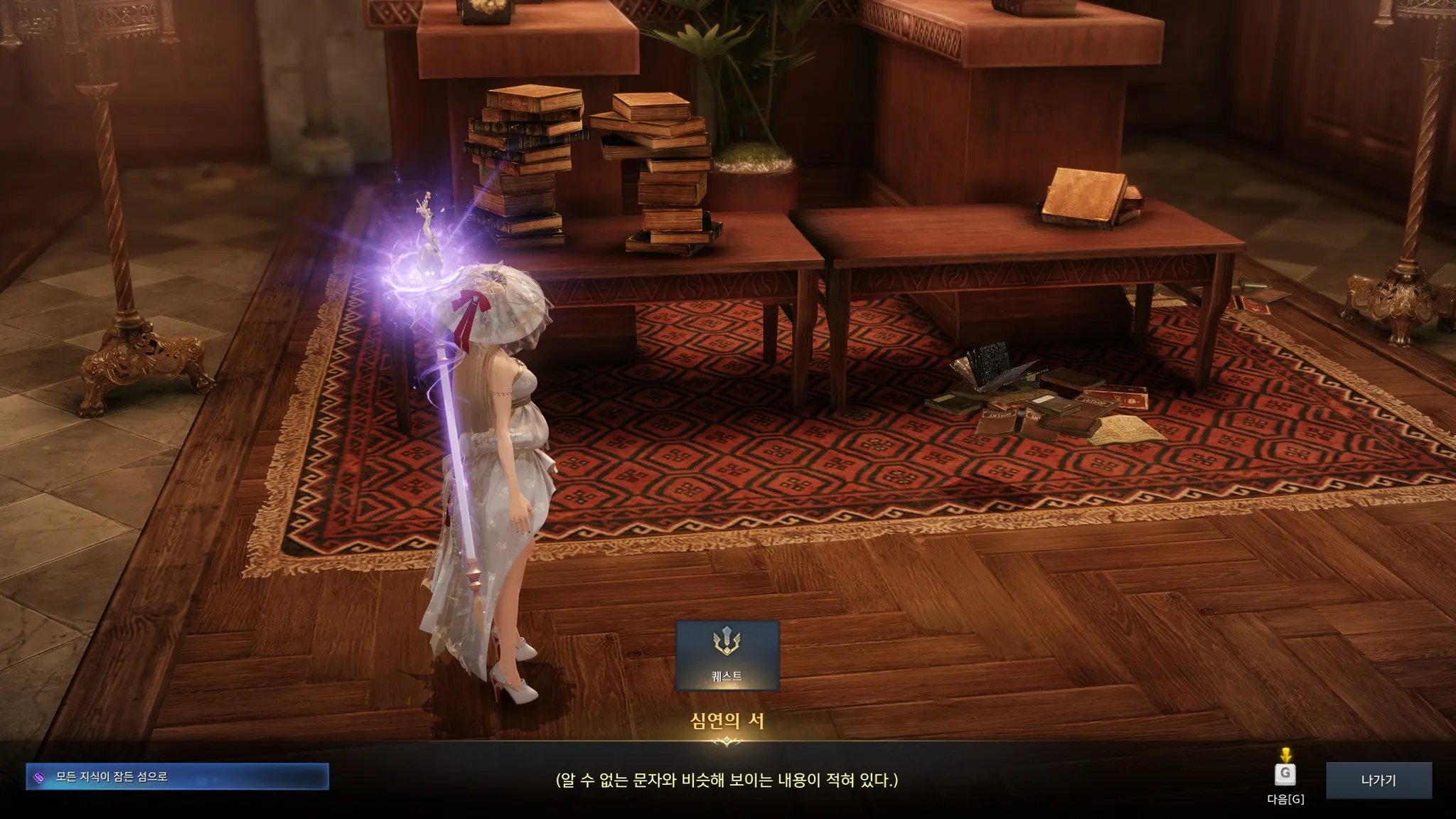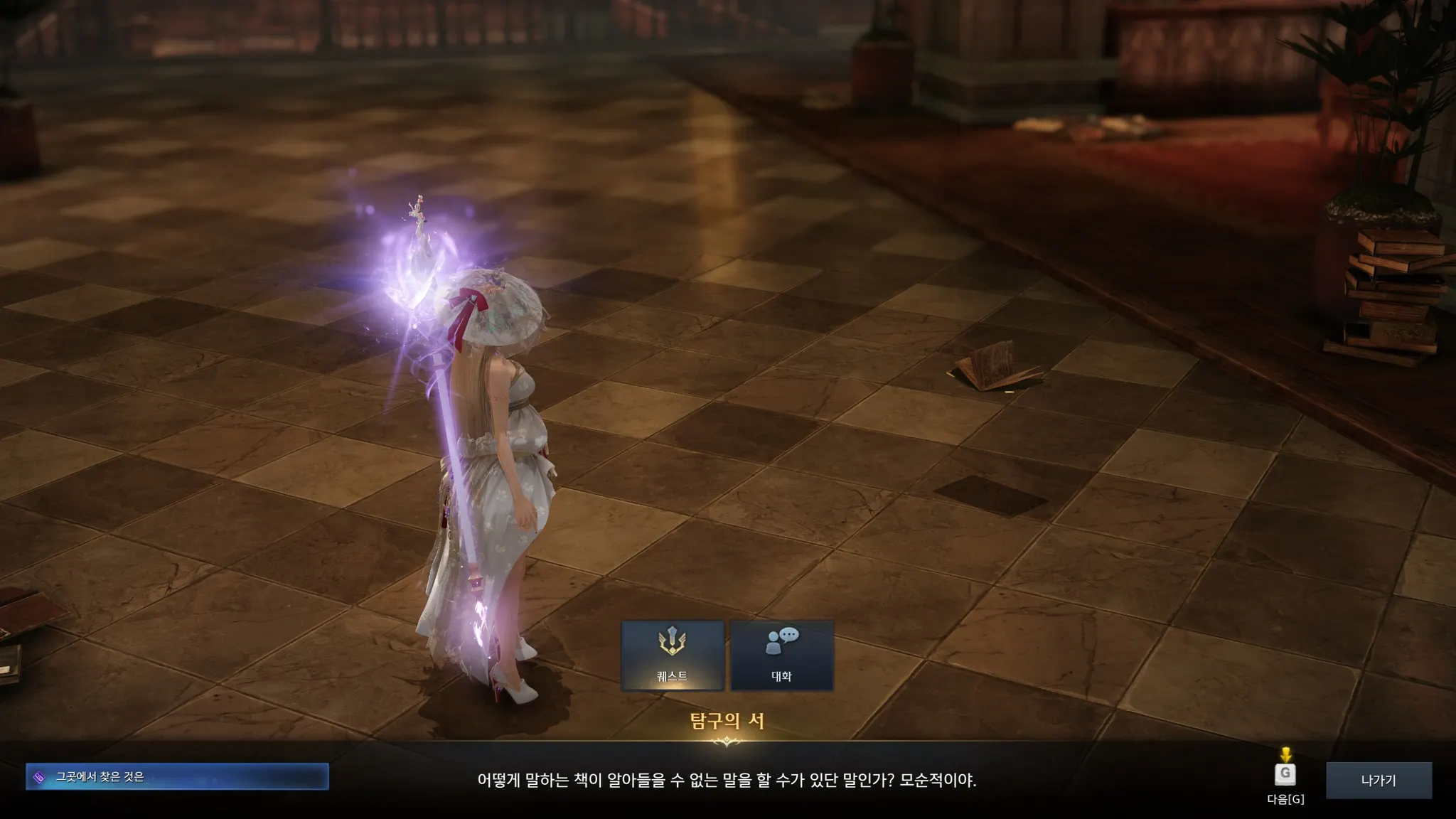 오 완전 정곡을 찌르는 탐구의 서. 말하는 책들은 무언가를 열망한다고 하는데 전할 수가 없으니 원.. 쯧. 탐구의 서가 준 힌트대로 다시 가서 말을 걸어보았더니,