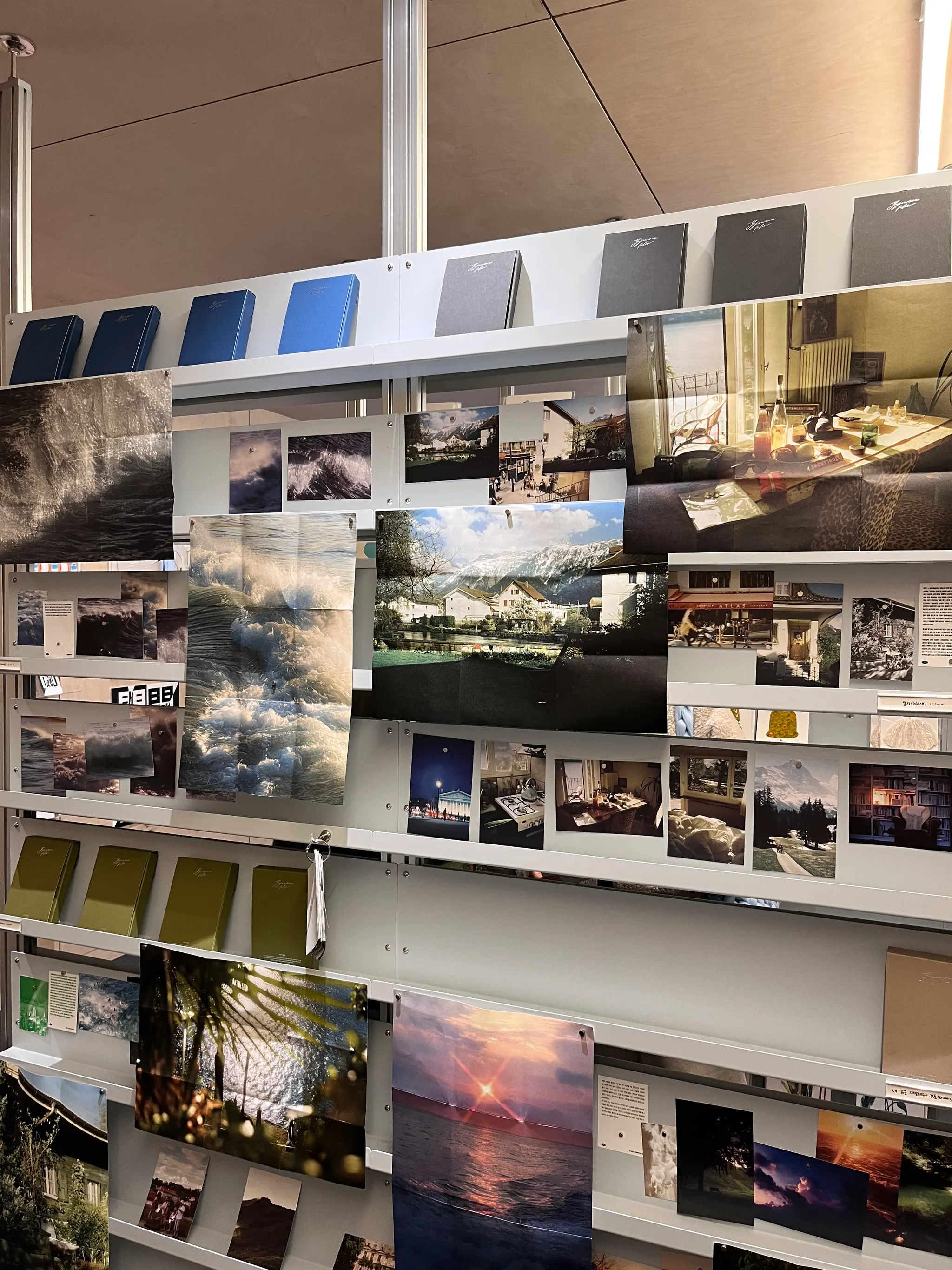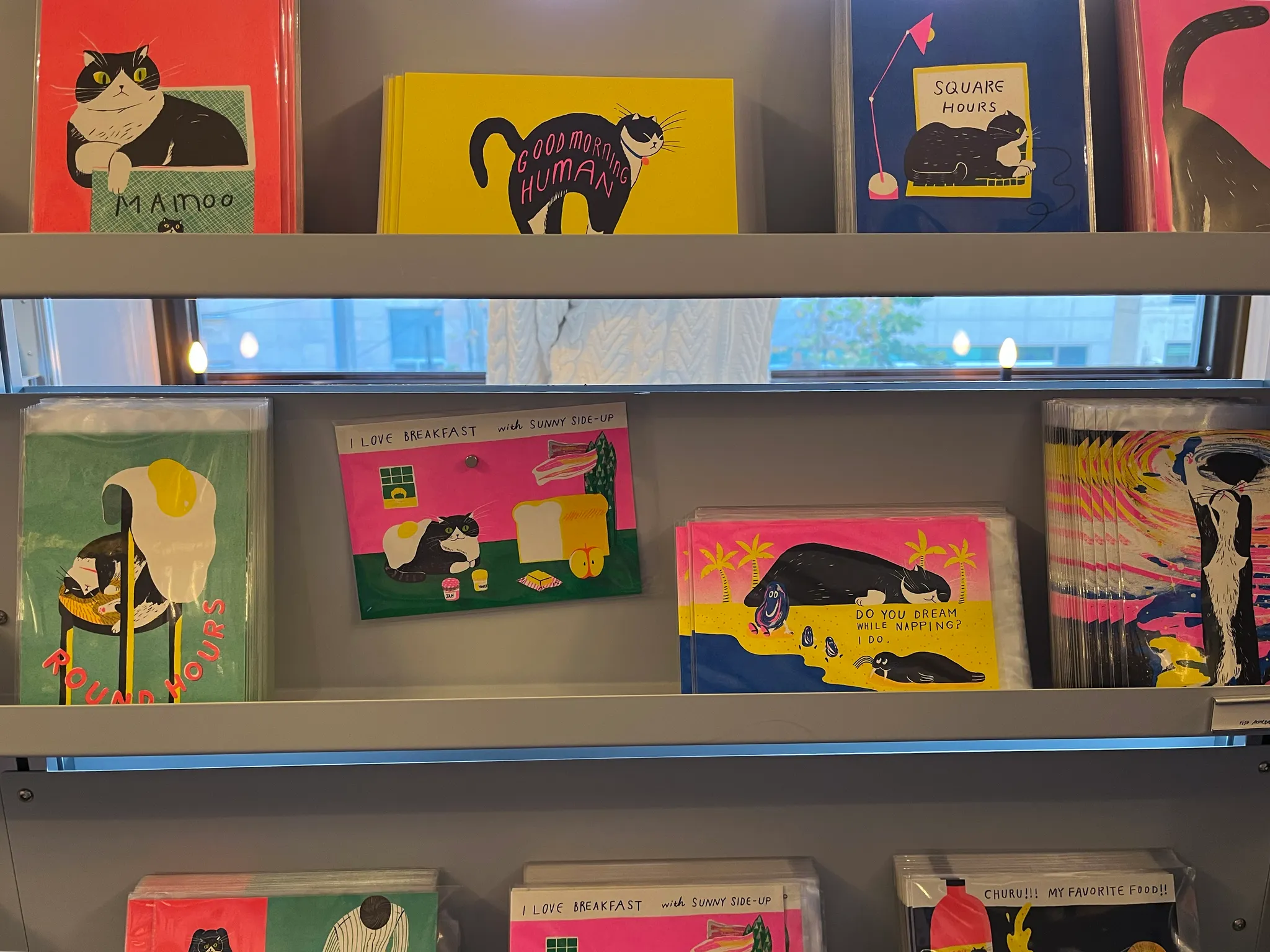 카운터 뒷 쪽으로 보이는 엽서 전시들.