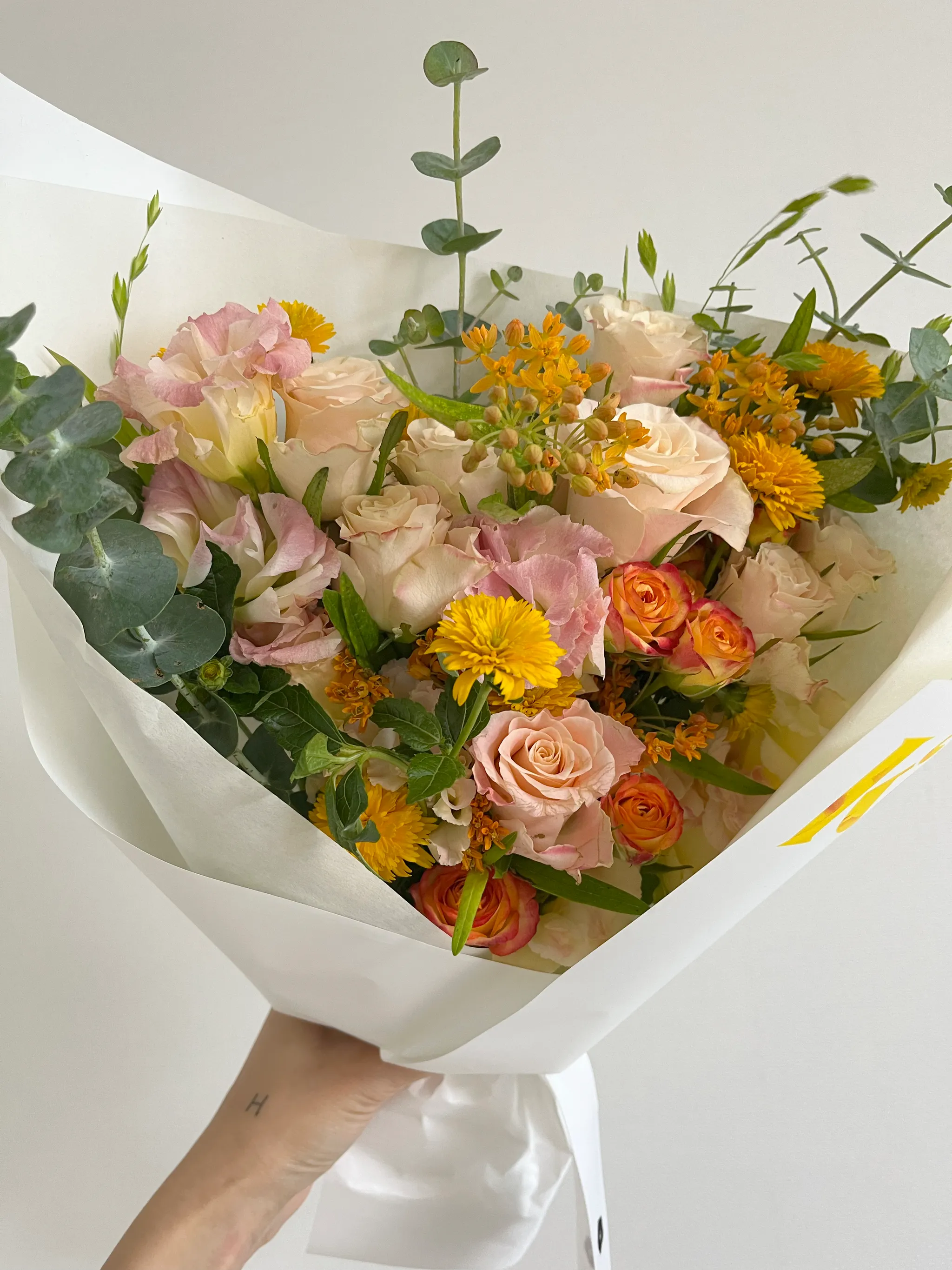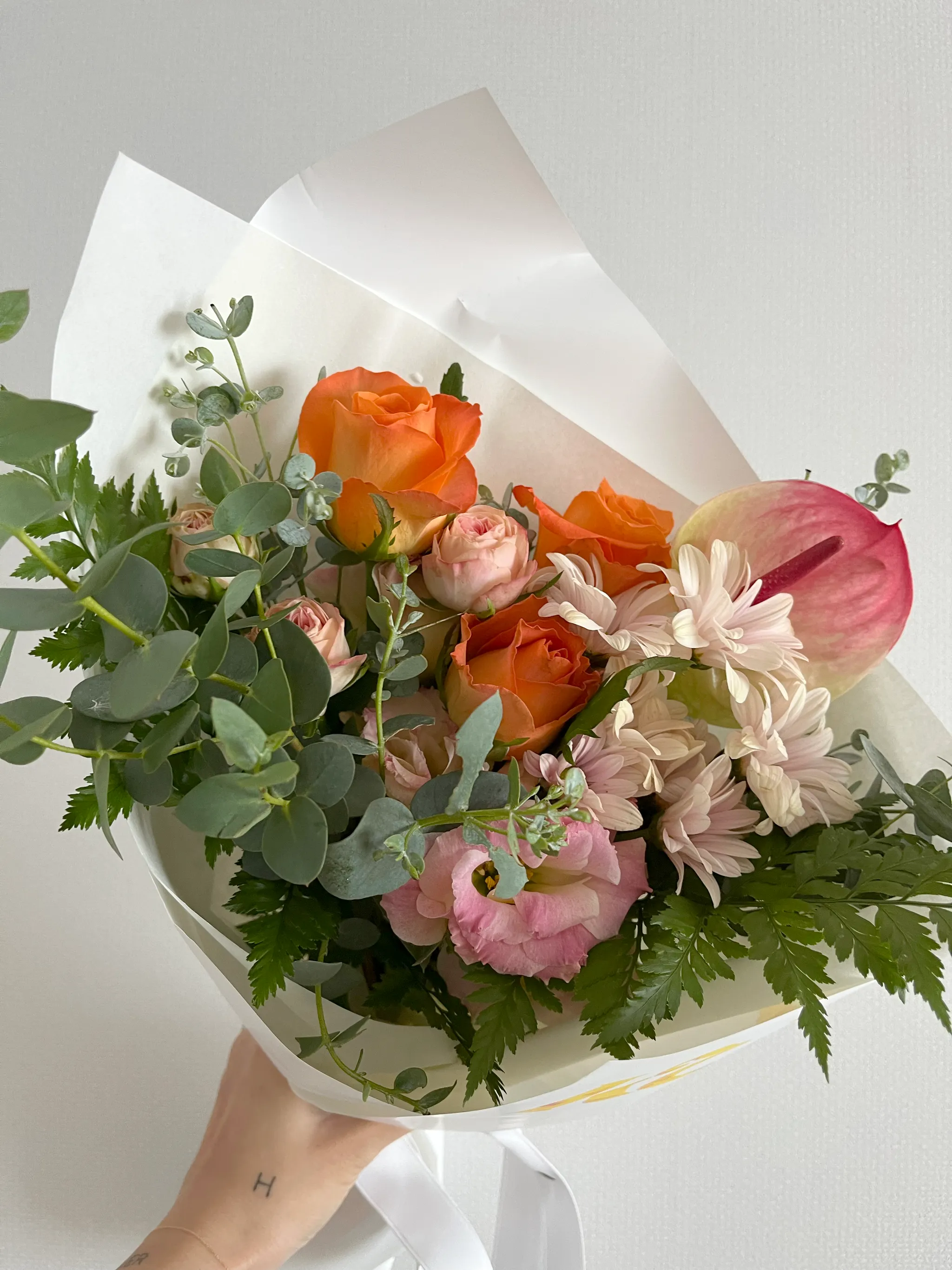 역시나 마음에 들었던 두 번째 꽃다발. 오른쪽에 삐죽 나와있는건 엘레강시아 안시리움인데, 저게 딱 포인트가 되고 예뻤다. 주황색과 분홍빛이 조화로웠던 두 번째 꽃다발