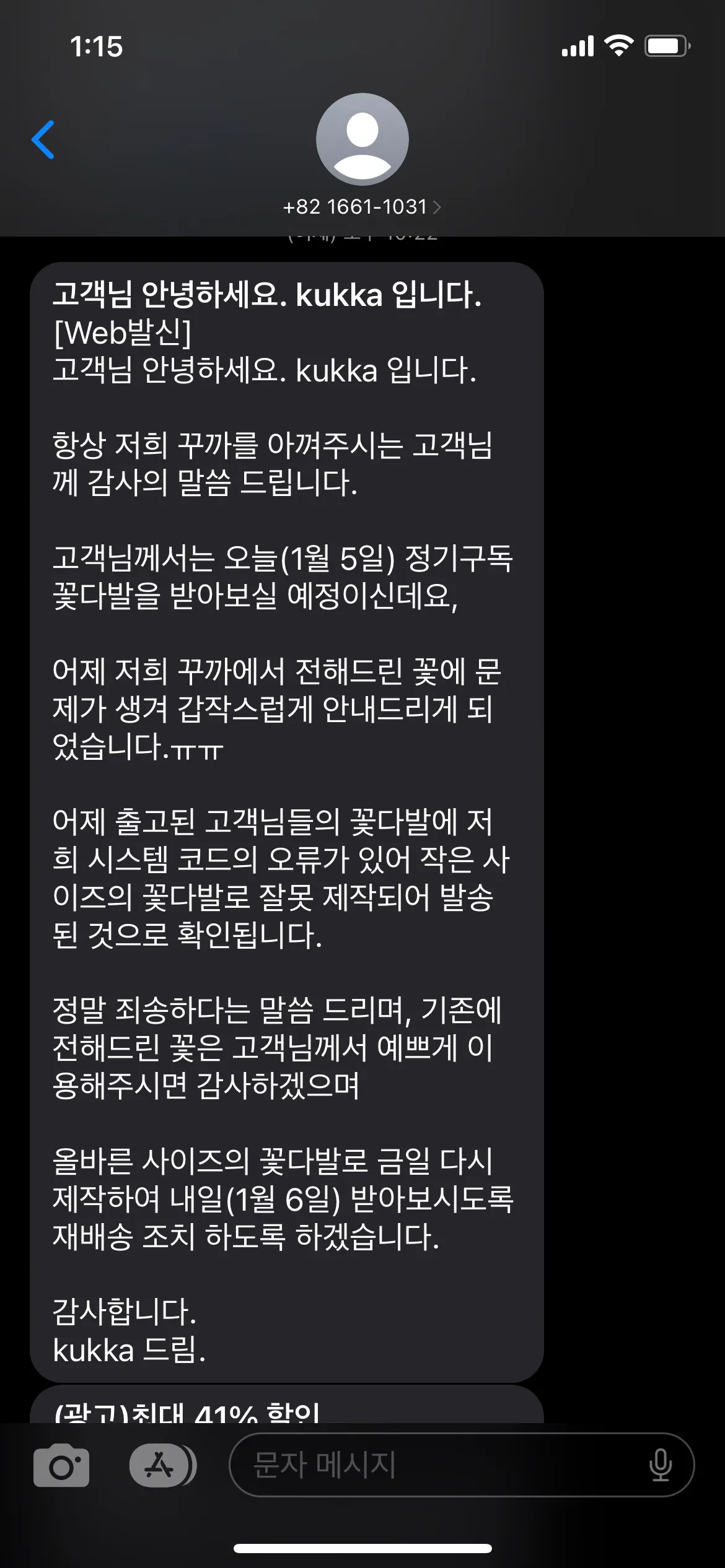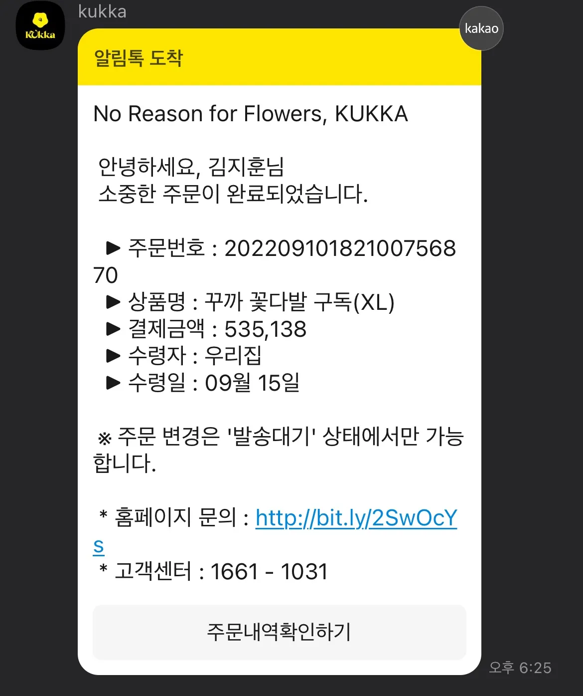 그리고 이런 카톡이 왔는데, 띠요옹? 혹시 잘못 온건가? 왜냐하면 나는 원래 받기로 되어있었던 꽃을 잘 받았기 때문에,,