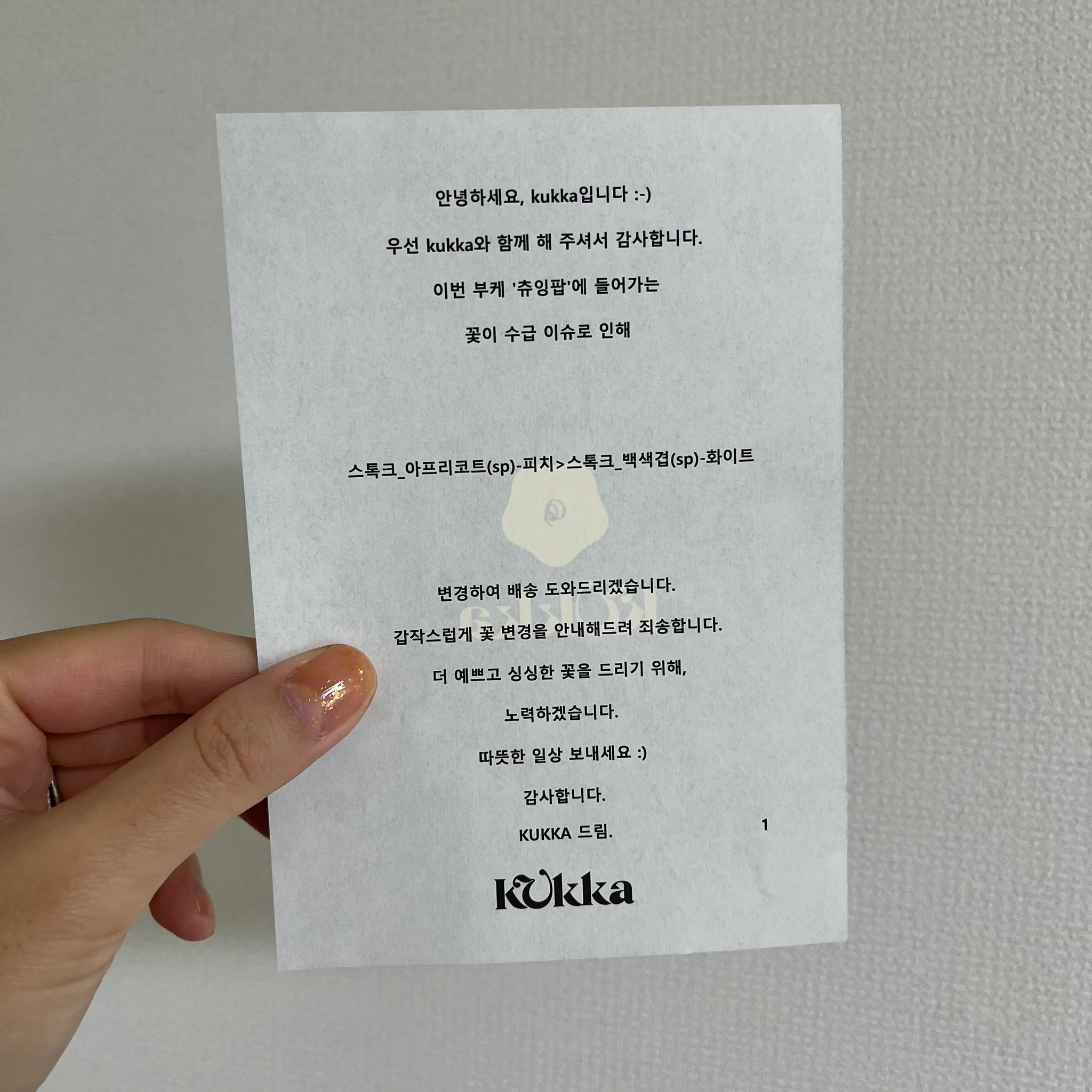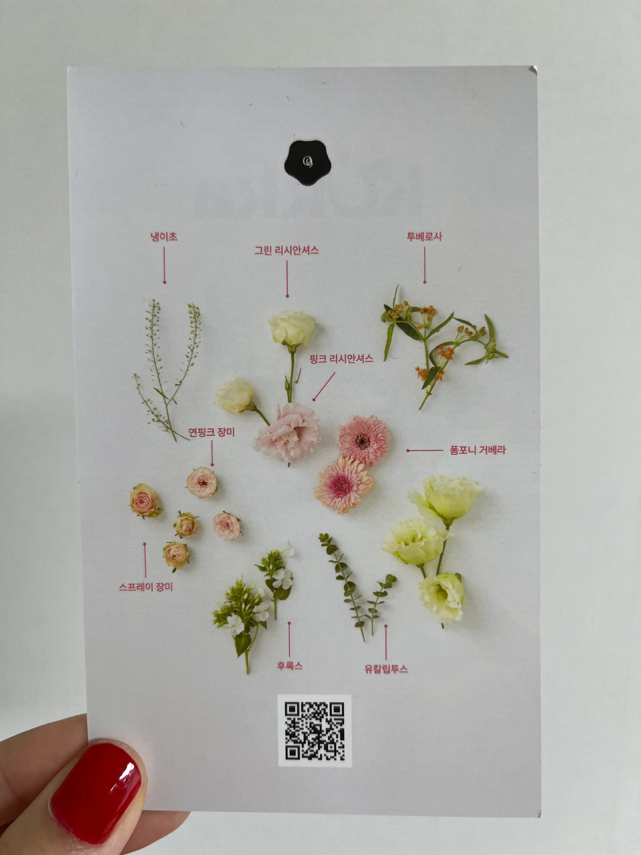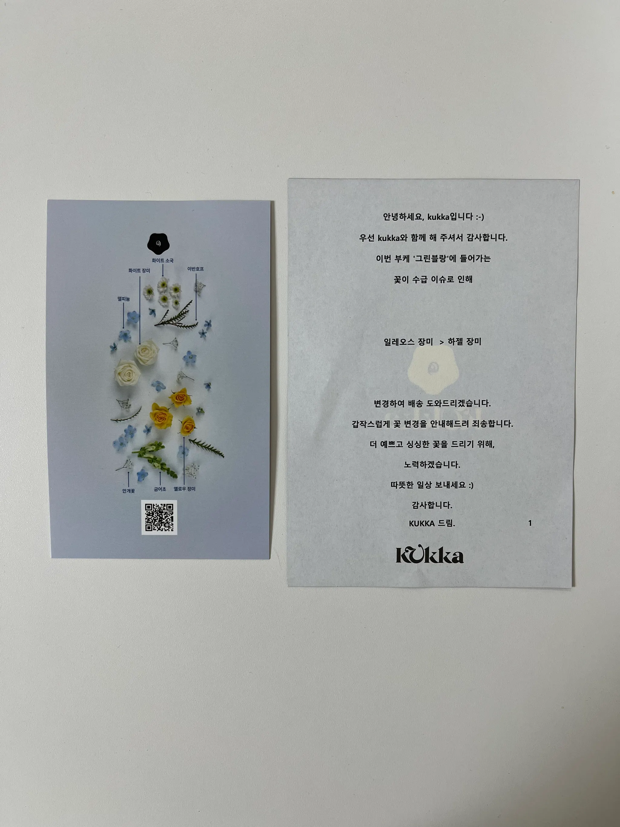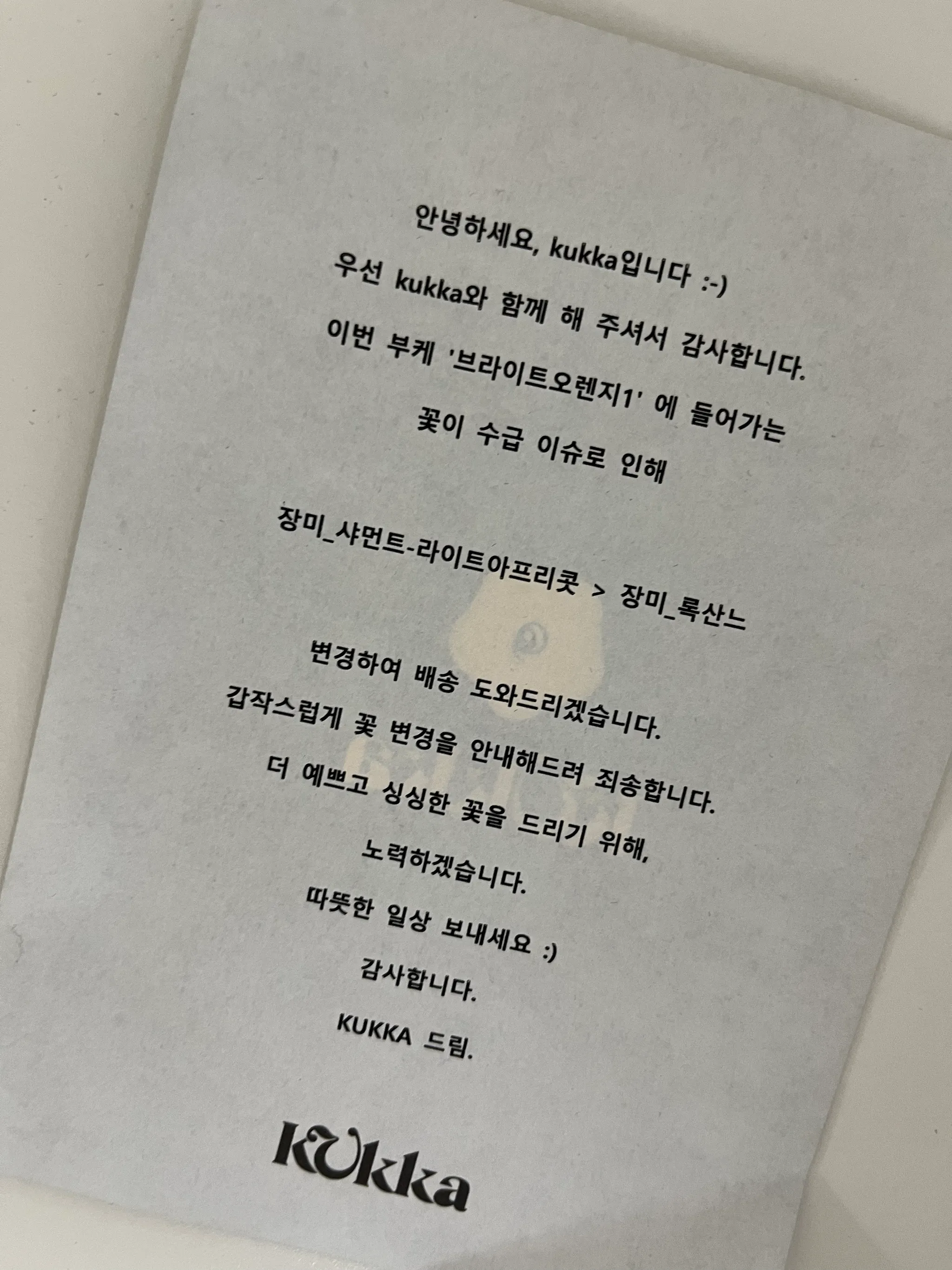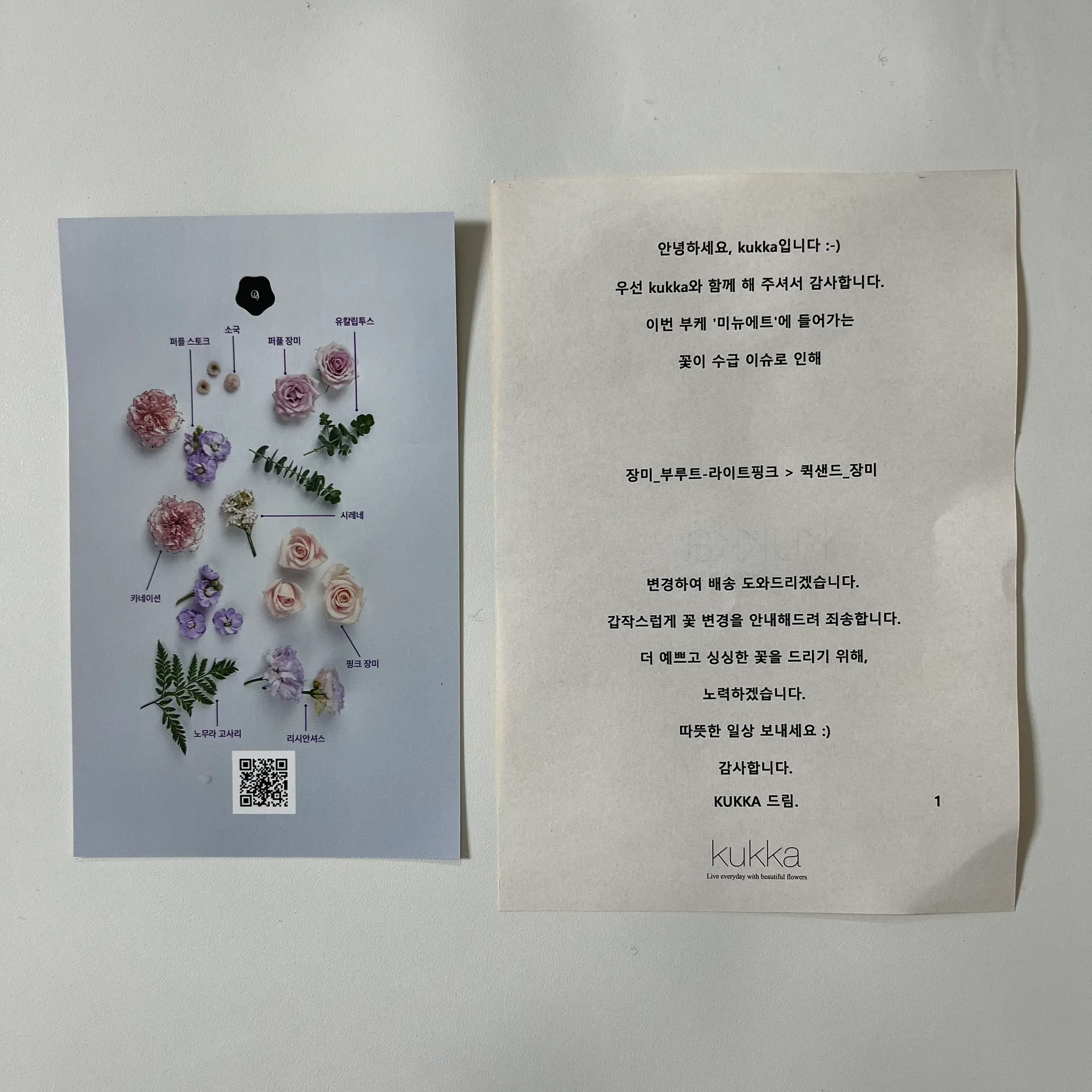 첫 꽃다발이었지만 아쉽게도 수급 이슈로 인해 원래 예정된 장미가 아닌 록산느로 바뀌었다는 사실. 어쩔 수 없는 일이긴 하지만 이렇게 안내를 해주어 서비스가 꽤 세심하다고 생각했다.