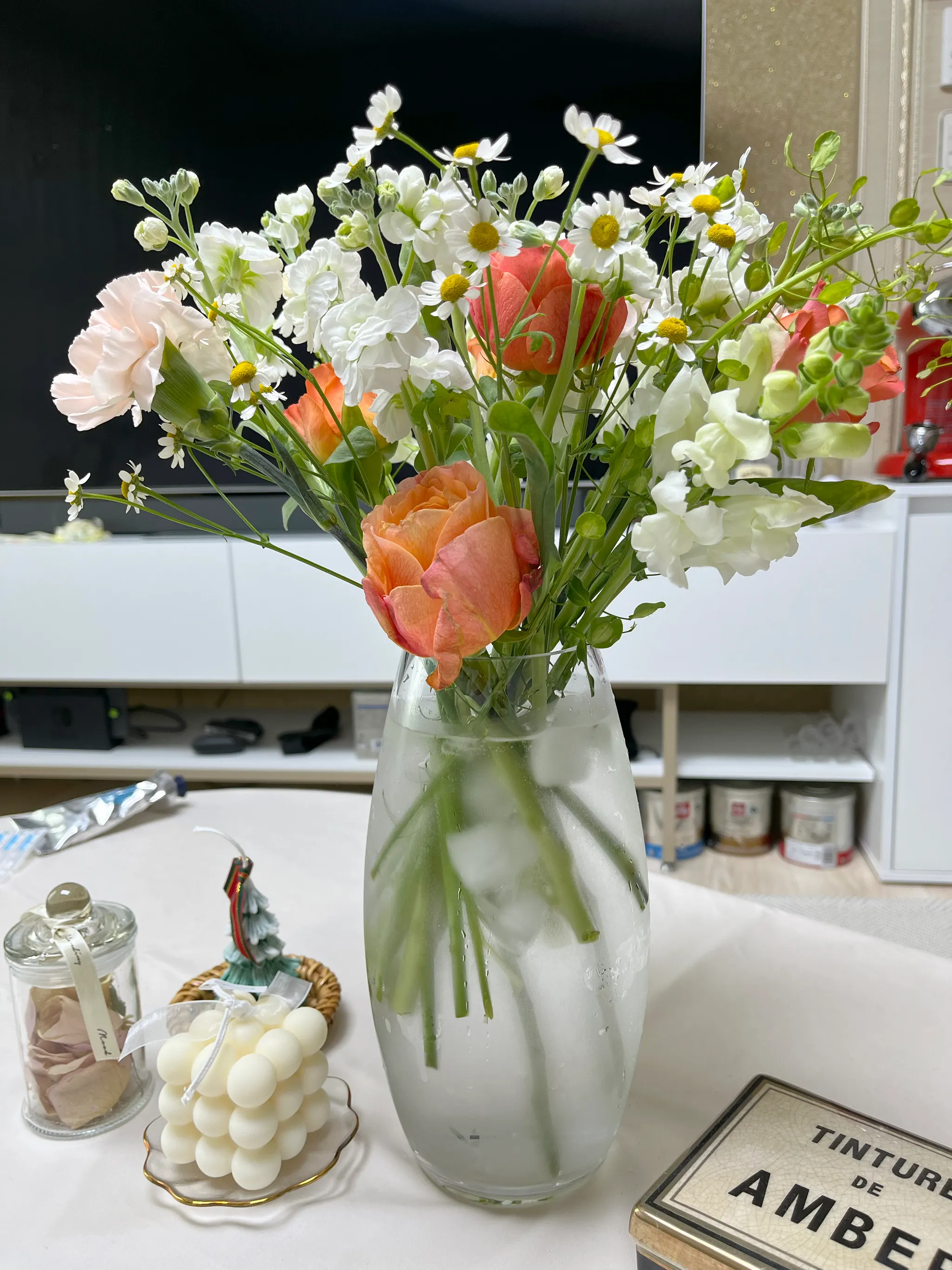 생각보다 풍성하고 종류도 많아서 알록달록 예뻤다. 받자마자 기분이 너무 좋았던 첫 꽃! 기대만큼 완전 싱싱하지는 않았지만, 날이 따뜻하기도 하고 상자에 몇 시간 있다가 오는 거니까 이 정도는 이해하기로.
