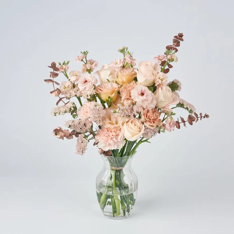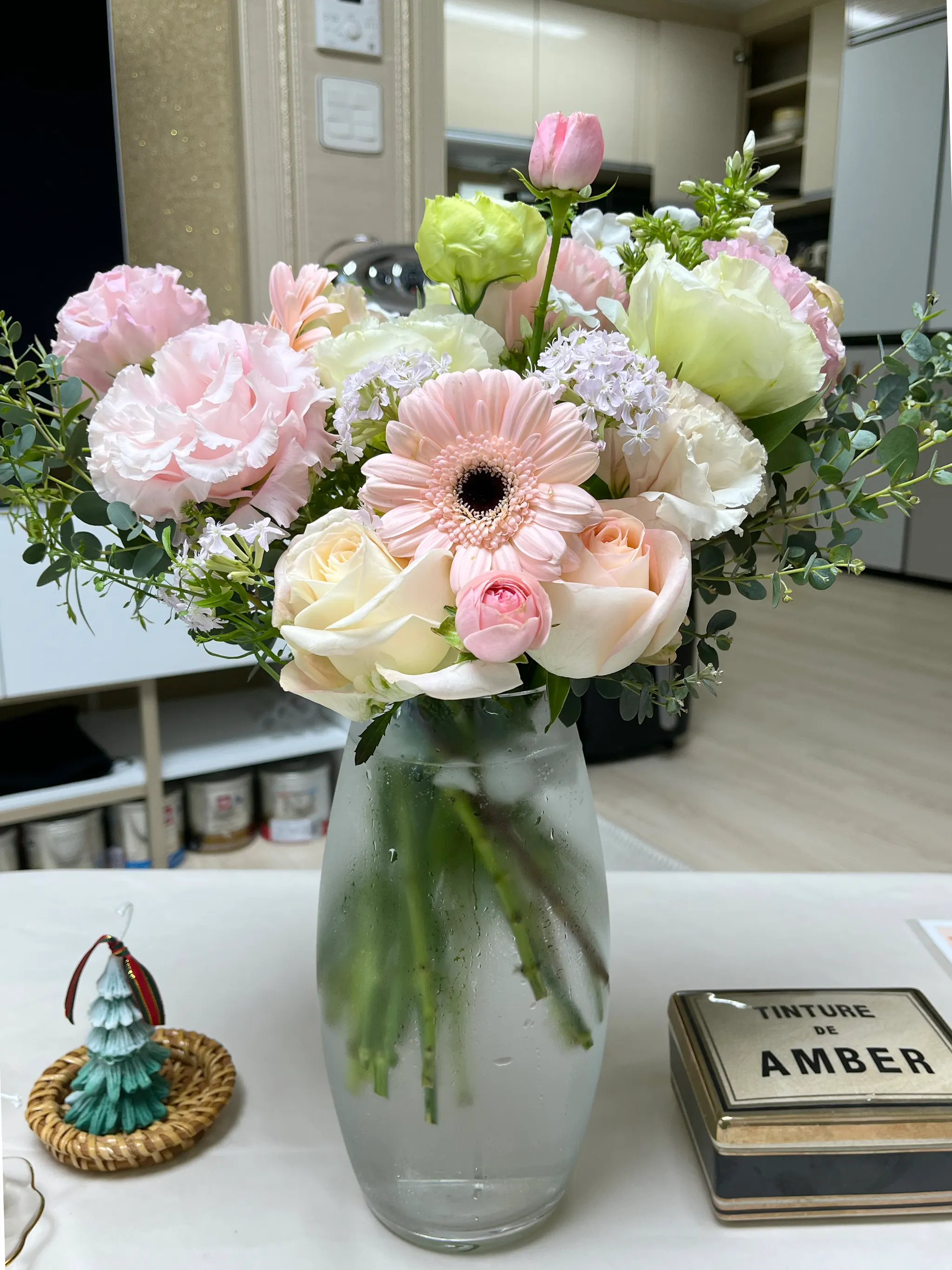꾸까 상자 딱 열자마자 탄성 나왔던 여섯 번째 꽃다발! 부들부들한 핑크빛 색감이 꼭 결혼식 부케같았다. 미니 장미 정말 너무 귀엽고🥹 폼포니 거베라가 무게를 잡아주는 것 같았던 꽃다발. 너무 예뻐서 시들기 전에 담아놓고 싶어서 사진 엄청 찍었었던 여섯 번째 꽃다발. 오래오래 보고싶어 화병에 얼음도 한껏 담아두었다.