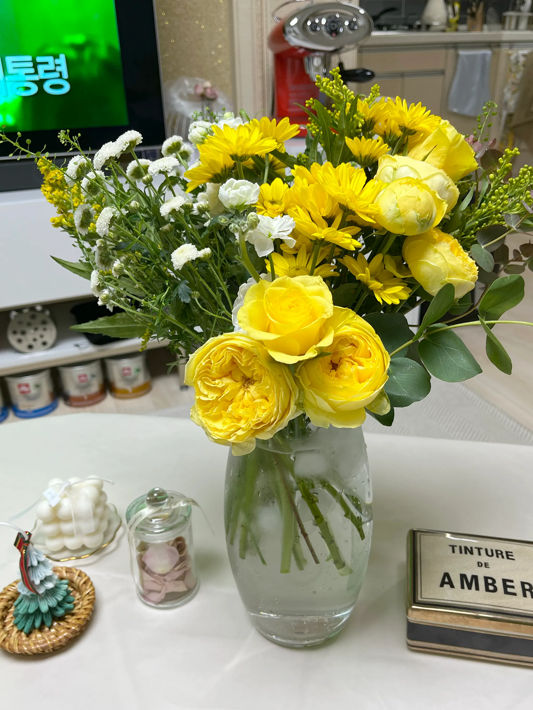 같은 노랑이지만 일레오스 장미와 카탈리나 장미, 그리고 금수국화의 느낌이 각각 다르면서도 조화로웠다. 특히 두 장미를 보고있자니 나는 풍성한 꽃이 취향이라는 걸 깨달았다. 화병 물에 얼음을 넣어두면 꽃이 더 오래 간다는 엄마(=플로리스트)의 조언으로 얼음을 한 가득 넣어둠! 오래오래 보고 싶었다