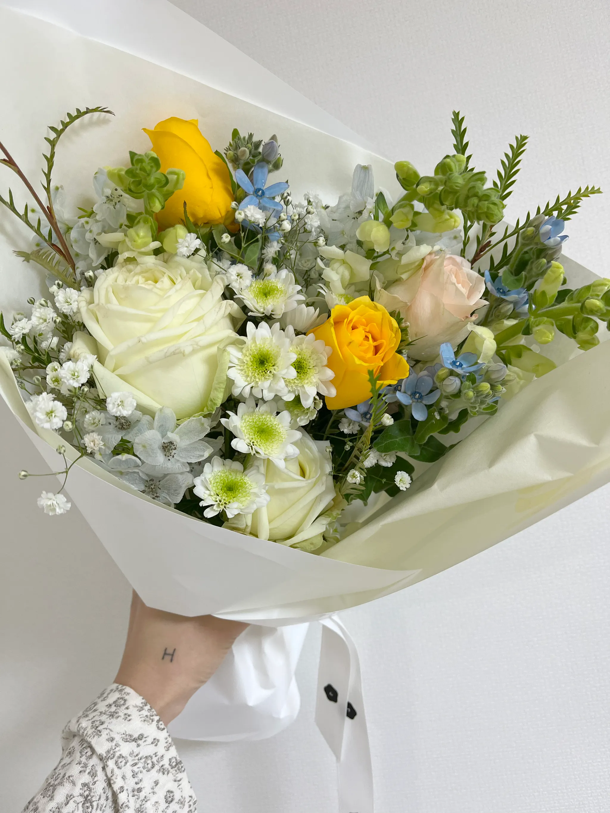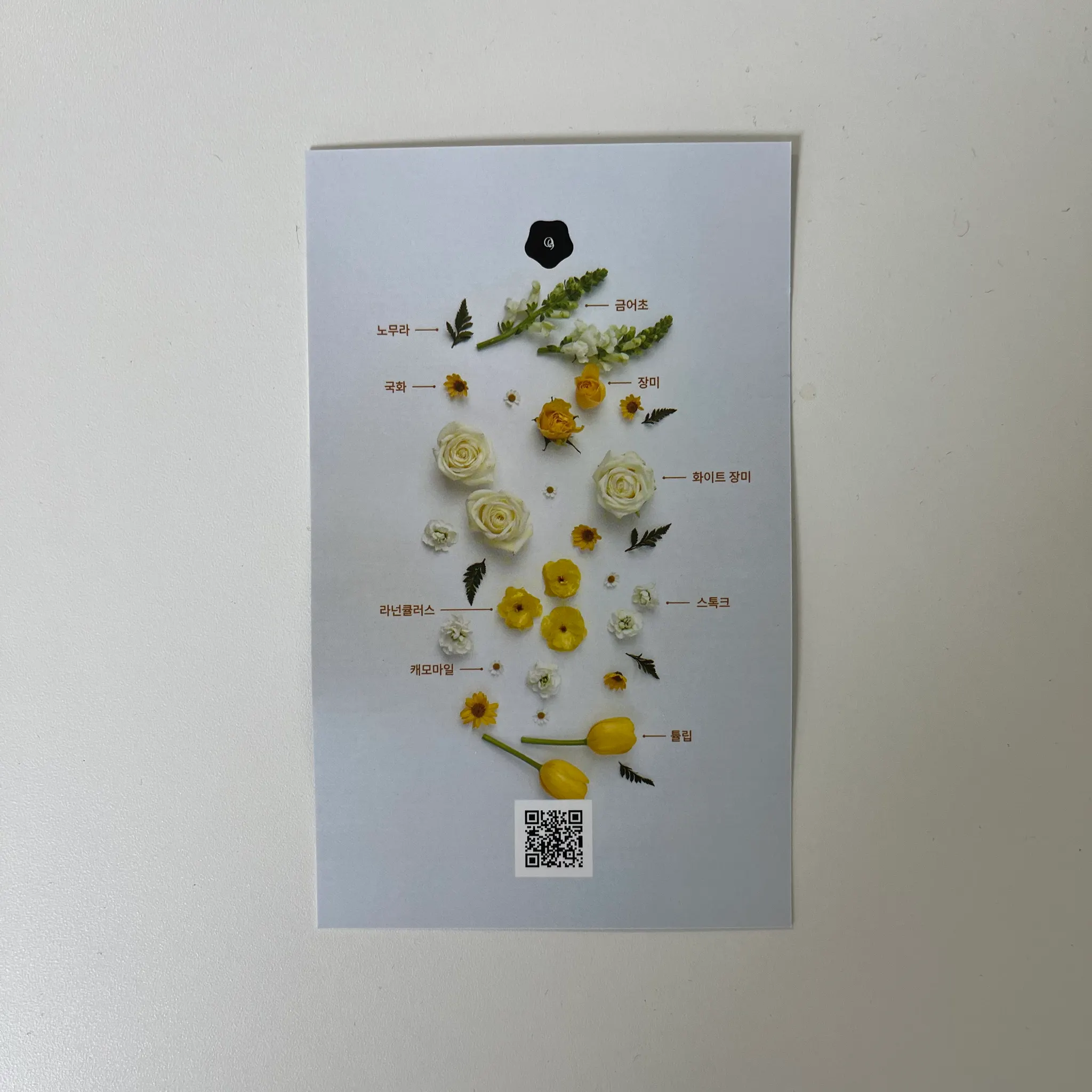 꽃은 같은 색이라도 종류에 따라 다른 느낌을 준다는게 너무 신기하다. 이 꽃다발만 봐도 흰색 꽃도 종류가 여러개, 노란꽃도 종류가 여러개인데 꽃마다 각기 다른 느낌. 마지막 꽃다발인데 역시나 사이즈가 조금 작아진 것 같다