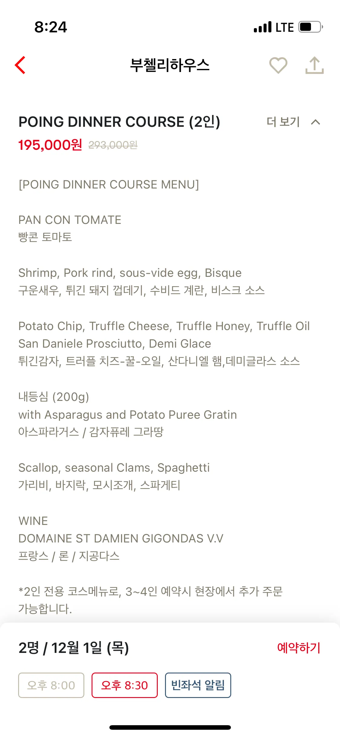 포잉 예약은 앱으로 편하게 클릭클릭하면 되지만 예약 가능한 시간대가 오후 8시와 8시 30분 두 타임 뿐이며, 정해진 포잉 코스 요리를 먹어야한다. 하지만 이제 할인을 곁들인!