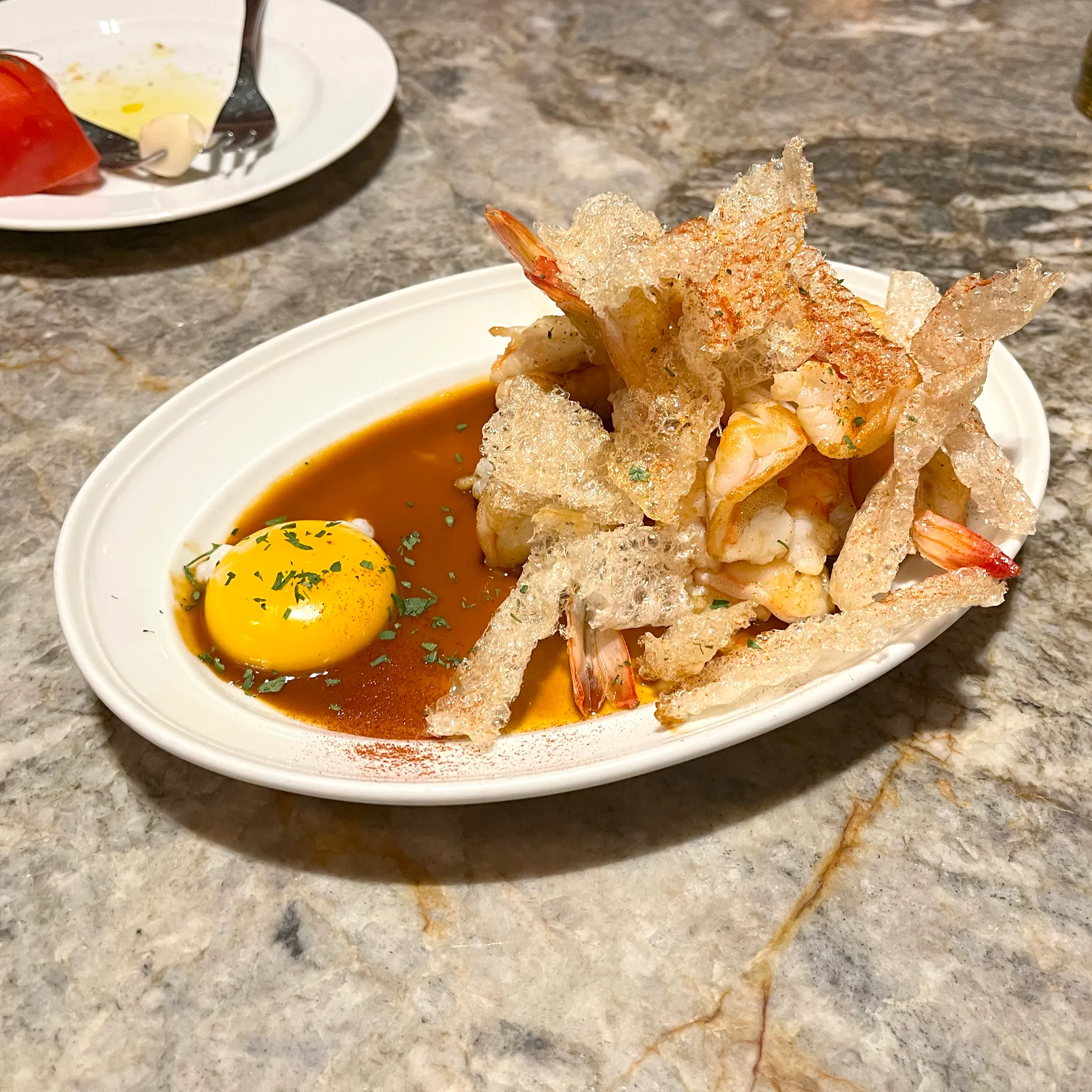 구운 새우, 튀긴 돼지 껍데기, 수비드 계란, 비스크 소스