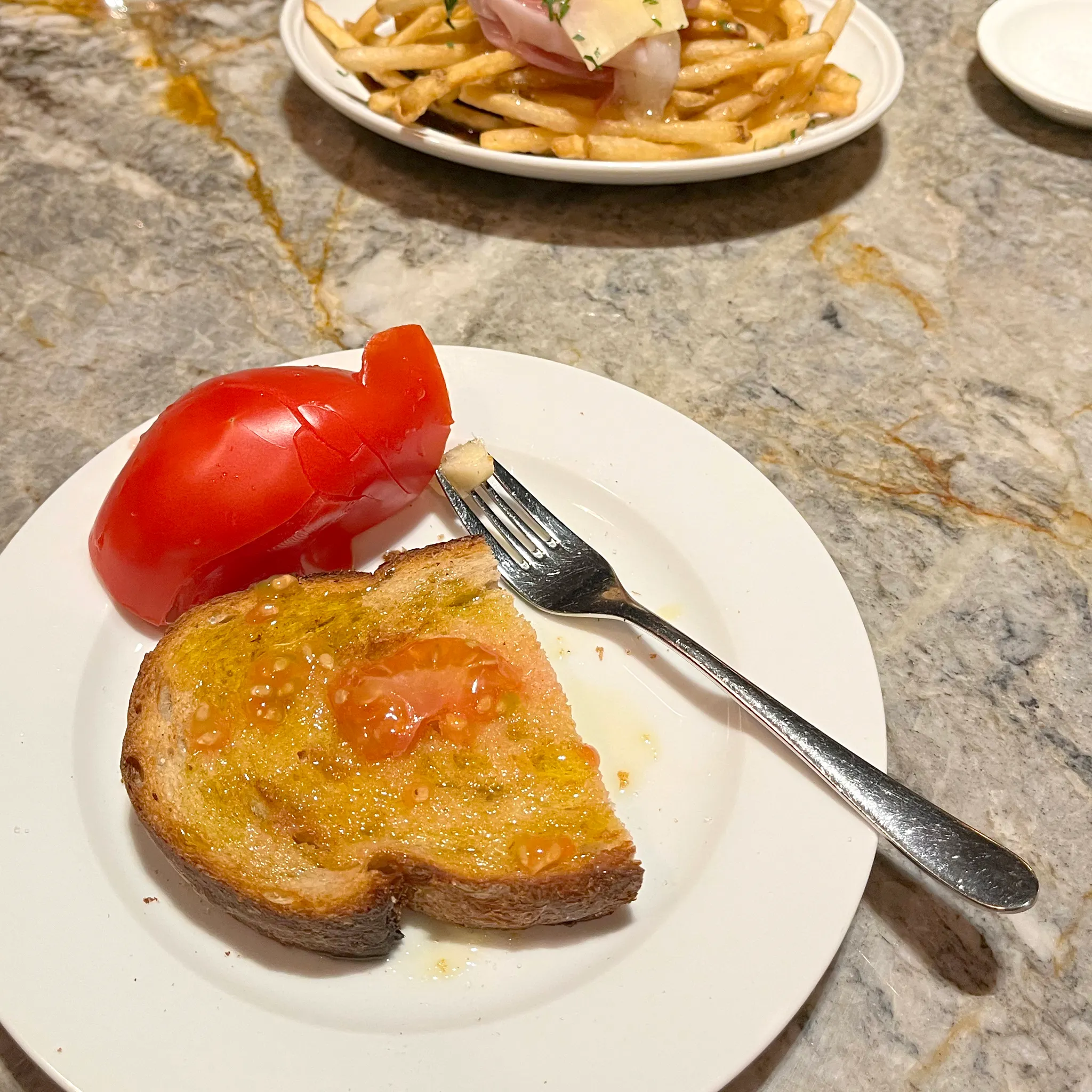 요건 째꼼 아쉬웠던 게, 간이 짭짭한 스파게티였던 것. 앞에서 쭉 잔 음식 들 먹고 짭짤한 스테이크 먹고 바로 또 짠 걸 먹으니까 너무 짠짠짠짜라란짠짠이었다. 사실 판 콘 토마테 올리뷰유의 맛을 기대하긴 했었음.