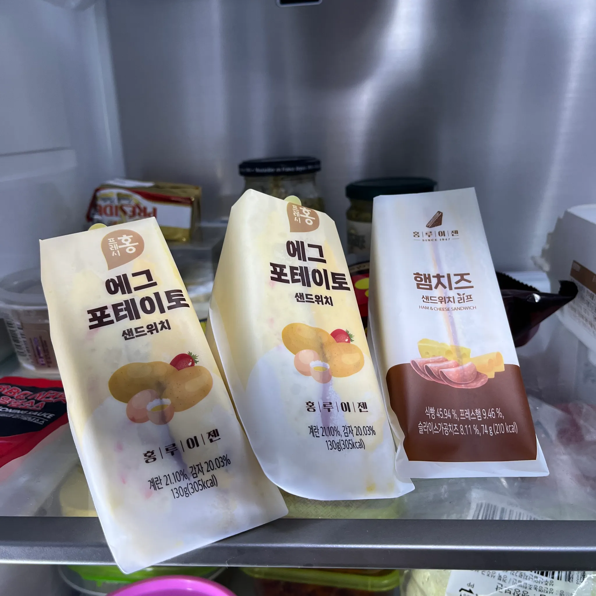 해서 뭔가하고 궁금해하며 갔더니 냉장고에 있던 선물! 요즘 홍루이젠 에그 포테이토 샌드위치에 꽂힌 나를 위해 짝꿍이 퇴근 길에 겟해왔다. 햄치즈는 그냥 덤ㅎㅎㅎ