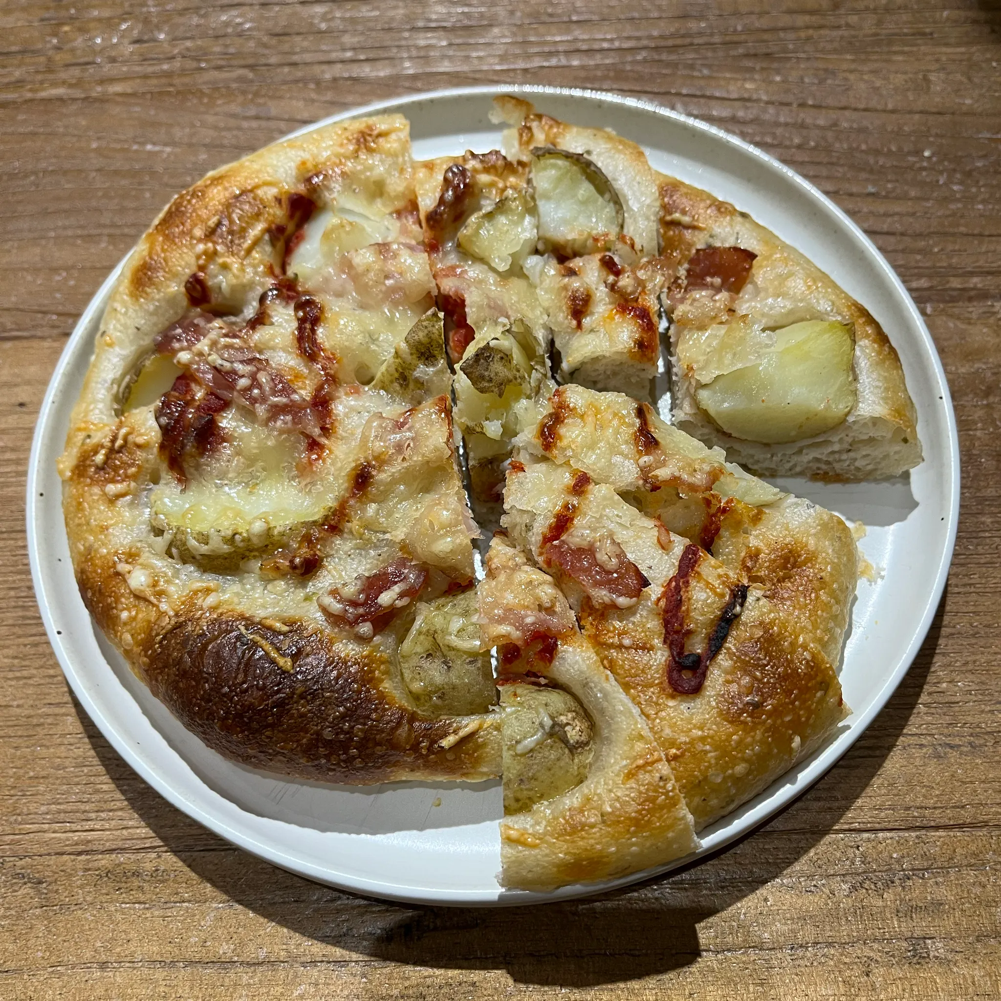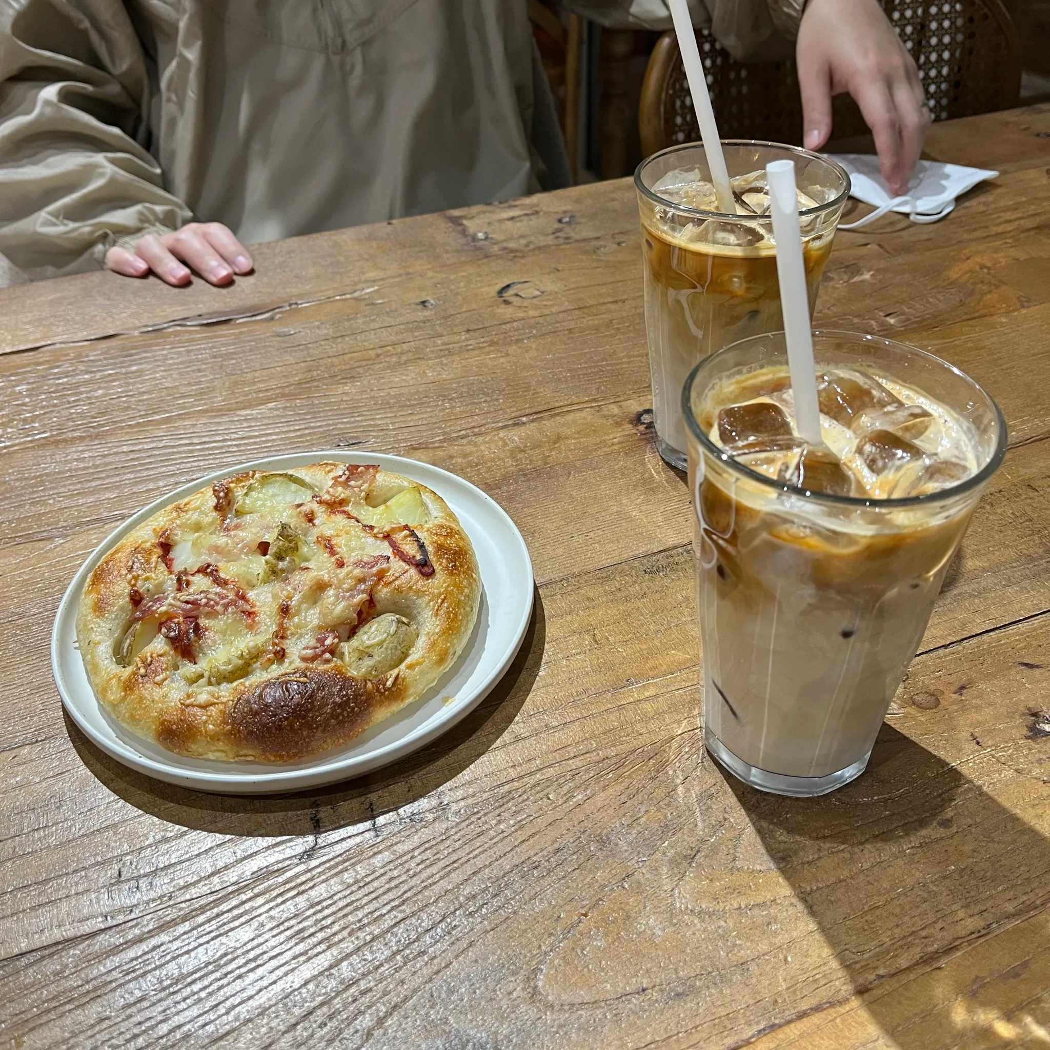 아이스 카페라떼랑 포테이토 베이컨 브레드.