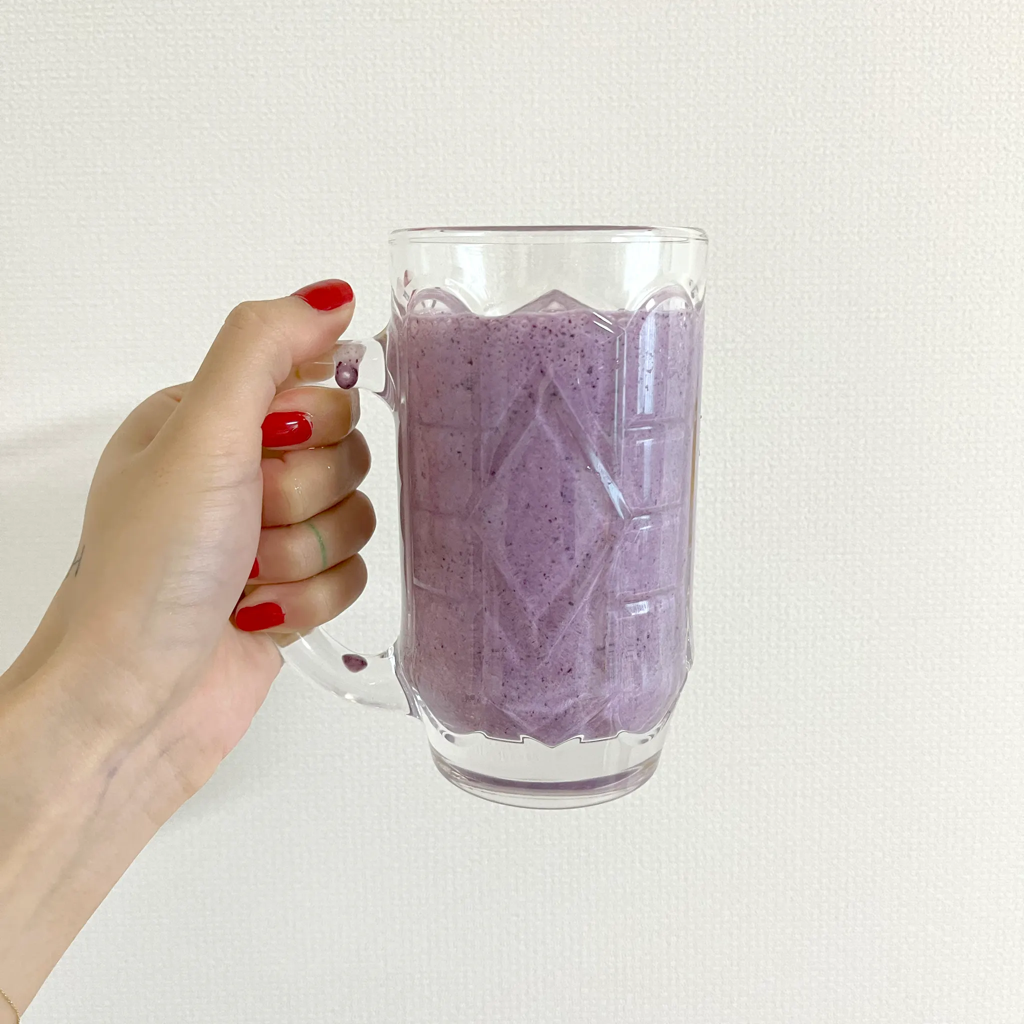 냉동 블루베리 5 스푼(약 60g) + 바나나 반 개 + 우유 300ml + 꿀 한 스푼 = 존맛짱맛 블바주