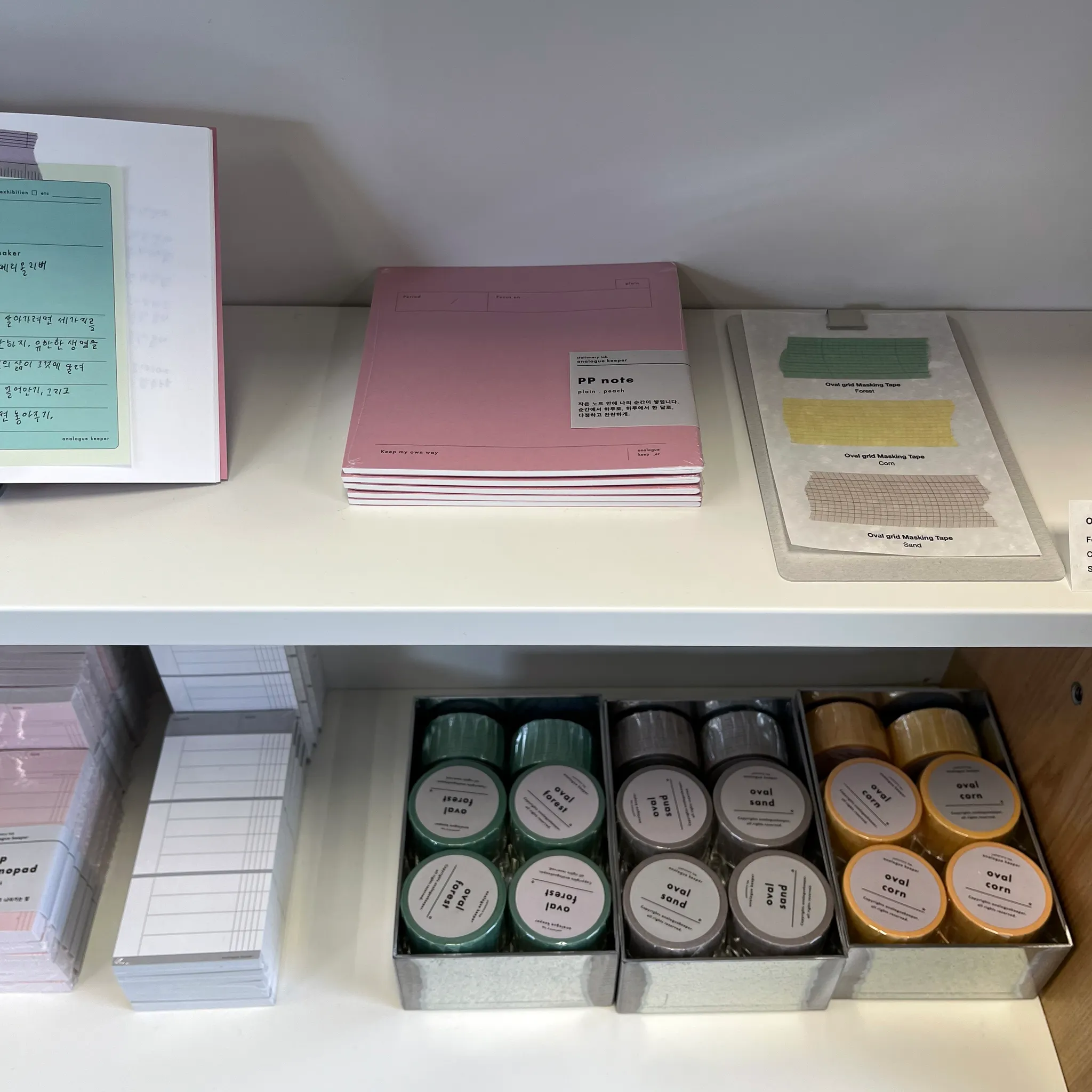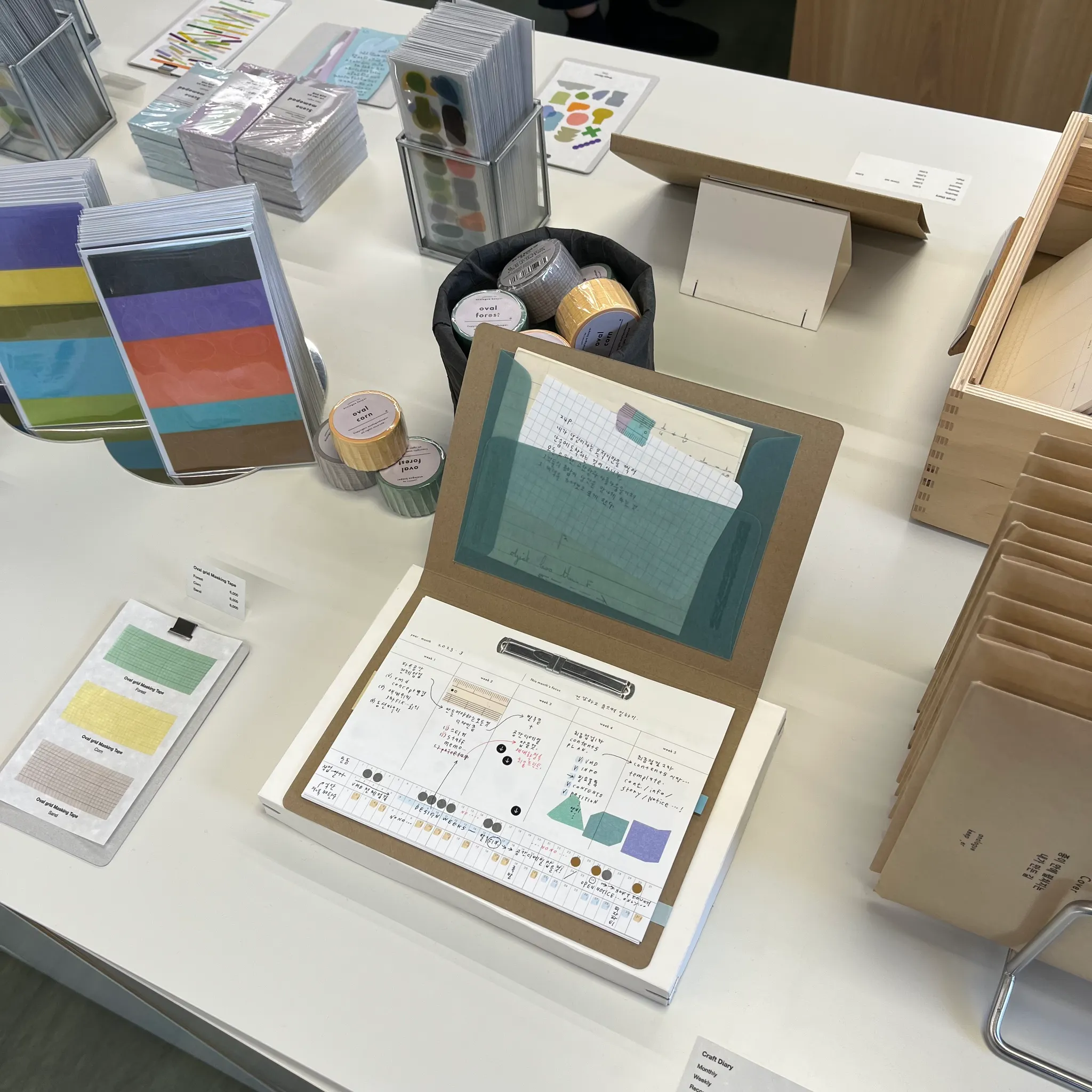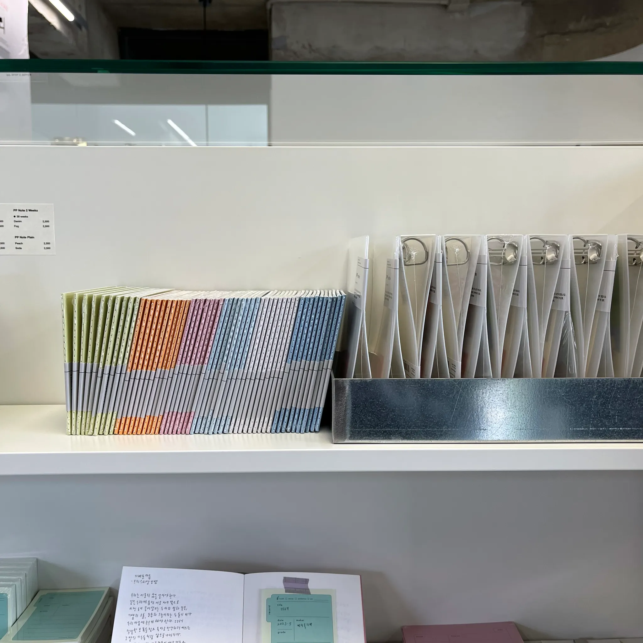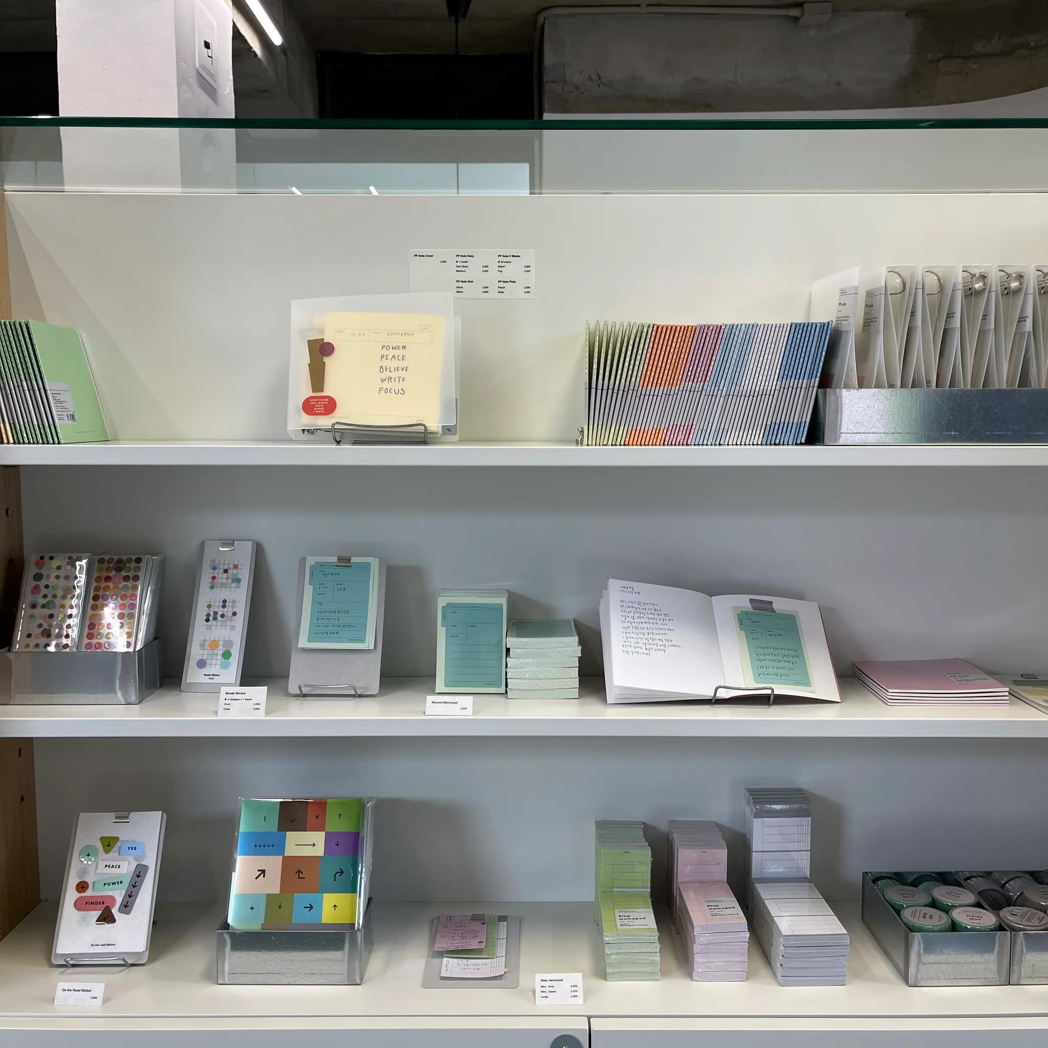 아트북 책장 뒷 편으로 넘어가면 나오는 여기는 PP 노트 시리즈와 비즈 스티커, 온 더 로드 스티커와 메모패드들, 그리고 마스킹테이프 자리들. 매번 화면으로만 보던 제품들을 두 눈으로 직접 보고 두 손으로 직접 만져볼 수 있다는게 너무 좋았다. 이게 바로 오프라인 매장의 최고 장점이 아닐까