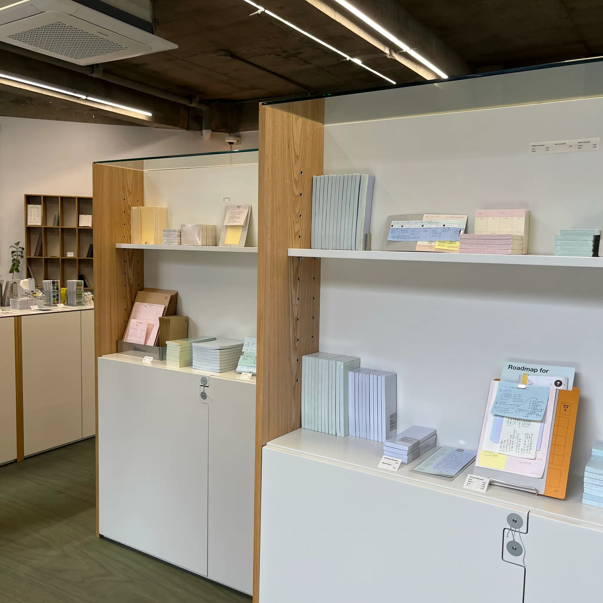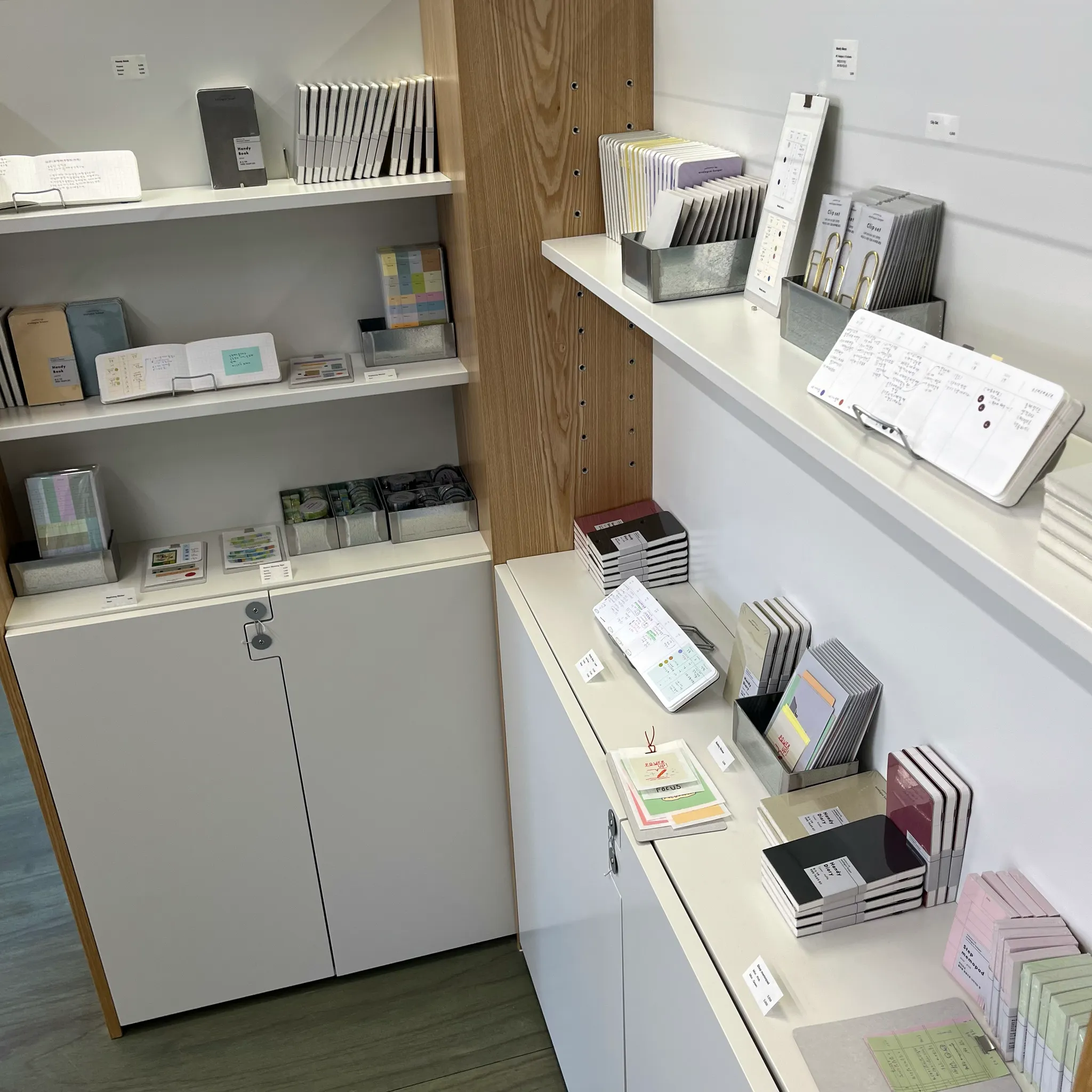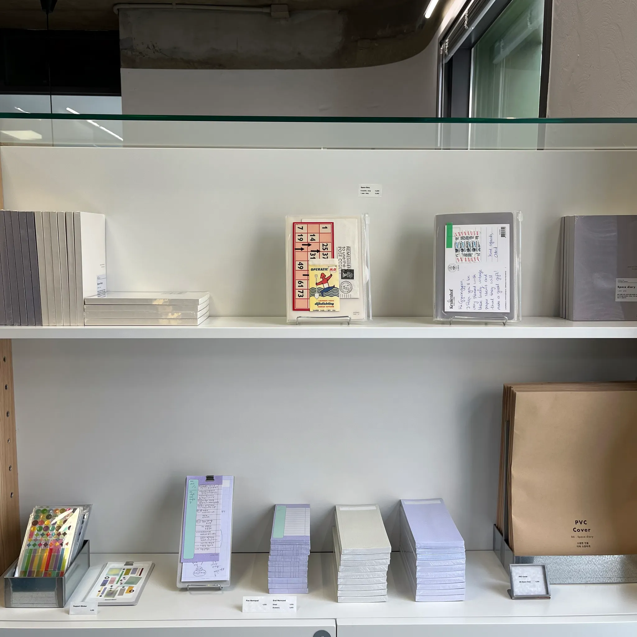 아트북 책장 뒷 편으로 넘어가면 나오는 여기는 PP 노트 시리즈와 비즈 스티커, 온 더 로드 스티커와 메모패드들, 그리고 마스킹테이프 자리들. 매번 화면으로만 보던 제품들을 두 눈으로 직접 보고 두 손으로 직접 만져볼 수 있다는게 너무 좋았다. 이게 바로 오프라인 매장의 최고 장점이 아닐까