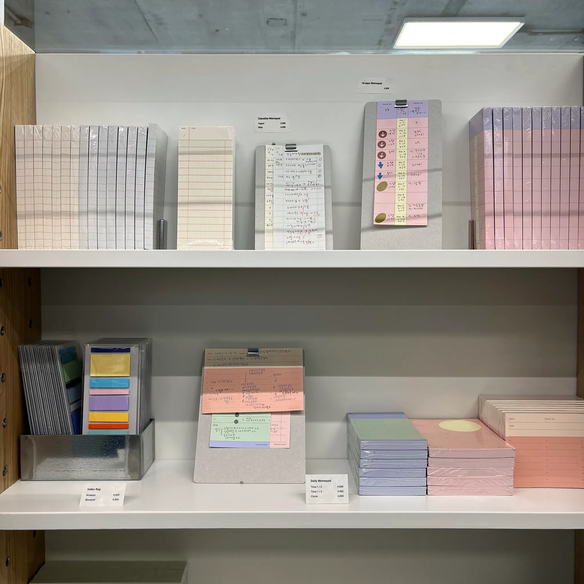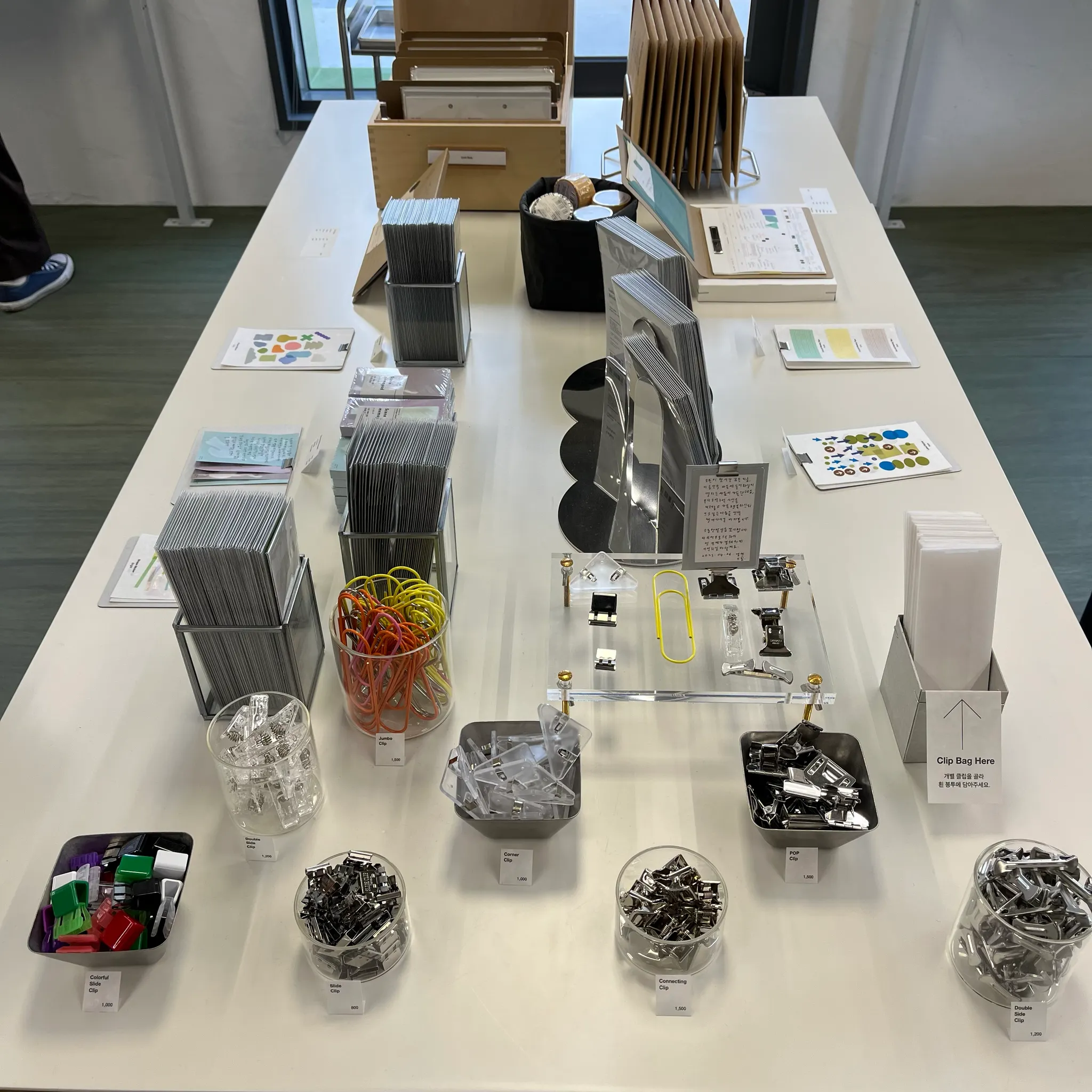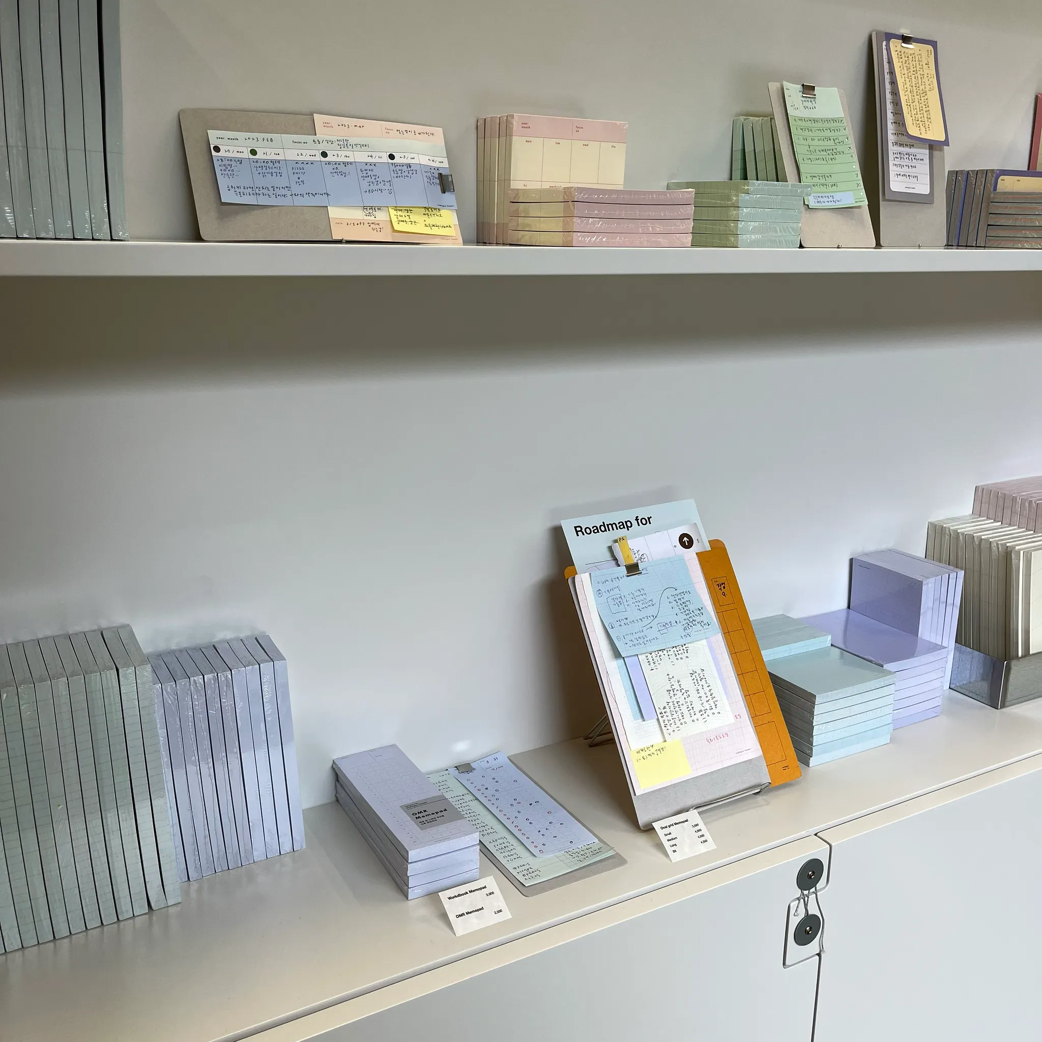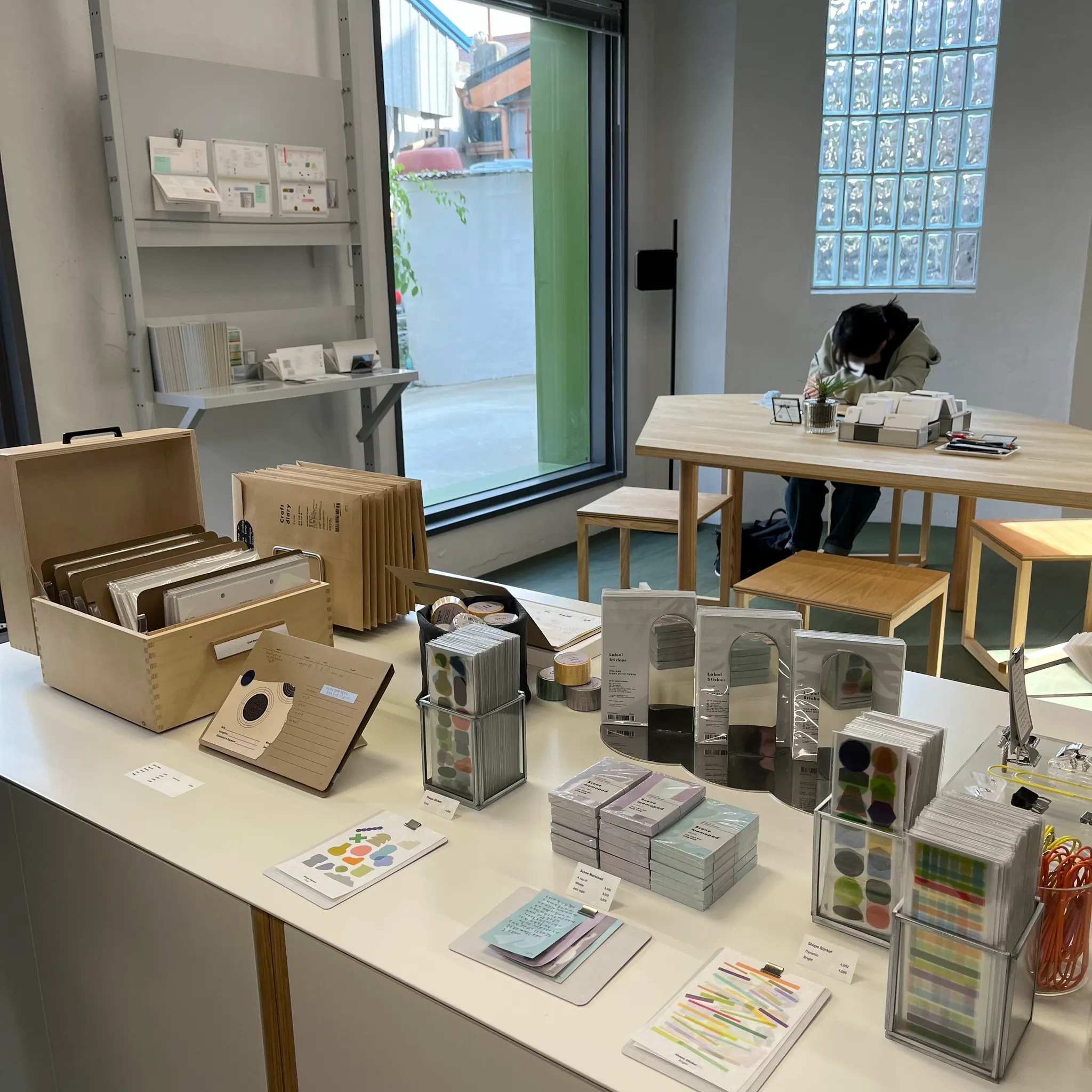 아트북 책장 뒷 편으로 넘어가면 나오는 여기는 PP 노트 시리즈와 비즈 스티커, 온 더 로드 스티커와 메모패드들, 그리고 마스킹테이프 자리들. 매번 화면으로만 보던 제품들을 두 눈으로 직접 보고 두 손으로 직접 만져볼 수 있다는게 너무 좋았다. 이게 바로 오프라인 매장의 최고 장점이 아닐까