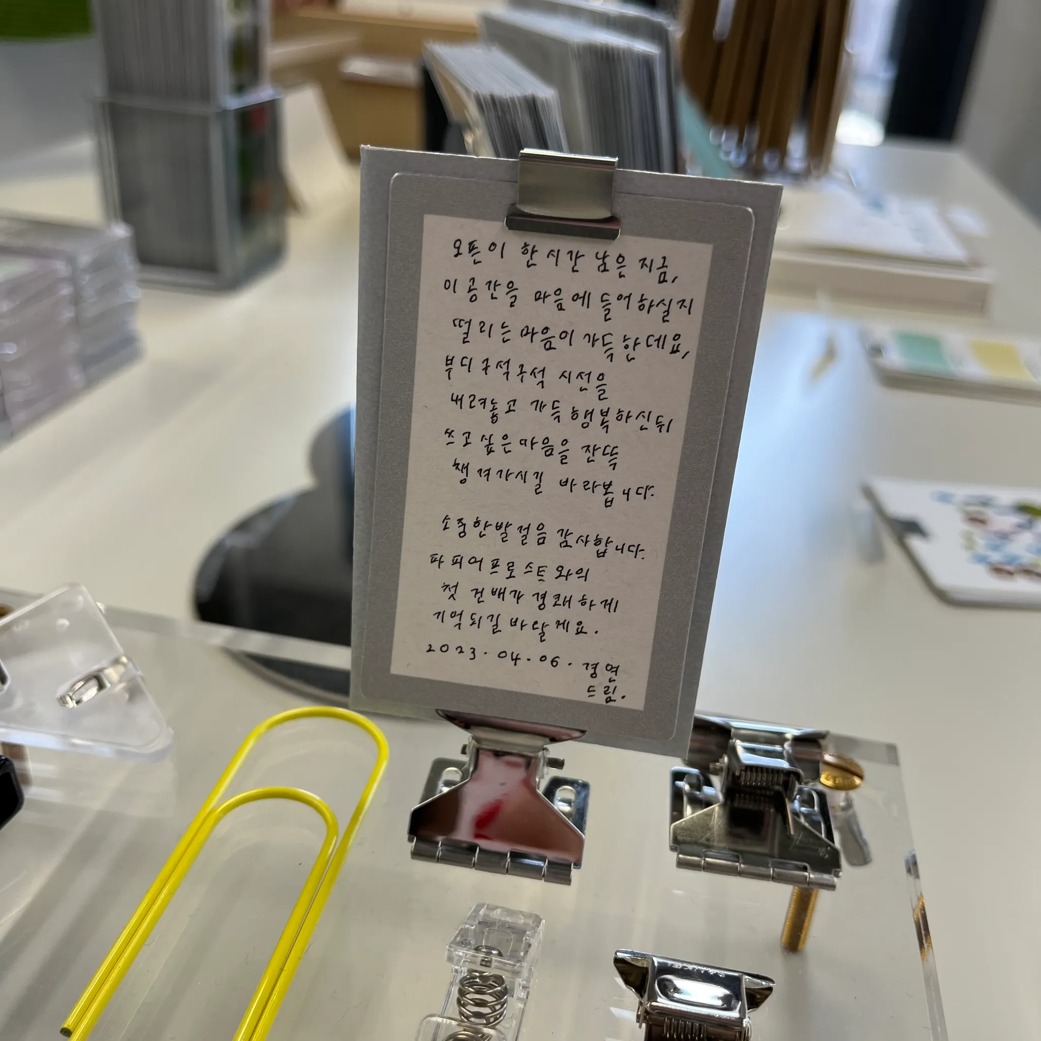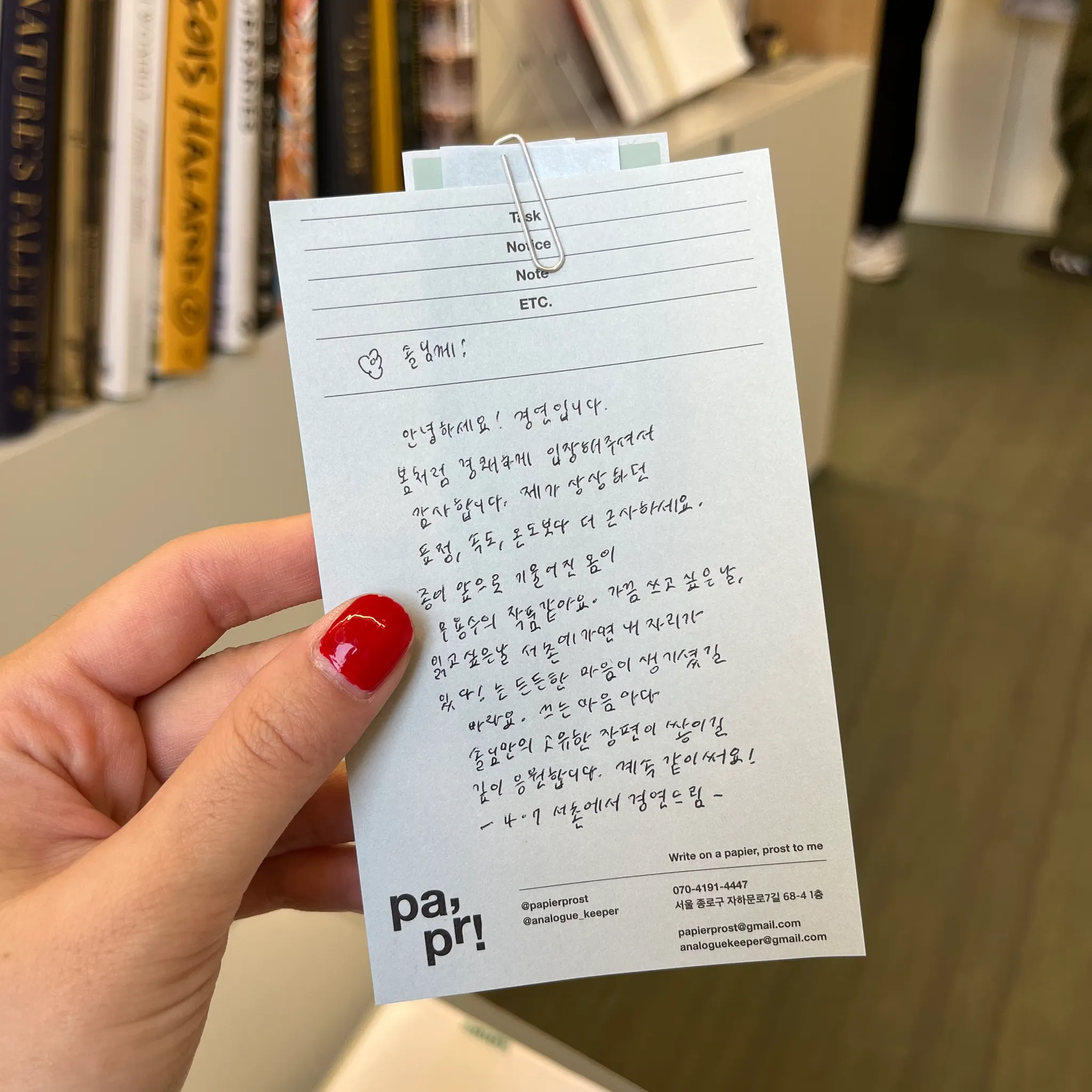 파피어 프로스트 오픈 한 시간 전, 우리에게 쓰는 경연님의 짤막한 편지. 쓰면서 얼마나 기대되고 떨리고 긴장했을런지!🥹 너무 마음에 들어요 증맬루🫶🏻