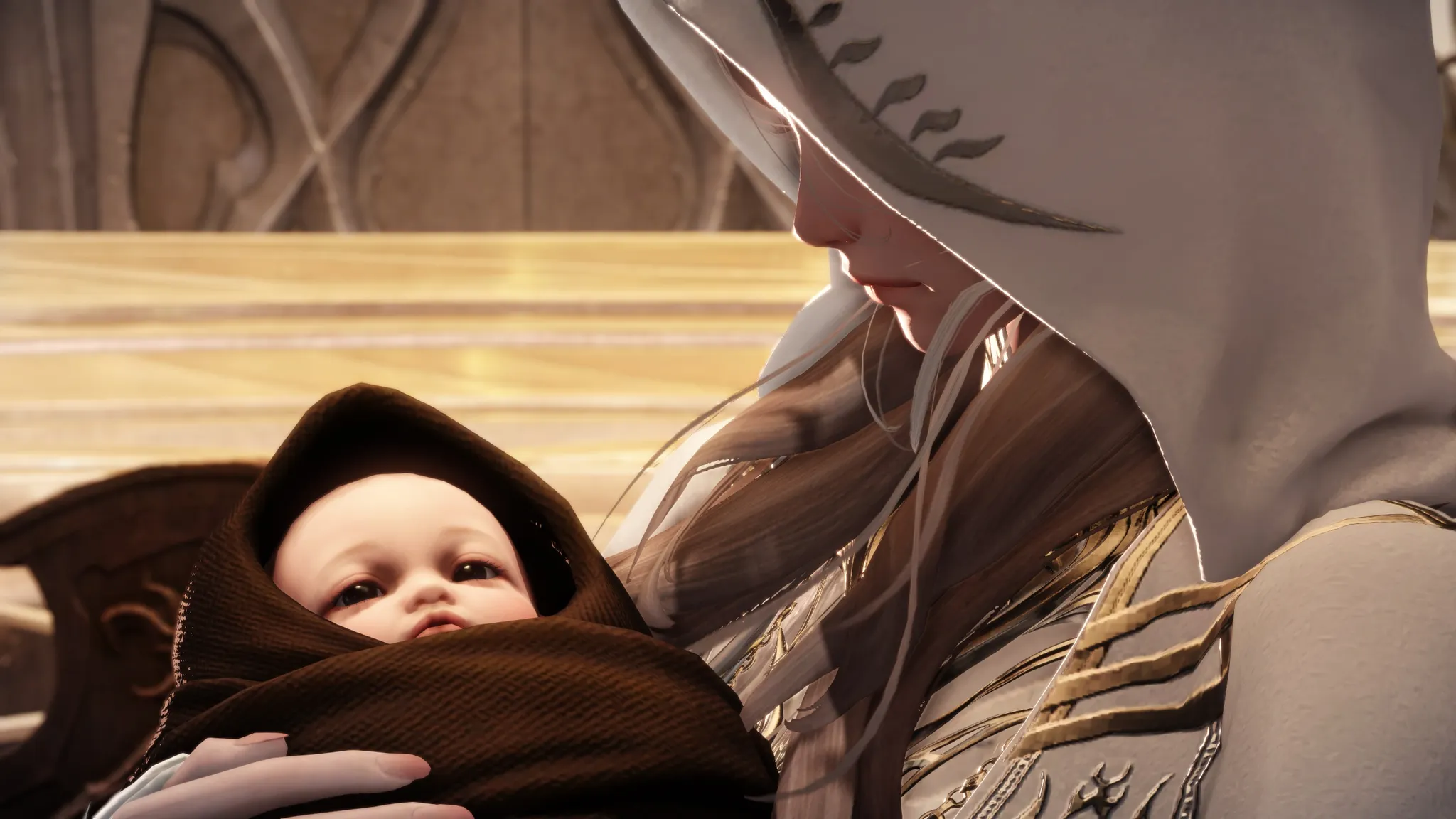 아기를 품에 안고,