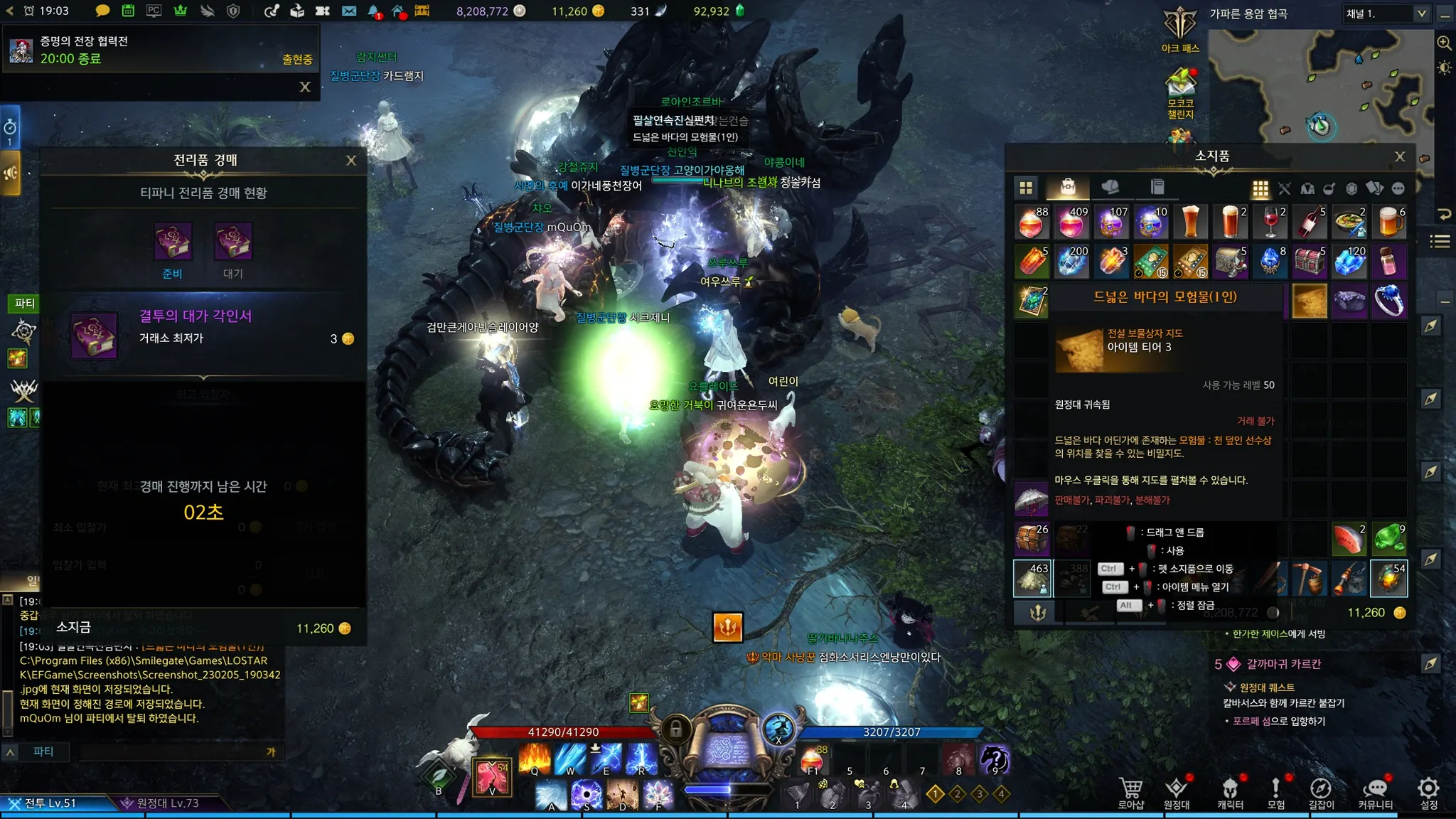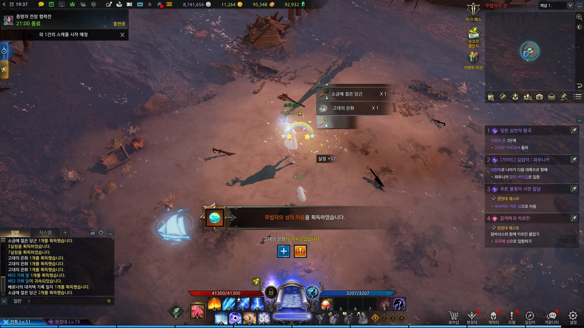 오늘의 게임기록 * 일일 에포나 : 해상낙원 페이토, 모코모코 야시장, 클럽 아비뉴 * 섬의 마음 : 무법자의 섬 * 노래 : 영혼의 레퀴엠 * 전투 Lv.51.96 * 아이템 Lv.1100