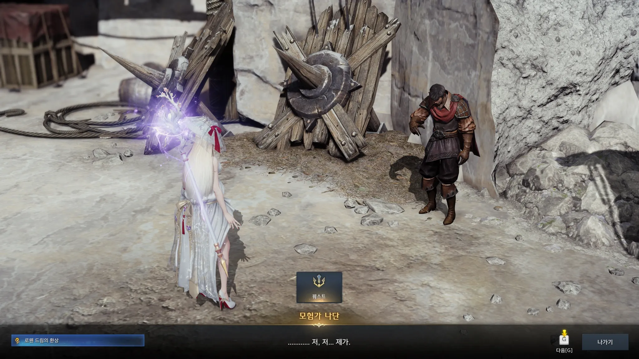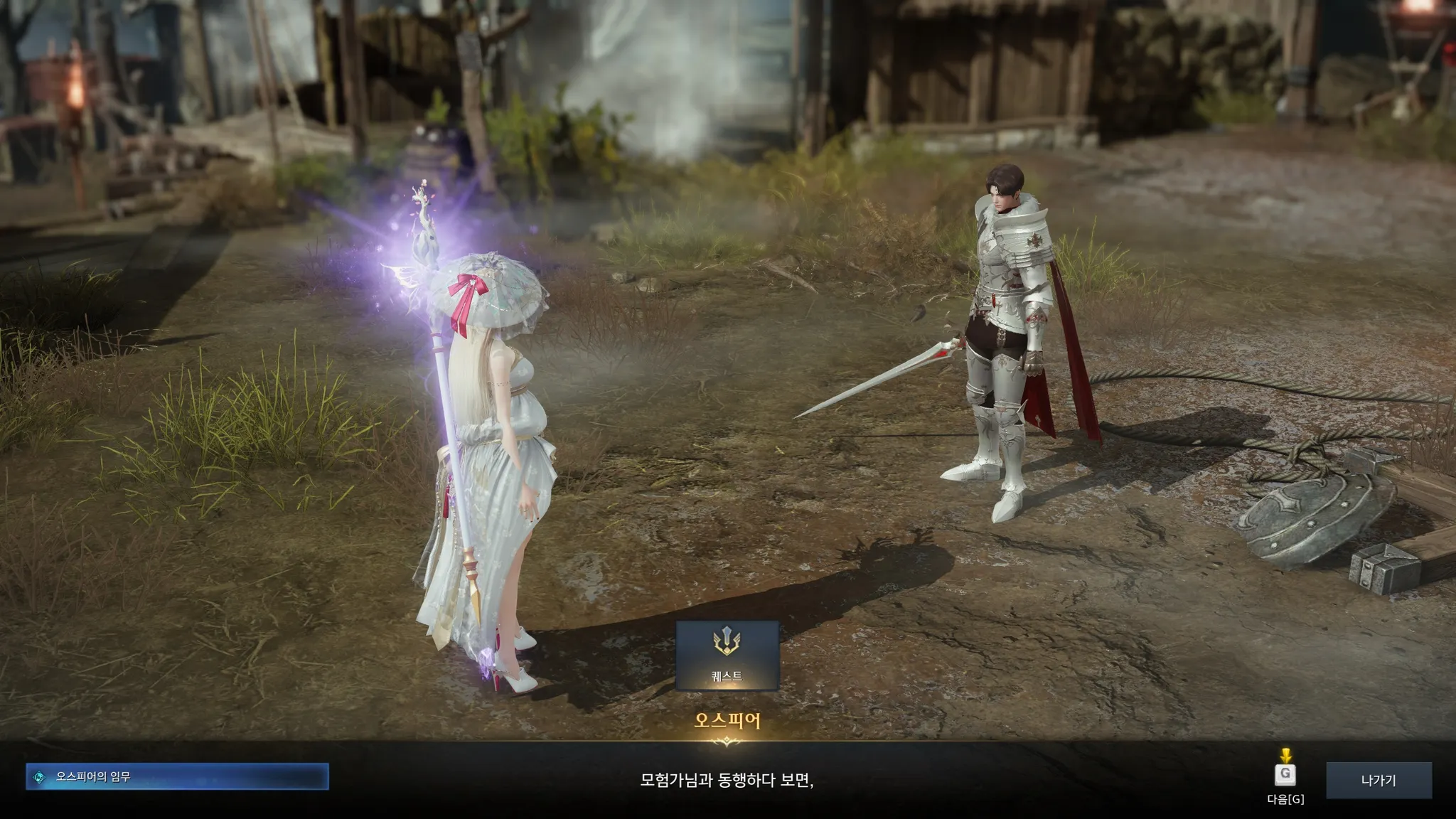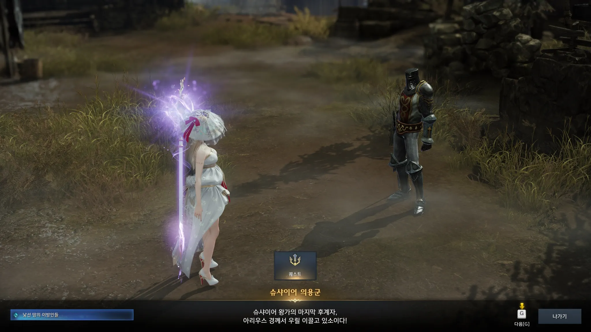 배에서 내리자마자 무기가 멋있다며 말 시키는 슈샤이어 의용군. 시리우스가 나를 여기로 보냈다는 계시가 있었다나 뭐라나? 하지만 그 옆에 누군가가 대화를 가로챘는데,