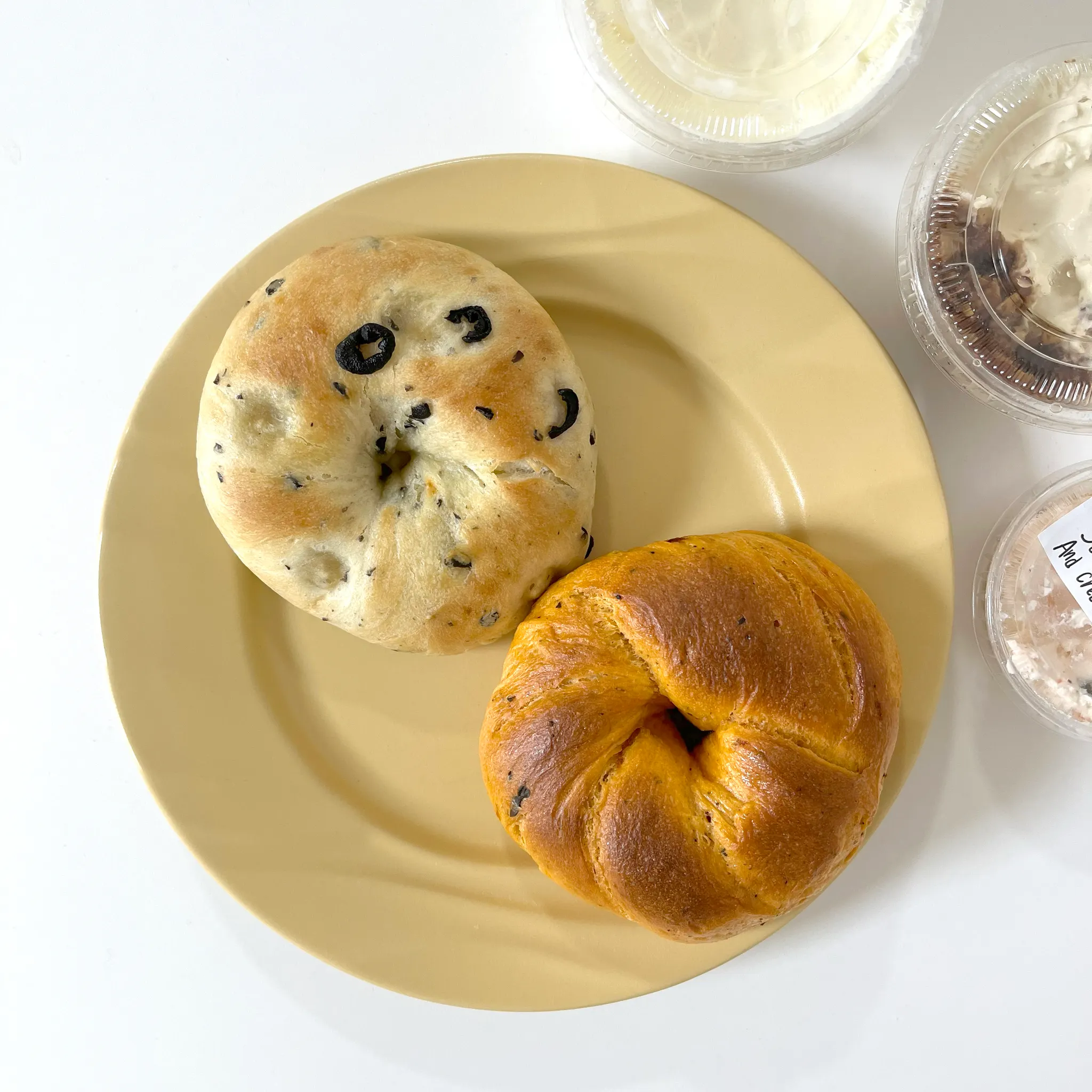 런던 베이글 뮤지엄 올리브 베이글이랑 토마토 허브 베이글.