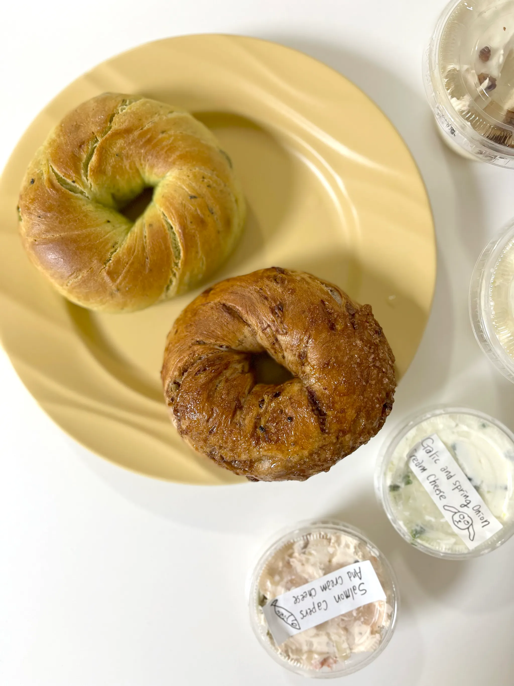 후식으로는 런던 베이글 뮤지엄에서 사왔던 바질 베이글이랑 시나몬 베이글, 그리고 크림치즈들