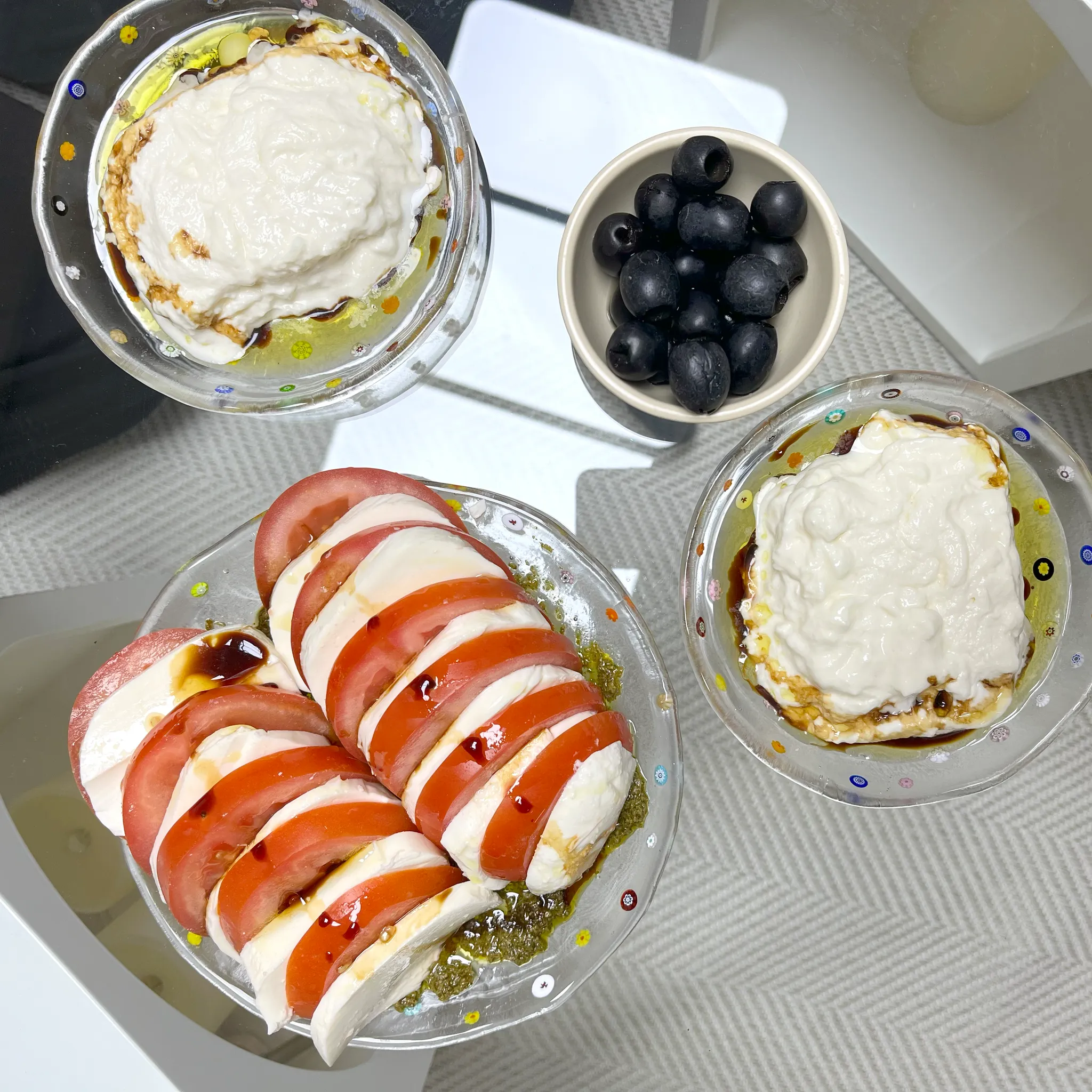 에피타이저로는 토마토 바질페스토 카프레제, 부라타 치즈, 블랙 올리브.