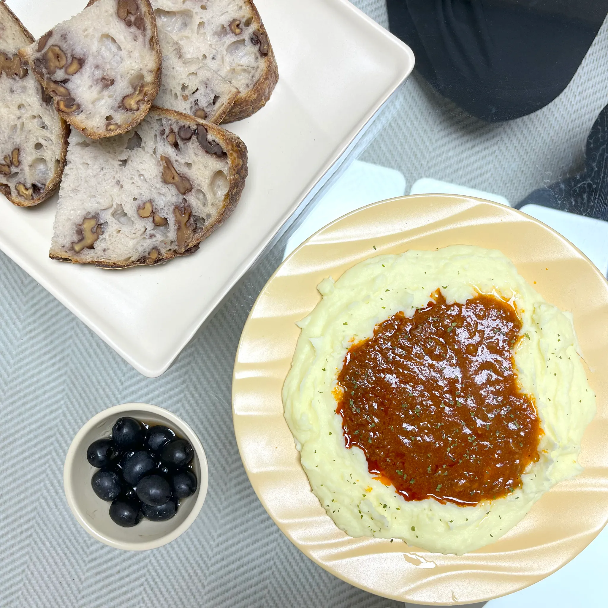 타르틴 깜빠뉴와 라구 소스를 곁들인 매쉬드 포테이토.