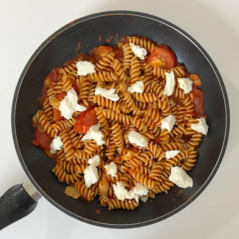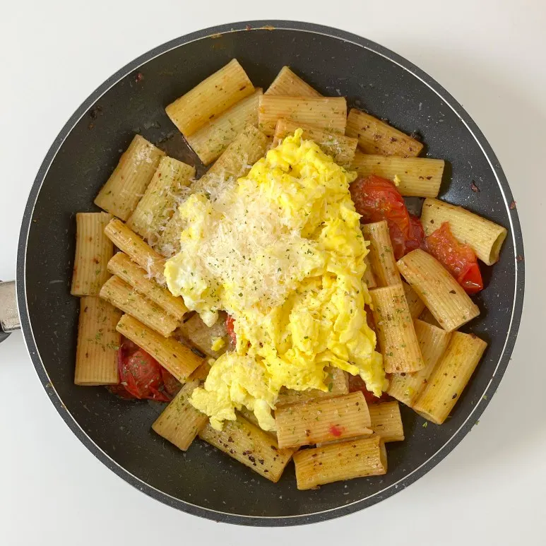 방울토마토 리가토니 파스타와 스크램블 에그.