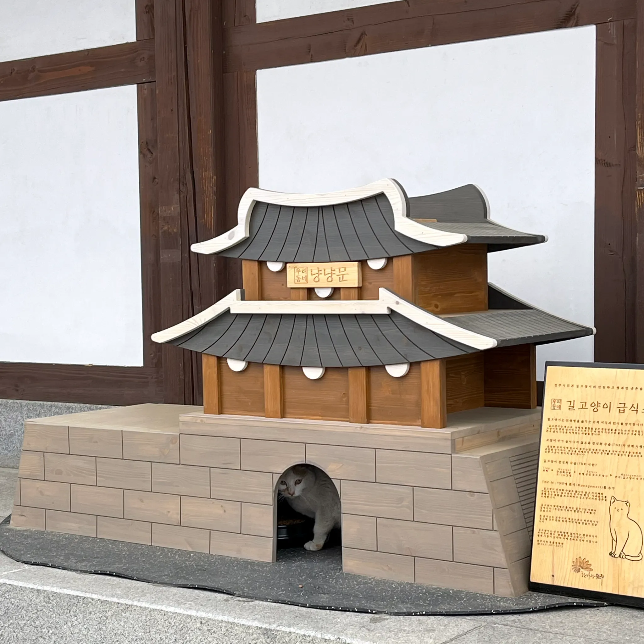 한옥마을 입구 쪽에서 만난 귀여웠던 길 고양이 급식소. 이름부터 너무 귀여워!🥹 심지어는 전주시청에서 직접 관리하는 것! 길고양이 친화적인 곳이구나 싶었다. 그리고 때마침 급식소를 방문한 애옹쓰 발견!