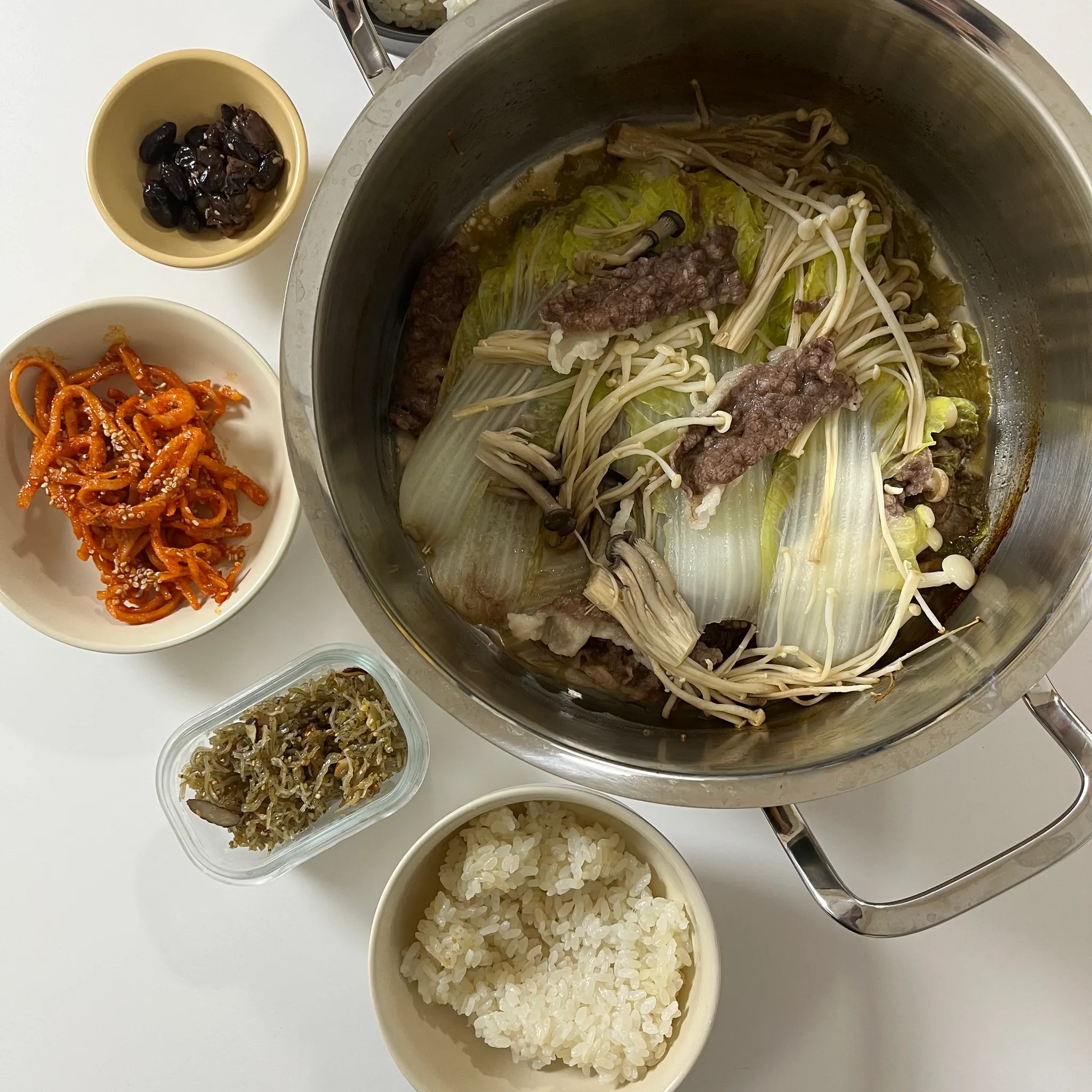 코크 작가님 오리 알배추 찜, 일명 오알찜에서 오리고기 대신 차돌박이 넣고 해봤다. 비싼만큼 더 맛있어짐ㅎㅎㅎㅎㅎㅎ 그리고 옆에 쪼로록 있는 반찬 세 개는 내가 좋아하는 시마미 작품들