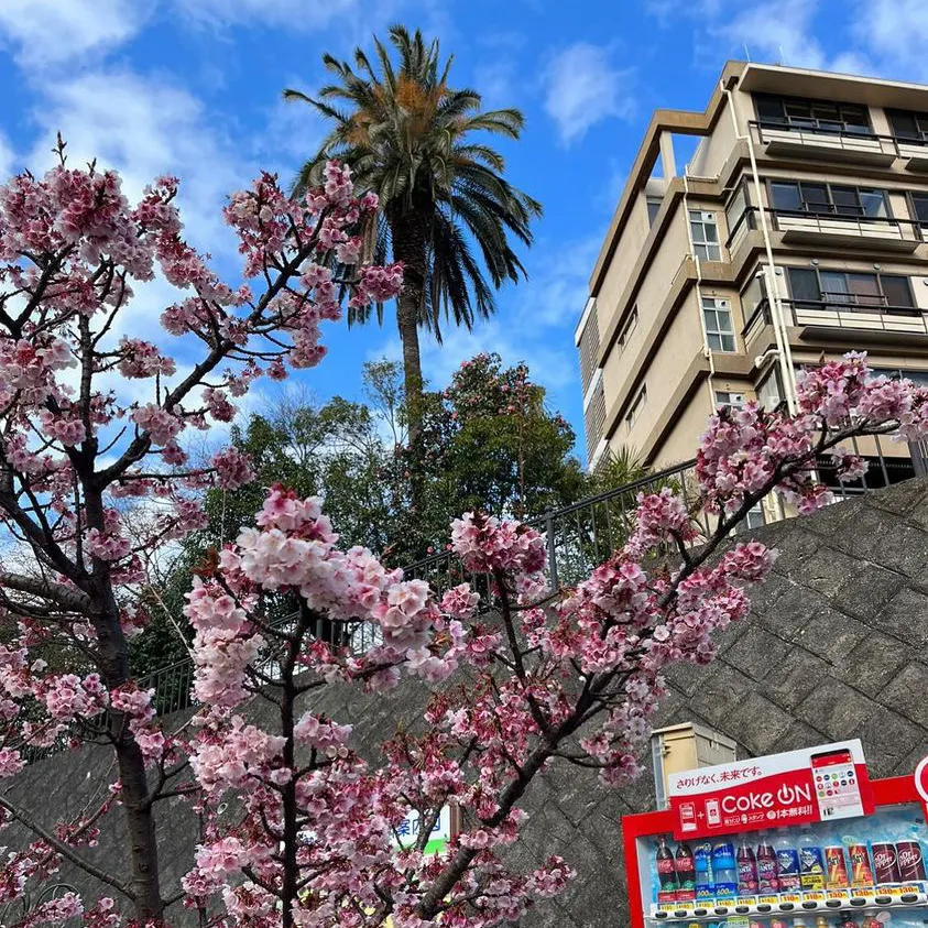 일본 여행 간 친구가 보내준 사진. 야자나무와 벚꽃이 한 자리에 있다니!!!!