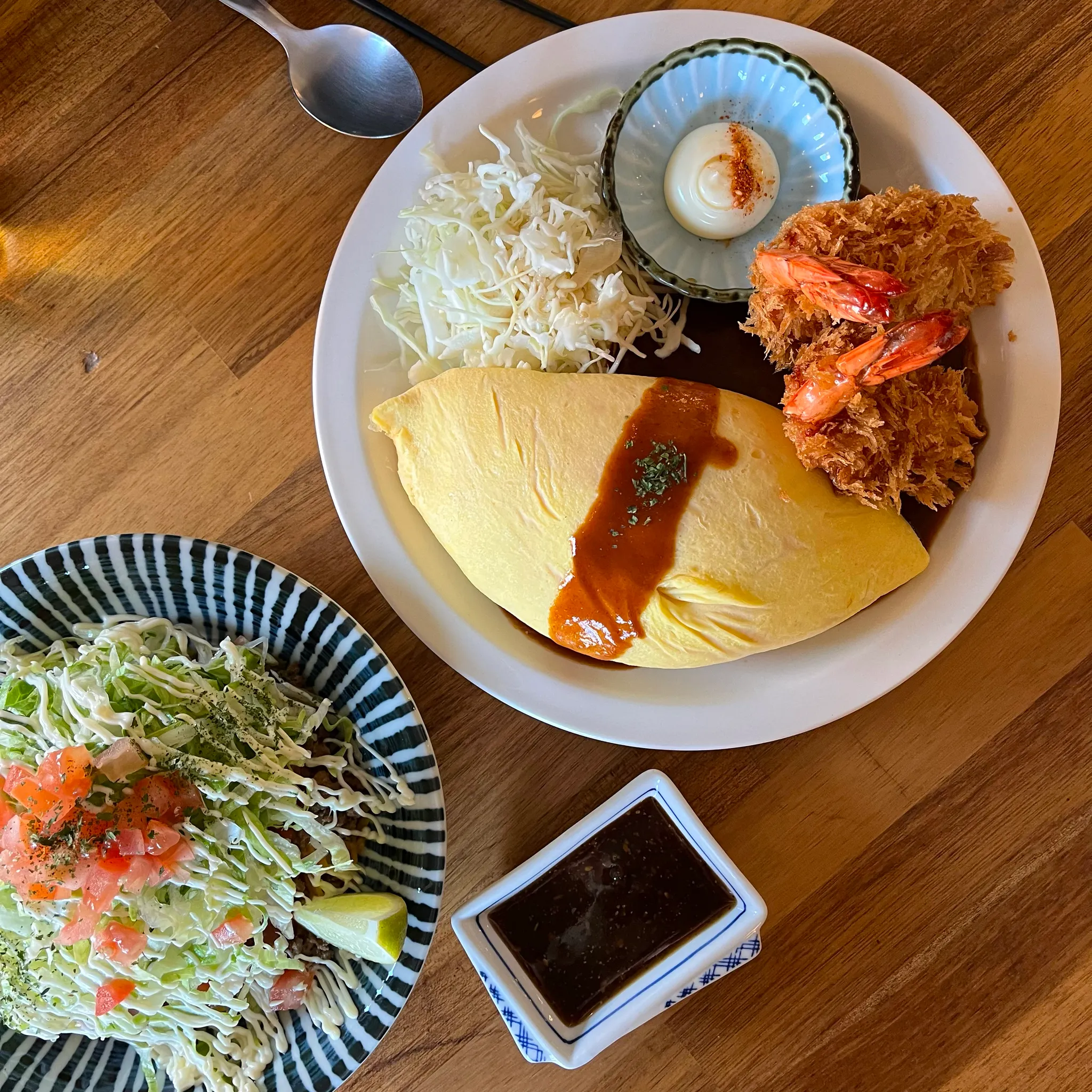 망원동 카페 나하에서 만났다. 오무 나하 + 에비후라이, 왼쪽 밑에는 타코라이스.