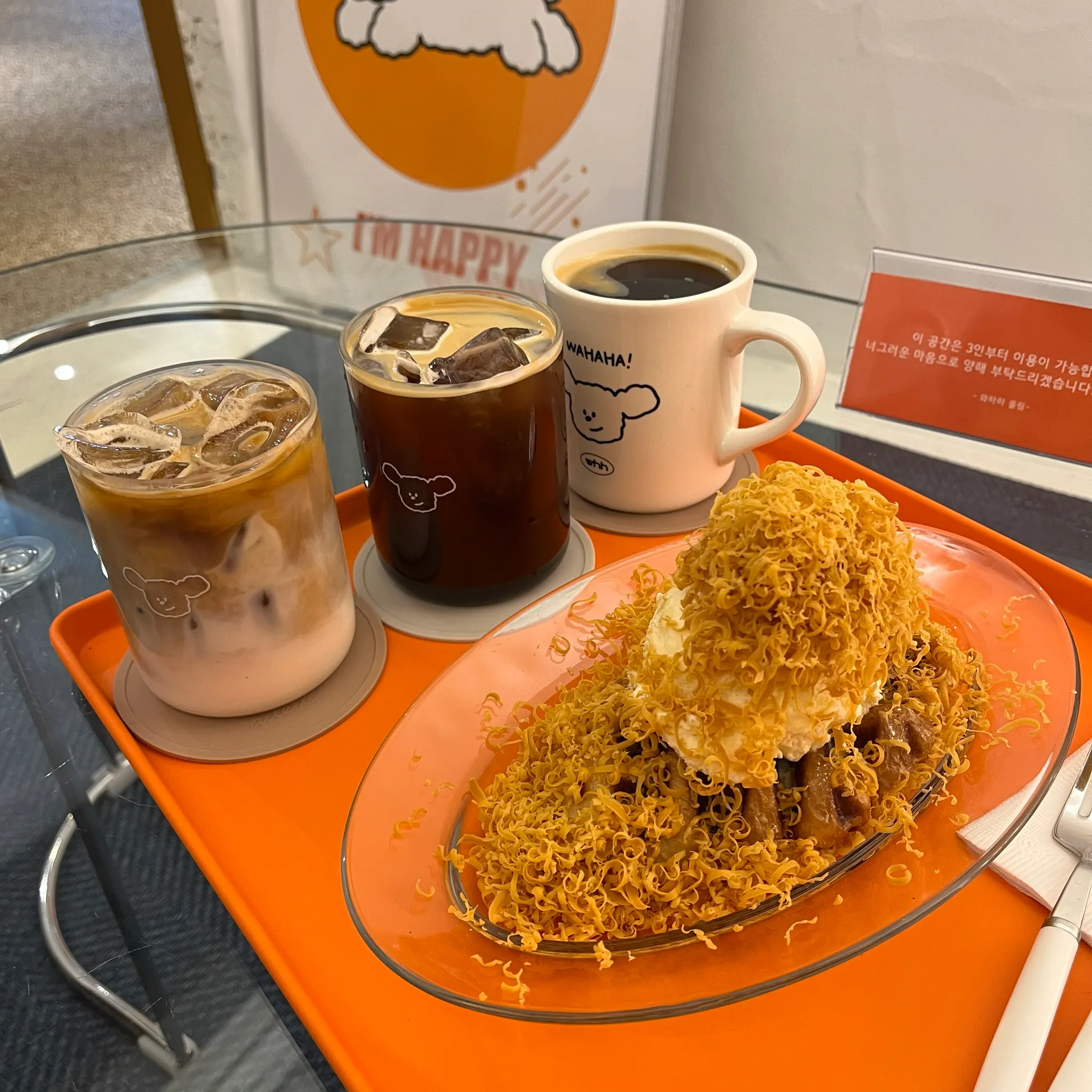 여기에서는 각 커피 한 잔씩과 치즈 크로플 얌냠 그리고 수다 파티. 여기는 강아지 로고를 가지고 있는 카페답게 애견 동반 카페인데, 너무너무 예쁜 보더콜리강쥐가 와서 눈을 떼지 못했었다. 나의 로망.. 하지만 짝꿍은 반대하는….