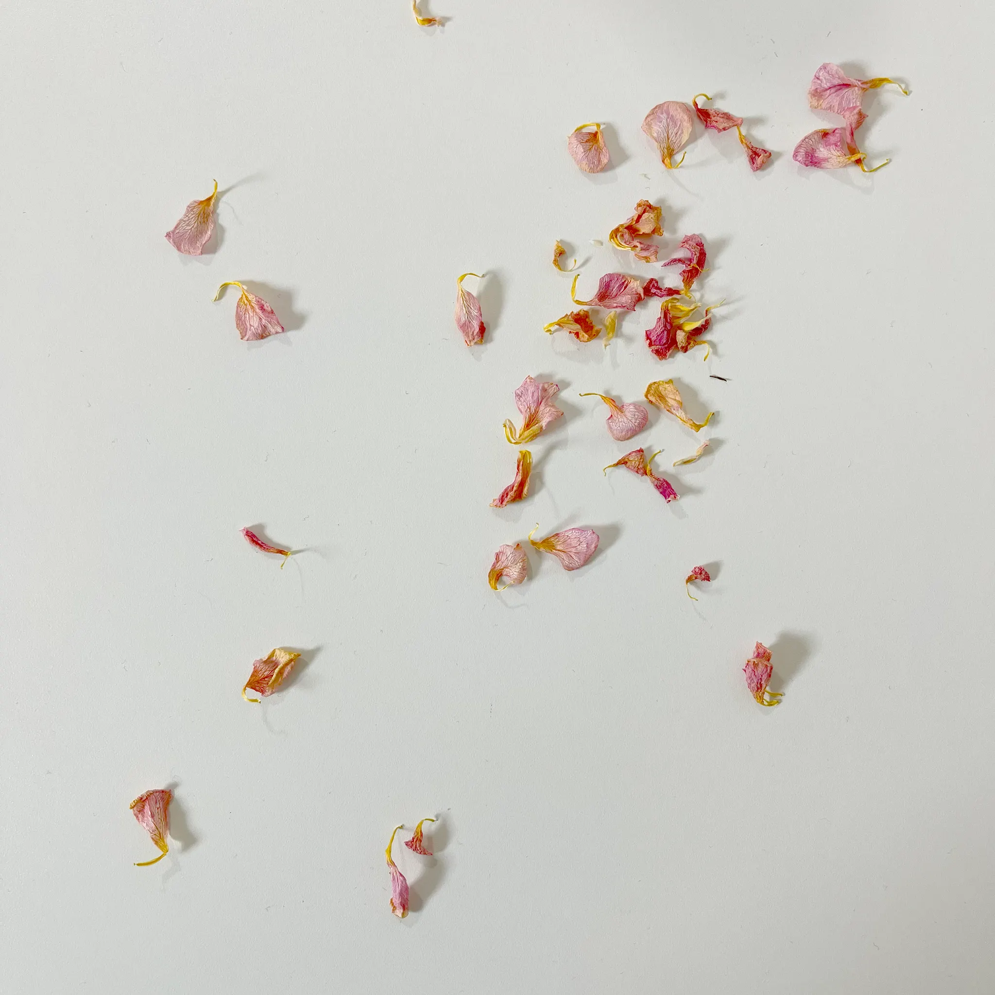 테이블에 떨어져 있는 꽃잎들이 예쁘다