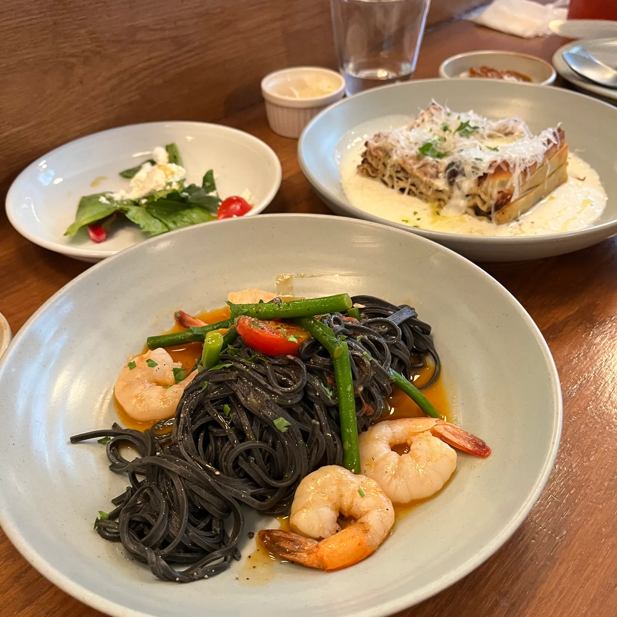 그리고 올 때마다 주문하는 새우와 비스큐 마늘쫑 먹물 딸리올리니 생면 파스타. 라자냐는 이번에는 고민하다가 몬타냐 라자냐로 주문했다. 여기 올리브 오일이 너무너무 맛있어서 짝꿍이 엄청 열심히 찾아내서 똑같이 사서 잘 먹고 있는데, 올리브 오일이 바뀌어서
