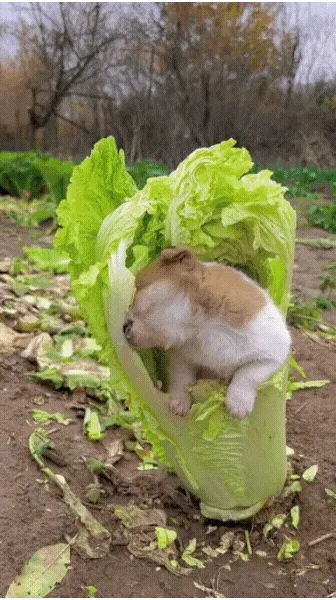 너무너무너어어어어무 귀여운 짤 발견 배추요정 얼마나 작으면 배추 안에 쏙 들어가는 걸까. 나보다 풀 잘 먹는 아기 강아지.