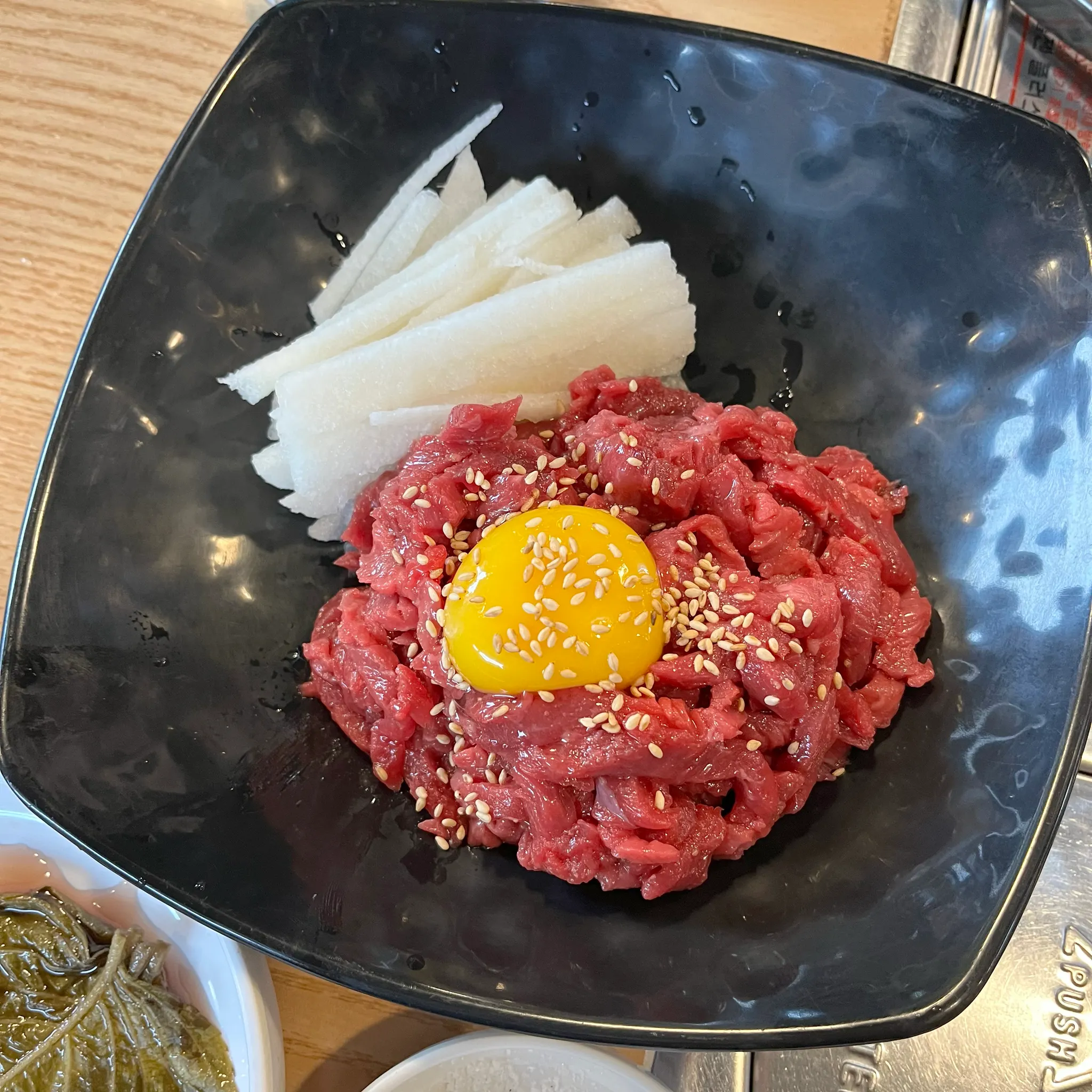 설원등심 정말,, 최고. 무슨 스테이크 먹는 줄🥹 소금 살짝 찍어 먹으면 환상 맛! 다음 번에 또 오게 된다면 설원등심이랑 육회만 주문하기로 약속했을만큼 맛있었던 고기.