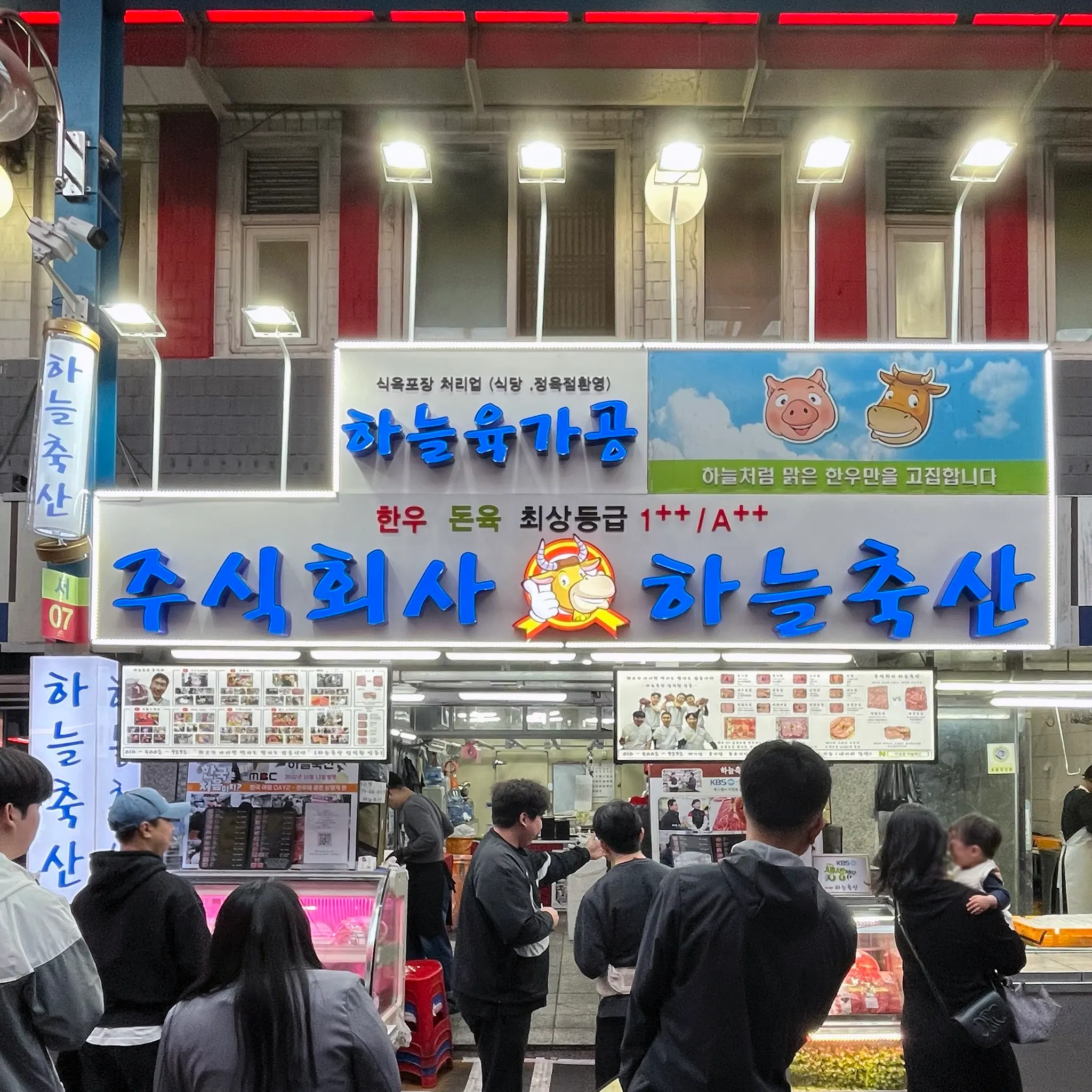 짝꿍이 횟집에서처럼 고기 사서 바로 구워먹어보기 해보고 싶다고 해서 고기집 물색 중. 하늘축산이라는 곳이 사람이 제일 많아보여서 우리도 기웃기웃하다가 직원분한테 픽 당했다ㅎㅎㅎㅎ 방송이나 유튜브에도 꽤 많이 나온 곳인듯!
