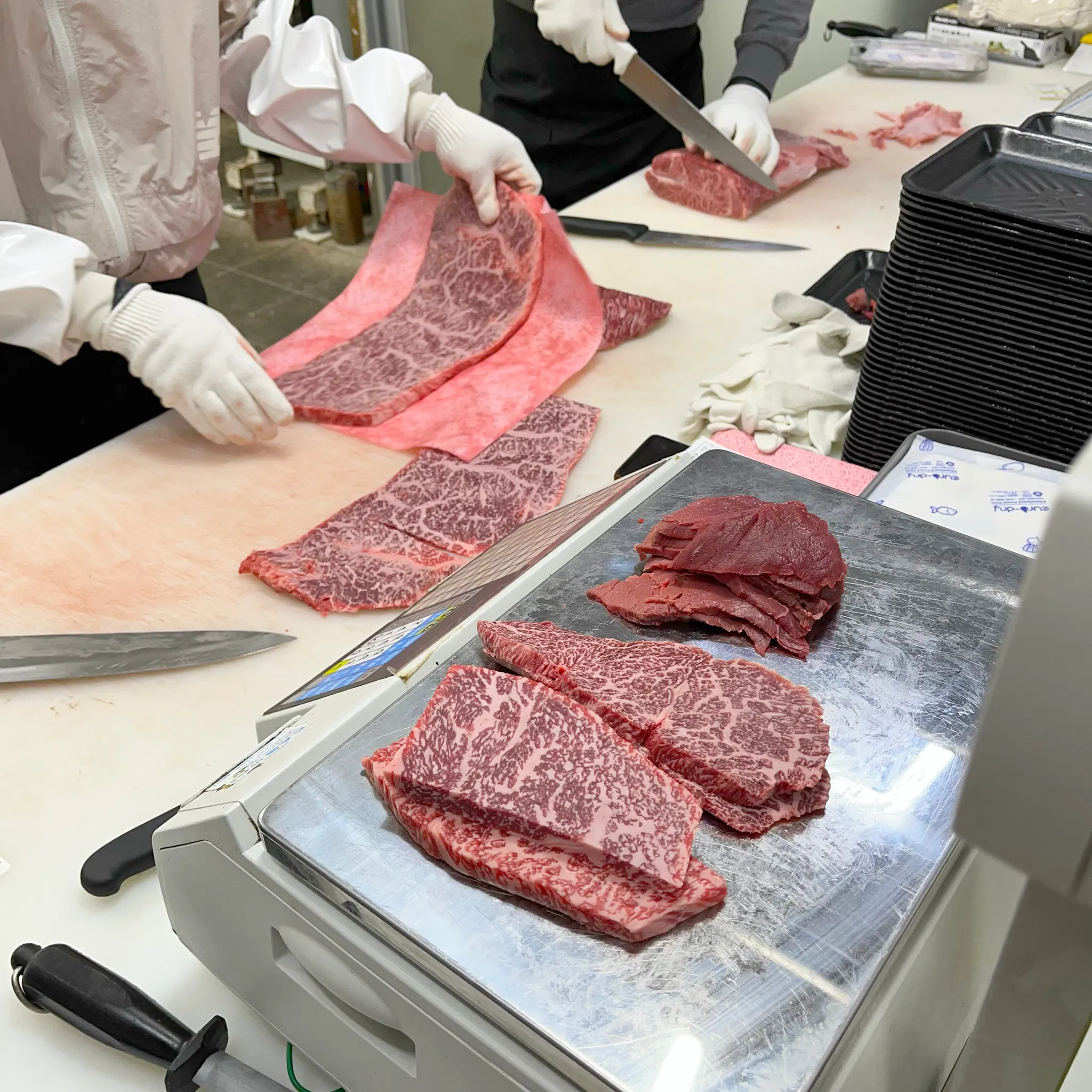 우리는 여기의 시그니처라는 설원등심 200g, 부채살 200g, 살치살 100g, 육회 200g을 주문했다 지금 쓰면서 보니 꽤 많은 양이군ㅎ 어쨌든, 고기를 직접 꺼내서 썰고 무게 다는 모습까지 눈 앞에서 보여줘서 좋았다. 깨끗한 주방을 보니 신뢰도도 1up.