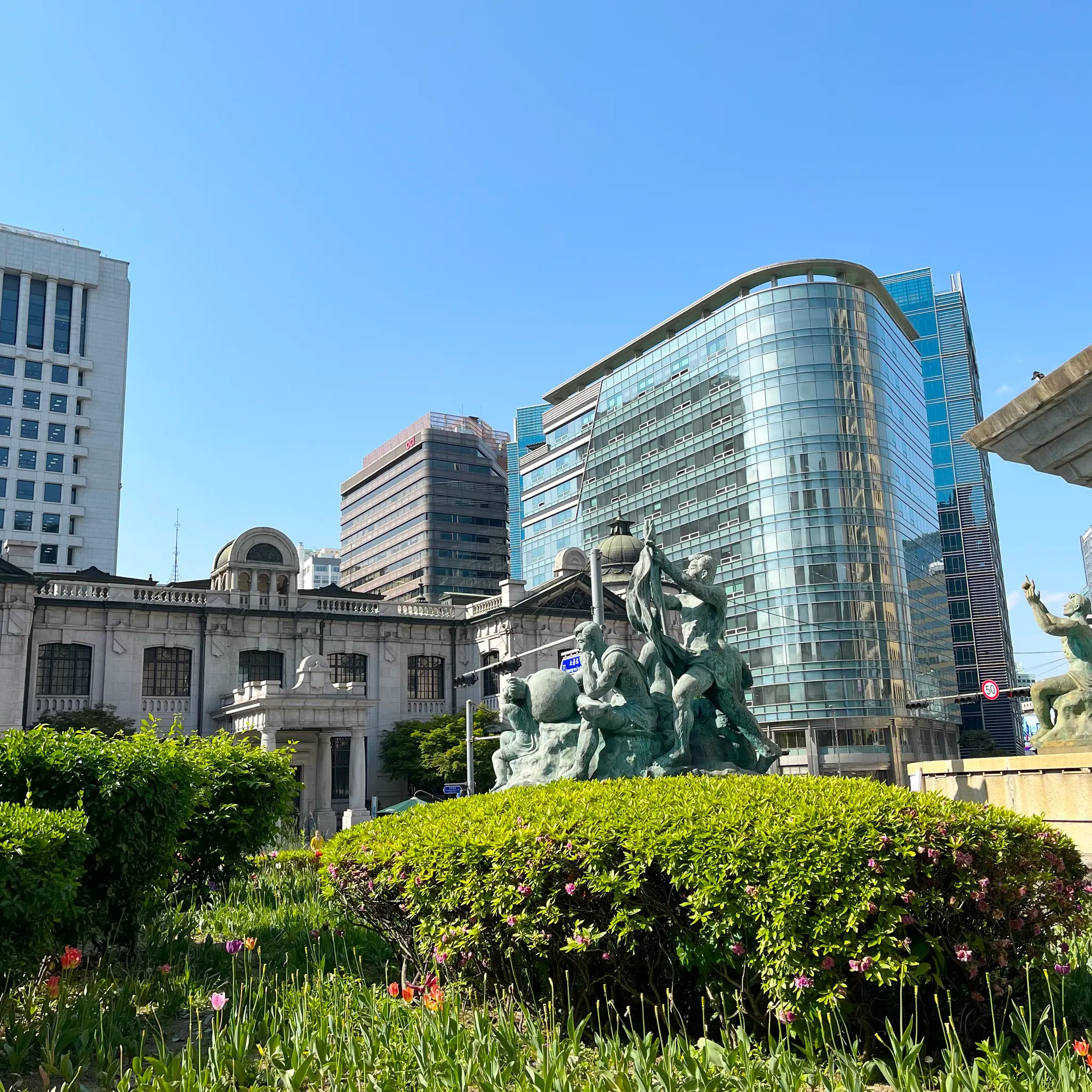 명동에서 만나는 유럽 느낌쓰. 신세계 본점 앞 분수대와 뒤에 보이는 한국은행 건물이 꼭 유럽같다. 유럽 가고 싶다
