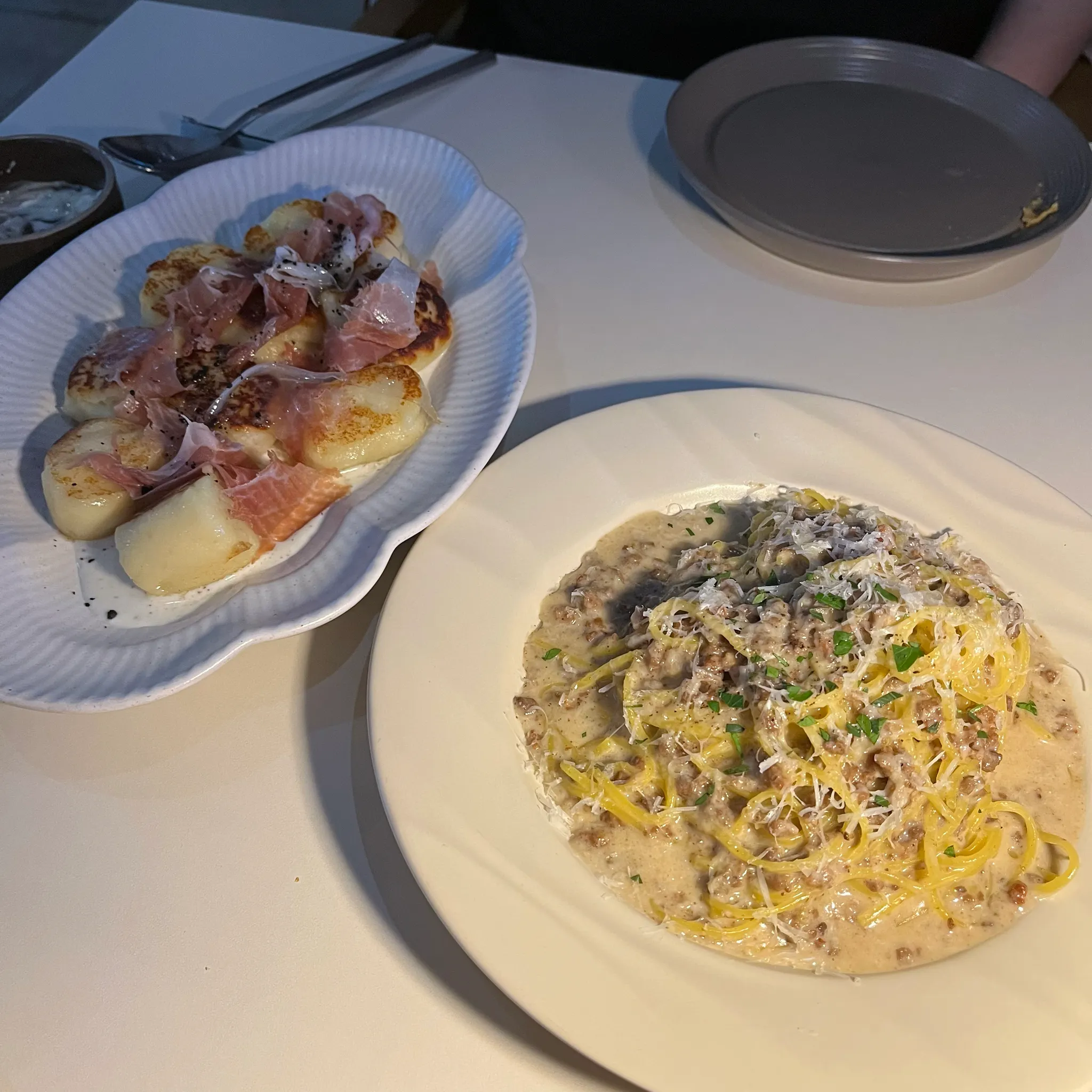 더 이탈리안 클럽. 에피타이저로 주문한 오징어 튀김 Calamari fritti 순삭하고 바로 이어서 나온 뇨끼 Gnocchi al tartufo, 그리고 라구 파스타 Ragu bianco. 네이버 리뷰에서 후기 좋아 보이는 메뉴들로만 주문했는데 나름 성공한듯! 뇨끼 정말 쫀득쫀득하니 맛있었고 트러플 향이 은은하게 나서 더 좋았다. 그리고 파스타 소스는 꼬냑을 넣은 화이트 라구 소스라는데, 처음에는 음,,?했지만 먹을 수록 맛있어지는 맛. 생면이라서 면이 정말 굿굿이었음