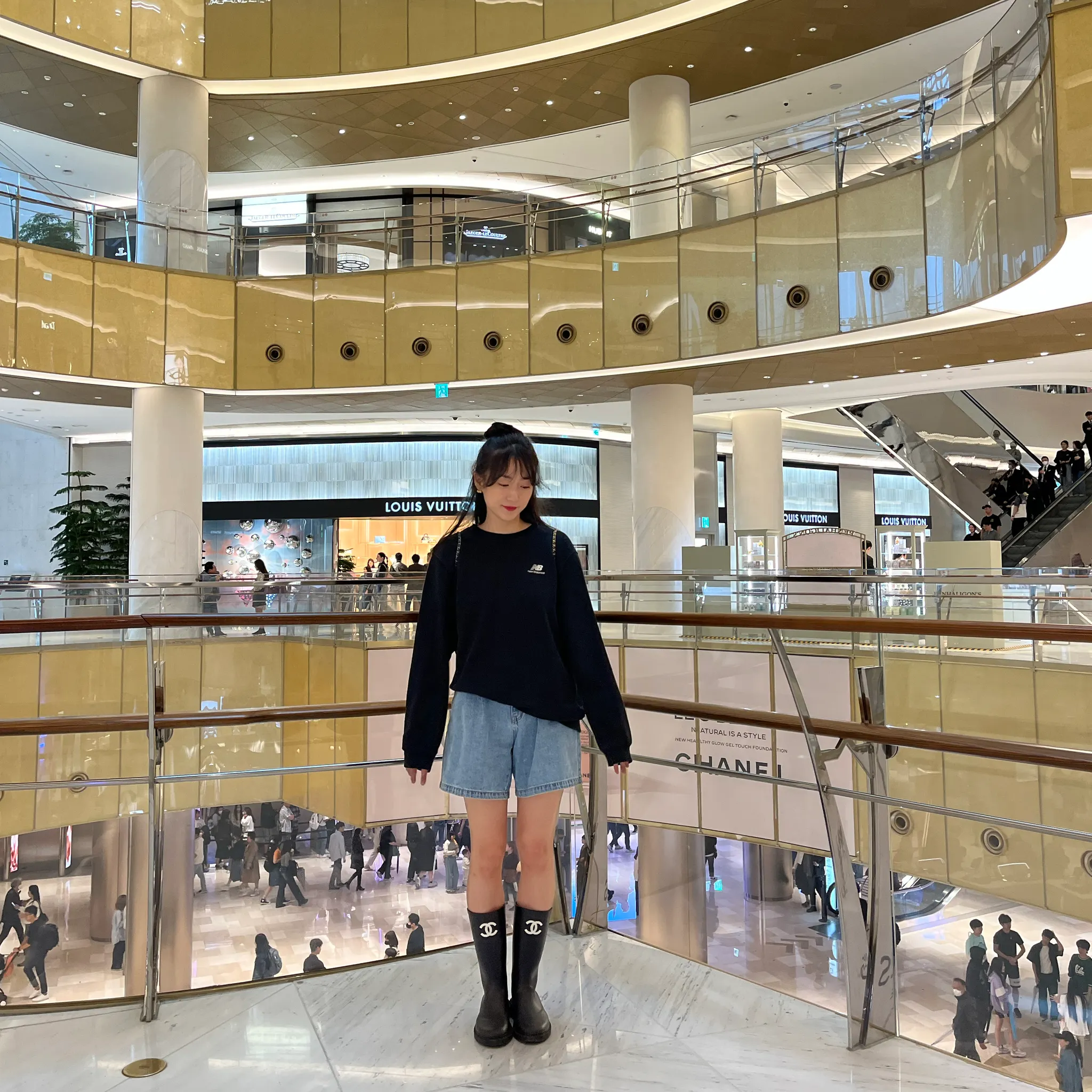 상의 : 뉴발란스 맨투맨  하의 : 그루밍 에브리웨어 Morre shorts  신발 : 샤넬 러버부츠