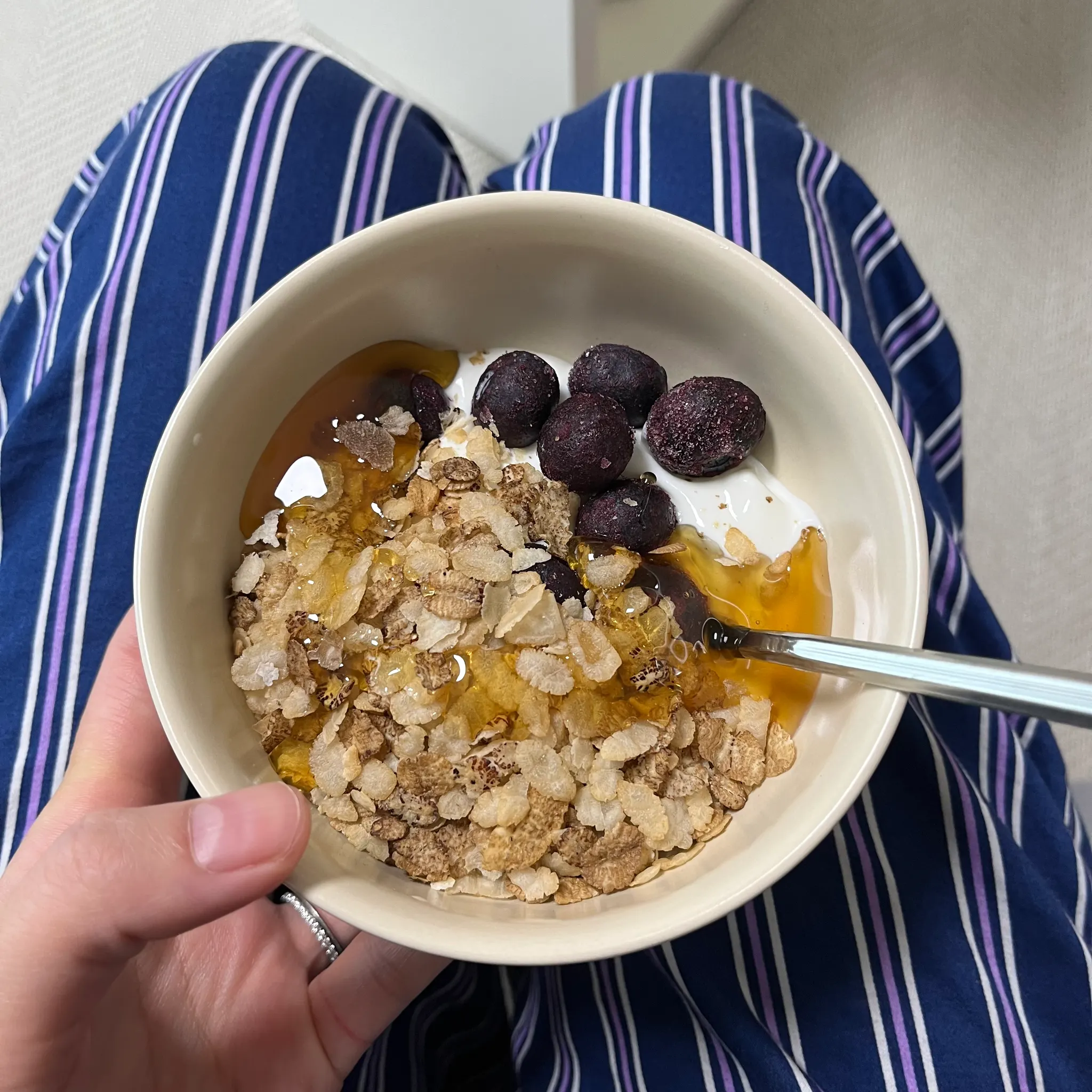 다음 날 간단하게 먹은 점심. 코크작가님 공구로 사 본 해피갓 시리얼. 무설탕 비건 시리얼이라는데 단 맛이 나지 않는 건강한 맛이라 꿀을 왕창 넣었다 그리고 냉동실에 있던 블루베리까지! 이 날 여우툰 첫 업로드를 했기 때문에 나에게는 상당히 기념비적인 날이 아닐 수가 없는 날! 여우툰 부디 많관부